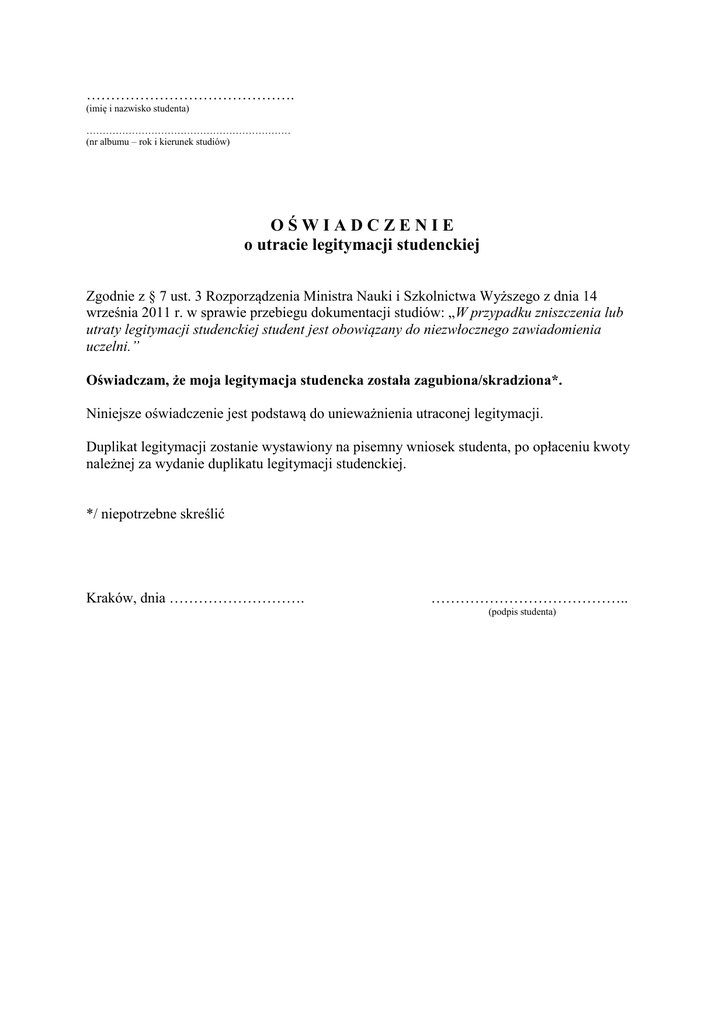 ……………………………………. (imię i nazwisko studenta) ……………………………………………………… (nr albumu – rok i kierunek studiów) OŚWIADCZENIE o utracie legitymacji studenckiej Zgodnie z § 7 ust. 3 Rozporządzenia Ministra Nauki i Szkolnictwa Wyższego z dnia 14 września 2011 r. w sprawie przebiegu dokumentacji studiów: „W przypadku zniszczenia lub utraty legitymacji studenckiej student jest obowiązany do niezwłocznego zawiadomienia uczelni.” Oświadczam, że moja legitymacja studencka została zagubiona/skradziona*. Niniejsze oświadczenie jest podstawą do unieważnienia utraconej legitymacji. Duplikat legitymacji zostanie wystawiony na pisemny wniosek studenta, po opłaceniu kwoty należnej za wydanie duplikatu legitymacji studenckiej. */ niepotrzebne skreślić Kraków, dnia ………………………. ………………………………….. (podpis studenta)