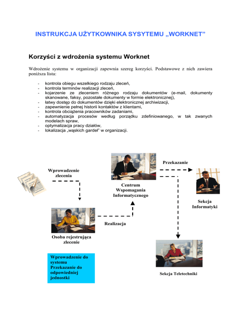 INSTRUKCJA UśYTKOWNIKA SYSYTEMU „WORKNET” Korzyści z wdroŜenia systemu Worknet WdroŜenie systemu w organizacji zapewnia szereg korzyści. Podstawowe z nich zawiera poniŜsza lista: - kontrola obiegu wszelkiego rodzaju zleceń, kontrola terminów realizacji zleceń, kojarzenie ze zleceniem róŜnego rodzaju dokumentów (e-mail, dokumenty skanowane, faksy, pozostałe dokumenty w formie elektronicznej), łatwy dostęp do dokumentów dzięki elektronicznej archiwizacji, zapewnienie pełnej historii kontaktów z klientami, kontrola obciąŜenia pracowników zadaniami, automatyzacja procesów według porządku zdefiniowanego, w tak zwanych modelach spraw, optymalizacja pracy działów, lokalizacja „wąskich gardeł” w organizacji. Przekazanie Wprowadzenie zlecenia Centrum Wspomagania Informatycznego Sekcja Informatyki Realizacja Osoba rejestrująca zlecenie Wprowadzenie do systemu Przekazanie do odpowiedniej jednostki Sekcja Teletechniki Wprowadzanie zleceń do systemu System umoŜliwia wprowadzanie nowych zleceń i automatyczne przekazywanie ich do odpowiednich działów, zgodnie ze zdefiniowanymi procesami. W celu rozpoczęcia pracy z systemem konieczne jest włączenie przeglądarki internetowej (np. Internet Explorer) i wpisania odpowiedniego adresu: worknet.spsk.pl Następnie konieczne jest zalogowanie do systemu, czyli wpisanie nazwiska, hasła i wybrania języka. W celu wprowadzenia nowego zlecenia wybieramy jedną z opcji, w zaleŜności od zgłaszanego problemu: Po wybraniu procesu wypełniamy formularz, zawierający pola zdefiniowane przez administratora dla danego procesu: W pole ‘Opis’ wpisujemy opis zlecenia, np. przedmiot zlecenia. W polu ‘Osoba zlecająca’ wybieramy z pomocą ikonki z prawej strony nazwisko osoby zlecającej. W polu ‘Instytucja’ wybieramy za pomocą rozwijanej listy instytucję, której dotyczy zlecenie, np. szpital. W polu ‘Miejsce powstawania kosztów’ wybieramy z listy właściwy ośrodek powstawania kosztów. W pole ‘Kierownik komórki organizacyjnej’ wpisujemy imię i nazwisko kierownika komórki organizacyjnej. W pole ‘Dotyczy awarii w budynku (nr, piętro, pokój)’ wpisujemy dane budynku, w którym nastąpiła awaria. W polu ‘Priorytet’ wybieramy z listy priorytet zlecenia. W pole ‘Osoba kontaktowa’ wpisujemy osobę kontaktową. W pole ‘Telefon kontaktowy’ wpisujemy telefon kontaktowy. Z listy ‘Typ sprzętu’ odznaczamy rodzaj sprzętu, którego dotyczy awaria. W pole ‘Inne’ wpisujemy inny rodzaj sprzętu, (nie uwzględniony na liście) którego dotyczy awaria. W pole ‘Numer inwentarzowy’ wpisujemy numer inwentarzowy sprzętu. Po wypełnieniu wszystkich koniecznych pól wybieramy przycisk ok. zlecenia do odpowiedniego działu. w celu wysłania Po wysłaniu zlecenia trafia ono do odpowiedniego działu. Osoba wprowadzająca zlecenie ma moŜliwość podejrzenia wprowadzonych przez siebie zleceń. W tym celu konieczne jest przejście na stronę startową systemu i wybranie odpowiedniej pozycji: Otrzymujemy listę wprowadzonych do systemu zleceń wraz z ich statusami: Zlecenia pokazane są w systemie w podziale na rodzaje spraw. Rodzaje spraw są symbolizowane przez poszczególne zakładki: Kolejne skróty oznaczają: - SA – Zgłoszenie usterek systemów alarmowych - LT – Zgłoszenie usterek telefonicznych - AS – Awaria sprzętu komputerowego - AI – Awaria inna - ZA – Zamówienia W systemie została dodatkowo zdefiniowana sprawa : - RA – Zgłoszenie rozwoju aplikacji RA Istnieje moŜliwość sortowania spraw na liście według róŜnych kryteriów: Po kliknięciu opcji ‘Data wpływu’ wszystkie zlecenia zostają posortowane w kolejności od najstarszego do najnowszego. Po zaznaczaniu opcji ‘Status’ zlecenia zostają posortowane po statusie realizacji. Istnieje takŜe moŜliwość posortowania zleceń po nadawcy. W tym celu wybieramy opcję Po zakończeniu realizacji zlecenia przez pracowników Działu Teleinformatyki w rubryce potwierdzenie realizacji zlecenia pojawi się list, który otwiera się poprzez najechanie na niego kursorem i kliknięcie. JeŜeli uŜytkownik dostarczy do Działu Teleinformatyki swój adres e-mail, potwierdzenie o zakończeniu realizacji zlecenia będzie równieŜ wysyłane drogą mailową. Pytania związane z funkcjonowaniem i wdroŜeniem powyŜszego programu prosimy kierować na adres e-mail [email protected] lub telefonicznie pod wewnętrzny nr 20-54.