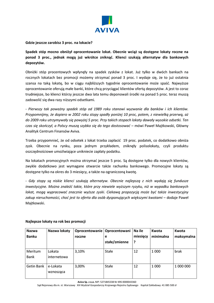 Gdzie jeszcze zarobisz 3 proc. na lokacie? Spadek stóp mocno obniżył oprocentowanie lokat. Obecnie wciąż są dostępne lokaty roczne na ponad 3 proc., jednak mogą już wkrótce zniknąć. Klienci szukają alternatyw dla bankowych depozytów. Obniżki stóp procentowych wpłynęły na spadek zysków z lokat. Już tylko w dwóch bankach na rocznych lokatach bez promocji możemy otrzymać ponad 3 proc. I wydaje się, że to już ostatnia szansa na taką lokatę, bo w ciągu najbliższych tygodnie oprocentowanie może spaść. Najwyższe oprocentowanie oferują małe banki, które chcą przyciągać klientów ofertą depozytów. A jest to coraz trudniejsze, bo klienci którzy jeszcze dwa lata temu deponowali środki na ponad 5 proc. teraz muszą zadowolić się dwa razy niższymi odsetkami. - Pierwszy tak poważny spadek stóp od 1989 roku stanowi wyzwanie dla banków i ich klientów. Przypomnijmy, że dopiero w 2002 roku stopy spadły poniżej 10 proc, potem, z niewielką przerwą, aż do 2009 roku utrzymywały się powyżej 5 proc. Przy takich stopach lokaty dawały wysokie odsetki. Ten czas się skończył, a Polscy muszą szybko się do tego dostosować – mówi Paweł Majtkowski, Główny Analityk Centrum Finansów Aviva. Trzeba przypomnieć, że od odsetek z lokat trzeba zapłacić 19 proc. podatek, co dodatkowo obniża zysk. Obecnie na rynku, poza jednym przykładem, zniknęły polisolokaty, czyli produktu oszczędnościowe umożlwiające unikniecie zapłaty podatku. Na lokatach promocyjnych można otrzymać jeszcze 5 proc. Są dostępne tylko dla nowych klientów, zwykle dodatkowo jest wymagane otwarcie także rachunku bankowego. Promocyjne lokaty są dostępne tylko na okres do 3 miesięcy, a także na ograniczoną kwotę. - Gdy stopy są niskie klienci szukają alternatyw. Obecnie najlepszą z nich wydają się fundusze inwestycyjne. Można znaleźć takie, które przy niewiele wyższym ryzyku, niż w wypadku bankowych lokat, mogą wypracować znacznie wyższe zyski. Ciekawą propozycją może być także inwestycyjny zakup nieruchomości, choć jest to oferta dla osób dysponujących większymi kwotami – dodaje Paweł Majtkowski. Najlepsze lokaty na rok bez promocji Nazwa Banku Nazwa lokaty Oprocentowanie Oprocentowani Na ile Kwota e miesięcy minimalna roczne stałe/zmienne ? Kwota maksymalna Meritum Bank Lokata internetowa 3,10% Stałe 12 1 000 brak 3,00% Stałe 12 1 000 1 000 000 Getin Bank e-Lokata wznosząca Aviva Sp. z o.o. NIP: 5271845338 Nr KRS 0000043360 Sąd Rejonowy dla m. st. Warszawy XIII Wydział Gospodarczy Krajowego Rejestru Sądowego Kapitał Zakładowy: 41 085 500 zł Idea Bank Lokata Stabilna 2,80% Stałe 12 1 000 1 000 000 Toyota Bank Lokata kapitalna 2,70% Stałe 12 5 000 brak Plus Bank Lokata internetowa 2,70% Stałe 12 1 000 brak Źródło: Centrum Finansów Aviva, dane na 26.03.2015 Najlepszej lokaty promocyjne na okres do 3 miesięcy* Nazwa Banku Nazwa lokaty Deutsch db Lok@ta e Bank Oprocento wanie Na ile Oprocentow stałe/zmien miesięc anie roczne ne y? Kwota minimalna Kwota maksymal na 5,00% Stałe 2 2 000 10 000 Warunki promocji tylko dla nowych klientów, którzy założą konto Meritum Bank Lokata Start 4,50% Stałe 2 1 000 10 000 tylko dla nowych klientów, którzy założą konto Bank Smart Lokata SMART na powitanie 4,00% Stałe 2 1 000 10 000 tylko dla nowych klientów Getin Bank Lokata na start 4,00% Stałe 2 500 10 000 tylko dla nowych klientów Idea Bank Lokata Happy 4,00% Stałe 3 1 000 10 000 tylko dla nowych klientów BGŻ Optima Lokata bezkarna 20 000 tylko dla nowych klientów, którzy założą konto 4,00% Stałe 3 1 000 Źródło: Centrum Finansów Aviva, dane na 26.03.2015 *nie zawiera promocyjnej polisolokaty Gwarancja Zysku z oprocentowaniem 5,4 proc. Aviva Sp. z o.o. NIP: 5271845338 Nr KRS 0000043360 Sąd Rejonowy dla m. st. Warszawy XIII Wydział Gospodarczy Krajowego Rejestru Sądowego Kapitał Zakładowy: 41 085 500 zł