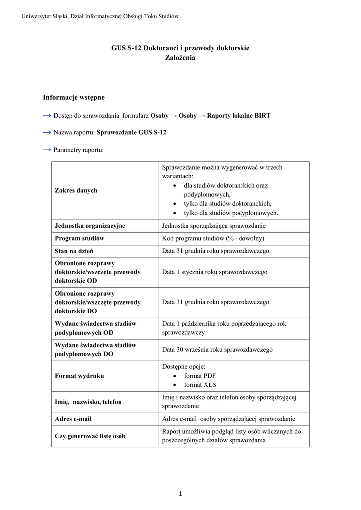 Uniwersytet Śląski, Dział Informatycznej Obsługi Toku Studiów GUS S-12 Doktoranci i przewody doktorskie Założenia Informacje wstępne Dostęp do sprawozdania: formularz Osoby → Osoby → Raporty lokalne BIRT Nazwa raportu: Sprawozdanie GUS S-12 Parametry raportu: Zakres danych Sprawozdanie można wygenerować w trzech wariantach: dla studiów doktoranckich oraz podyplomowych, tylko dla studiów doktoranckich, tylko dla studiów podyplomowych. Jednostka organizacyjne Jednostka sporządzająca sprawozdanie Program studiów Kod programu studiów (% - dowolny) Stan na dzień Data 31 grudnia roku sprawozdawczego Obronione rozprawy doktorskie/wszczęte przewody doktorskie OD Data 1 stycznia roku sprawozdawczego Obronione rozprawy doktorskie/wszczęte przewody doktorskie DO Data 31 grudnia roku sprawozdawczego Wydane świadectwa studiów podyplomowych OD Data 1 października roku poprzedzającego rok sprawozdawczy Wydane świadectwa studiów podyplomowych DO Data 30 września roku sprawozdawczego Format wydruku Dostępne opcje: format PDF format XLS Imię, nazwisko, telefon Imię i nazwisko oraz telefon osoby sporządzającej sprawozdanie Adres e-mail Adres e-mail osoby sporządzającej sprawozdanie Czy generować listę osób Raport umożliwia podgląd listy osób wliczanych do poszczególnych działów sprawozdania 1 Uniwersytet Śląski, Dział Informatycznej Obsługi Toku Studiów Szczegółowy zakres danych generowanych na potrzeby sprawozdania GUS S-12 w poszczególnych częściach sprawozdania dotyczących studiów doktoranckich i przewodów doktorskich. Dział 3. Doktoraty – poza studiami doktoranckimi (łącznie z cudzoziemcami) Poprzez doktorat poza studiami rozumiemy osobę z otwartym na dzień 31 grudnia roku sprawozdawczego przewodem doktorskim, niebędącą na dzień wszczęcia przewodu aktywnym uczestnikiem studiów doktoranckich prowadzonych w dziedzinie przewodu doktorskiego przez jednostkę, w której przewód został wszczęty. Dziedziny i dyscypliny generowane są na podstawie dyscypliny przewodu doktorskiego. 3 Osoby doktoryzujące się (mające wszczęte przewody doktorskie) poza studiami doktoranckimi [kolumny 2 – 5]: Wykazywane są wszystkie osoby posiadające w USOS (na dzień 31 grudnia roku sprawozdawczego) wszczęty przewód doktorski z datą otwarcia przewodu mniejszą bądź równą 31 grudnia roku sprawozdawczego. Osoby, które wszczęły przewody doktorskie w danym roku kalendarzowym [kolumny 6 – 9]: Wykazywane są wszystkie osoby z wprowadzonym w USOS przewodem doktorskim, z datą wszczęcia przewodu nie wcześniejszą, niż 1 stycznia roku sprawozdawczego i nie późniejszą, niż 31 grudnia roku sprawozdawczego. D Z I A Ł Osoby, które obroniły rozprawę doktorską w danym roku kalendarzowym [kolumny 10 – 13] Wykazywane są wszystkie osoby z wprowadzonym w USOS przewodem doktorskim, którym nadano stopień doktora nie wcześniej, niż 1 stycznia roku sprawozdawczego i nie później, niż 31 grudnia roku sprawozdawczego oraz został w USOS nadany numer dyplomu. Dział 4. Studia doktoranckie (bez cudzoziemców) W dziale 4 (dotyczy osób posiadających obywatelstwo polskie) zestawiono dane dotyczące doktorantów aktywnych na dzień 31 grudnia roku sprawozdawczego a także informacje związane z wszczętymi oraz obronionymi rozprawami doktorskimi w danym roku kalendarzowym. Poprzez przewód doktorski wszczęty w trakcie studiów doktoranckich rozumiemy przewód z datą wszczęcia późniejszą niż data rozpoczęcia studiów doktoranckich w dziedzinie i jednostce przewodu lecz nie późniejszą, niż data ukończenia tych studiów. 4 W rubrykach dotyczących doktorantów aktywnych na dzień 31 grudnia roku sprawozdawczego [kolumny 2 5] dane prezentowane są w podziale na dziedziny i dyscypliny związane z programem studiów doktoranckich (dla studiów interdyscyplinarnych wypisujemy dziedzinę nauki oraz nazwę studiów doktoranckich). Liczba wszczętych [kolumny 6 - 7] oraz obronionych rozpraw doktorskich [kolumny 8 - 15] generowana jest w podziale na dziedziny i dyscypliny związane z przewodem. Liczba doktorantów na studiach [kolumny 2 - 5]: Poprzez osobę na studiach doktoranckich rozumiemy osobę, która jest aktywnym na dzień 31 grudnia uczestnikiem studiów III stopnia, tzn. posiada etap studiów z datą zakończenia większą bądź równą 31 grudnia roku sprawozdawczego. 2 Uniwersytet Śląski, Dział Informatycznej Obsługi Toku Studiów Liczba wszczętych przewodów doktorskich w danym roku kalendarzowym [kolumny 6 - 7]: Zaliczamy tu wszystkie osoby będące aktywnymi uczestnikami studiów III stopnia na dzień wszczęcia przewodu, wprowadzone w USOS do modułu DOKTORANCI z przypisanym kodem studiów doktoranckich, posiadające otwarty przewód doktorski z datą otwarcia przewodu mieszczącą się w przedziale 1 styczeń – 31 grudzień roku sprawozdawczego. Osoby, które obroniły rozprawę doktorską w danym roku kalendarzowym - ogółem na/po studiach [kolumny 8 - 11]: Zaliczamy tu wszystkie osoby, które wszczęły przewód w trakcie studiów doktoranckich i nadano im stopień doktora w danym roku kalendarzowym (niezależnie od tego, kiedy ukończyły studia). Osoby, które obroniły rozprawę doktorską w danym roku kalendarzowym - w tym podczas trwania studiów [kolumny 12 - 15]: Zaliczamy tu wszystkie osoby, które wszczęły przewód w trakcie studiów doktoranckich i nadano im stopień doktora w danym roku kalendarzowym, będąc na dzień nadania stopnia aktywnymi doktorantami. Dział 4a. Studia doktoranckie (łącznie z cudzoziemcami) według nazw kierunków kształcenia 4a Dział 4a prezentuje liczbę doktorantów aktywnych na dzień 31 grudnia roku sprawozdawczego a wyniki grupowane są względem klasyfikacji kierunków kształcenia ISCED-F. Dział 5. Cudzoziemcy na studiach doktoranckich 5 Dział ten zawiera dane analogiczne do działu 4, a dotyczące wyłącznie cudzoziemców. Pod pojęciem cudzoziemca rozumiemy oso