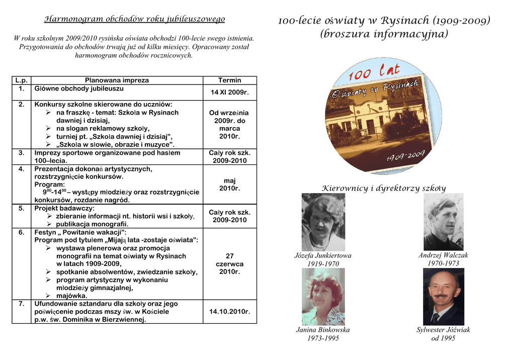 Harmonogram obchodów roku jubileuszowego W roku szkolnym 2009/2010 rysińska oświata obchodzi 100-lecie swego istnienia. Przygotowania do obchodów trwają już od kilku miesięcy. Opracowany został harmonogram obchodów rocznicowych. L.p. Planowana impreza 1. Główne obchody jubileuszu 2. 3. 4. 5. 6. 7. Konkursy szkolne skierowane do uczniów: na fraszkę - temat: Szkoła w Rysinach dawniej i dzisiaj, na slogan reklamowy szkoły, turniej pt. „Szkoła dawniej i dzisiaj”, „Szkoła w słowie, obrazie i muzyce”. Imprezy sportowe organizowane pod hasłem 100–lecia. Prezentacja dokonań artystycznych, rozstrzygnięcie konkursów. Program: 900-1400 – występy młodzieży oraz rozstrzygnięcie konkursów, rozdanie nagród. Projekt badawczy: zbieranie informacji nt. historii wsi i szkoły, publikacja monografii. Festyn „ Powitanie wakacji”: Program pod tytułem „Mijają lata -zostaje oświata”: wystawa plenerowa oraz promocja monografii na temat oświaty w Rysinach w latach 1909-2009, spotkanie absolwentów, zwiedzanie szkoły, program artystyczny w wykonaniu młodzieży gimnazjalnej, majówka. Ufundowanie sztandaru dla szkoły oraz jego poświęcenie podczas mszy św. w Kościele p.w. św. Dominika w Bierzwiennej. 100-lecie oświaty w Rysinach (1909-2009) (broszura informacyjna) Termin 14 XI 2009r. Od września 2009r. do marca 2010r. Cały rok szk. 2009-2010 maj 2010r. Kierownicy i dyrektorzy szkoły Cały rok szk. 2009-2010 27 czerwca 2010r. Józefa Junkiertowa 1919-1970 Andrzej Walczak 1970-1973 Janina Binkowska 1973-1995 Sylwester Jóźwiak od 1995 14.10.2010r. Nauczyciele na przestrzeni wieku: Lata 1909-1939 • • • • • • • • • • • • • • • • • • • • • • Stanisława Sowińska Stanisława Woźniak A. Czapniewska Feliks Kwieciński Jan Mochnacki Stanisława Jaworska M. Próchnicka J. Prądzyński Franciszek Błasiak Po roku 1945 Eligiusz Cieśliński ………. Janiak Władysław Marciniak Maria Bryłka (Reszka) Kazimierz Wrzesiński Antoni Głowacki Wanda Ziółkowaska (Rosińska) Ryszard Miętkiewski Przemysław Golniewicz Klemens Berdziński Jadwiga Dzięgielewska Sabina Paluszewska Jadwiga Kaźmierska ………… Pasternak Jadwiga Budniak Kazimiera Jóźwiak (Flasińska) Jadwiga Majchrowska Halina Bilińska Jadwiga Klimek Halina Jarońska Mieczysław Paluszewski Longina Zarębska • • • • • • • • • • • • • • • • • • • • • • • • • • • • • • • • • • • Teresa Stokowska (Brzezińska) Zdzisława Konopińska Andrzej Walczak Jadwiga Godlewska Alicja Walczak Janina Binkowska Alfred Binkowski Maria Miszczak Anna Gębka Wojciech Ogorzelski Bogusława Janikowska Jadwiga Kolasińska Anna Świątek Małgorzata Markiewicz Renata Szałańska Jerzy Gołębski Włodzimierz Pawłowski Zofia Trzmielewska Beata Kołuda Sławomira Kurpik Maria Sanigórska Ilona Kropidłowska Grażyna Michałkiewicz Elżbieta Dąbrowa Rafał Aulich Radosław Piłat Małgorzata Siwińska Jerzy Warszewski Ewa Stasiak Zbigniew Mójta Anita Kalinowska Anna Trawińska Marcin Molicki Urszula Gawryszewska Jagoda Gamalczyk Pracownicy na przestrzeni wieku: Pracownicy obsługi: • • • • • Janina Junkiertowa ……… Ratajczyk Maria Włodarek Jadwiga Iwańska Danuta Junkiert Pracownicy administracji: • • • • • Dorota Budynek Danuta Jóźwiak Irena Janiak Ewa Dorabiała Małgorzata Smal Zatrudnieni obecnie pracujący: Pracownicy obsługi: • Marianna Kędzierska • Danuta Czerwińska • Radosław Paluszewski Pracownicy administracji: • Wioletta Gawrysiak • Anna Konwerska Nauczyciele obecnie zatrudnieni: • • • • • • • Renata Banasiak Robert Banasiak Dorota Danielewicz Sylwester Jóźwiak Edward Kaczmarek Ewa Kołodziejczak Maria Kowalewska • • • • • • • Robert Kowalewski Iwona Łagodzińska Rafał Marcinkowski Renarda Pudło Ewa Rosiak Halina Szerwińska Jacek Zieliński