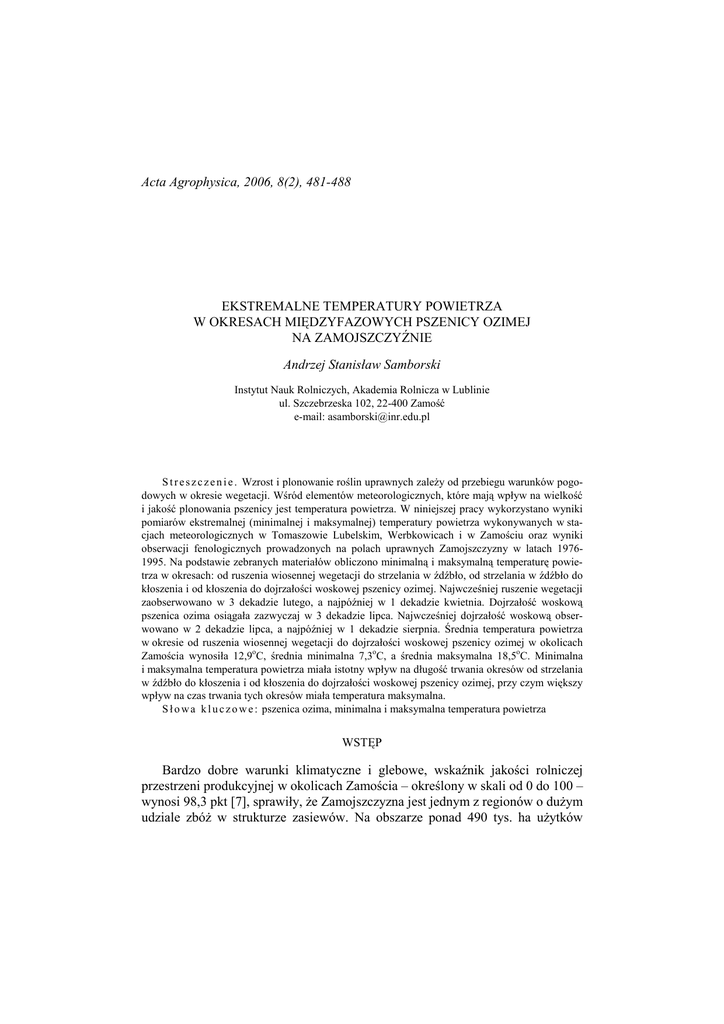 Acta Agrophysica, 2006, 8(2), 481-488 EKSTREMALNE TEMPERATURY POWIETRZA W OKRESACH MIĘDZYFAZOWYCH PSZENICY OZIMEJ NA ZAMOJSZCZYŹNIE Andrzej Stanisław Samborski Instytut Nauk Rolniczych, Akademia Rolnicza w Lublinie ul. Szczebrzeska 102, 22-400 Zamość e-mail: [email protected] S t r e s z c z e n i e . Wzrost i plonowanie roślin uprawnych zaleŜy od przebiegu warunków pogodowych w okresie wegetacji. Wśród elementów meteorologicznych, które mają wpływ na wielkość i jakość plonowania pszenicy jest temperatura powietrza. W niniejszej pracy wykorzystano wyniki pomiarów ekstremalnej (minimalnej i maksymalnej) temperatury powietrza wykonywanych w stacjach meteorologicznych w Tomaszowie Lubelskim, Werbkowicach i w Zamościu oraz wyniki obserwacji fenologicznych prowadzonych na polach uprawnych Zamojszczyzny w latach 19761995. Na podstawie zebranych materiałów obliczono minimalną i maksymalną temperaturę powietrza w okresach: od ruszenia wiosennej wegetacji do strzelania w źdźbło, od strzelania w źdźbło do kłoszenia i od kłoszenia do dojrzałości woskowej pszenicy ozimej. Najwcześniej ruszenie wegetacji zaobserwowano w 3 dekadzie lutego, a najpóźniej w 1 dekadzie kwietnia. Dojrzałość woskową pszenica ozima osiągała zazwyczaj w 3 dekadzie lipca. Najwcześniej dojrzałość woskową obserwowano w 2 dekadzie lipca, a najpóźniej w 1 dekadzie sierpnia. Średnia temperatura powietrza w okresie od ruszenia wiosennej wegetacji do dojrzałości woskowej pszenicy ozimej w okolicach Zamościa wynosiła 12,9oC, średnia minimalna 7,3oC, a średnia maksymalna 18,5oC. Minimalna i maksymalna temperatura powietrza miała istotny wpływ na długość trwania okresów od strzelania w źdźbło do kłoszenia i od kłoszenia do dojrzałości woskowej pszenicy ozimej, przy czym większy wpływ na czas trwania tych okresów miała temperatura maksymalna. S ł o w a k l u c z o w e : pszenica ozima, minimalna i maksymalna temperatura powietrza WSTĘP Bardzo dobre warunki klimatyczne i glebowe, wskaźnik jakości rolniczej przestrzeni produkcyjnej w okolicach Zamościa – określony w skali od 0 do 100 – wynosi 98,3 pkt [7], sprawiły, Ŝe Zamojszczyzna jest jednym z regionów o duŜym udziale zbóŜ w strukturze zasiewów. Na obszarze ponad 490 tys. ha uŜytków 482 A.S. SAMBORSKI rolnych 144 tys. ha przeznacza się pod uprawę pszenicy [5]. W warunkach polowych tempo wzrostu i rozwoju roślin w istotnym stopniu zaleŜy od temperatury powietrza. Korzystne warunki meteorologiczne w danym roku przyśpieszają fenofazy, a niesprzyjające wydłuŜają czas trwania okresów międzyfazowych [2,4]. Celem niniejszej pracy jest ocena wpływu zmian wartości średniej minimalnej i maksymalnej temperatury powietrza na czas trwania okresów międzyfazowych pszenicy ozimej na Zamojszczyźnie. METODY BADAŃ W pracy wykorzystano wyniki pomiarów maksymalnej i minimalnej temperatury powietrza mierzonej, na wysokości 2 m nad gruntem na stacjach meteorologicznych w Werbkowicach, Tomaszowie Lubelskim i w Zamościu, w okresie wegetacji w latach 1976-1995. Na podstawie obserwacji fenologicznych prowadzonych na polach uprawnych powiatów hrubieszowskiego, tomaszowskiego i zamojskiego, wyznaczono średnie daty ruszenia wiosennej wegetacji, strzelania w źdźbło, kłoszenia i dojrzałości woskowej pszenicy ozimej na Zamojszczyźnie, a następnie obliczono średnią minimalną i maksymalną temperaturę powietrza w okresach międzyfazowych: • I – ruszenie wiosennej wegetacji – strzelanie w źdźbło, • II – strzelanie w źdźbło – kłoszenie, • III – kłoszenie – dojrzałość woskowa. Otrzymane wartości ekstremalnej temperatury powietrza sklasyfikowano w przedziałach klasowych prawostronnie domkniętych o szerokości 2oC kaŜdy i określono częstość występowania temperatury w wyznaczonych przedziałach w okresach międzyfazowych pszenicy ozimej. Następnie określono związek pomiędzy wartością minimalnej lub maksymalnej temperatury powietrza w wyznaczonych okresach międzyfazowych pszenicy ozimej a czasem trwania tych okresów. Związek ten opisano w postaci równań: Y = a + b1 x min (1) Y = a + b2 x max (2) gdzie: Y – liczba dni w okresie międzyfazowym, a – wyraz wolny, xmin – średnia minimalna temperatura powietrza w okresie międzyfazowym, xmax – średnia maksymalna temperatura powietrza w okresie międzyfazowym, b1, b2 – współczynniki równania regresji, a następnie wyznaczono współczynniki determinacji tych równań (R2). EKSTREMALNE TEMPERATURY POWIETRZA 483 WYNIKI BADAŃ Z przeprowadzonych obserwacji fenologicznych wynika, Ŝe ruszenie wiosennej wegetacji na tym terenie najczęściej następowało na przełomie marca i kwietnia. Najwcześniej początek okresu wegetacyjnego obserwowano w 3 dekadzie lutego: w powiecie tomaszowskim w latach 1977, 1990 i 1991, w powiecie zamojskim w 1977 i 1991 roku, w powiecie hrubieszowskim w 1977 roku, a najpóźniej w 2 dekadzie kwietnia: w powiecie tomaszowskim w latach 1976, 1978, 1979, 1980, 1993 i 1995, w powiecie hrubieszowskim w 1995 roku. Strzelanie w źdźbło pszenicy ozimej przypadało najczęściej w pierwszej dekadzie maja, a kłoszenie w pierwszej dekadzie czerwca. Dojrzałość woskową pszenica ozima osiągała zazwyczaj w trzeciej dekadzie lipca. Najwcześniej dojrzałość woskową obserwowano w 2 dekadzie lipca, a najpóźniej w 1 dekadzie sierpnia. Średnia temperatura powietrza w okresie od ruszenia wiosennej wegetacji do dojrzałości woskowej pszenicy ozimej w Zamościu wynosiła 12,9oC (s = 0,7oC), średnia minimalna 7,3oC (s = 0,7oC), a średnia maksymalna 18,5oC (s = 0,8oC), w Werbkowicach odpowiednio: 13,4oC (s = 0,8oC), 8,2oC (s = 0,6oC) i 18,6oC (s = 0,7oC) i w Tomaszowie Lubelskim: 13oC (s = 0,9oC), 7,5oC (s = 0,8oC) i 18,6oC (s = 1oC). Średnia minimalna temperatura powietrza, w wyznaczonych okresach międzyfazowych, wahała się w zakresie 13,5oC (od 0,7oC w Zamościu w okresie