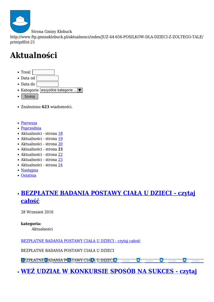 Strona Gminy Kłobuck http://www.ftp.gminaklobuck.pl/aktualnosci/index/JUZ-44-656-POSILKOW-DLA-DZIECI-Z-ZOLTEGO-TALE/ printpdf/st:21 Aktualności Treść Data od Data do Kategorie wszystkie kategorie ... ▼ Szukaj Znaleziono 623 wiadomości. Pierwsza Poprzednia Aktualności - strona 18 Aktualności - strona 19 Aktualności - strona 20 Aktualności - strona 21 Aktualności - strona 22 Aktualności - strona 23 Aktualności - strona 24 Następna Ostatnia BEZPŁATNE BADANIA POSTAWY CIAŁA U DZIECI - czytaj całość 28 Wrzesień 2016 kategoria: Aktualności BEZPŁATNE BADANIA POSTAWY CIAŁA U DZIECI - czytaj całość BEZPŁATNE BADANIA POSTAWY CIAŁA U DZIECI BEZPŁATNE BADANIA POSTAWY CIAŁA U DZIECI WEŹ UDZIAŁ W KONKURSIE SPOSÓB NA SUKCES - czytaj całość 28 Wrzesień 2016 kategoria: Aktualności WEŹ UDZIAŁ W KONKURSIE SPOSÓB NA SUKCES - czytaj całość WEŹ UDZIAŁ W KONKURSIE SPOSÓB NA SUKCES WEŹ UDZIAŁ W KONKURSIE SPOSÓB NA SUKCES BEZPŁATNE BADANIA - czytaj całość 27 Wrzesień 2016 kategoria: Aktualności BEZPŁATNE BADANIA - czytaj całość BEZPŁATNE BADANIA BEZPŁATNE BADANIA SPOTKANIE Z POSŁEM ANDRZEJEM GAWRONEM - czytaj całość 23 Wrzesień 2016 kategoria: Aktualności SPOTKANIE Z POSŁEM ANDRZEJEM GAWRONEM - czytaj całość SPOTKANIE Z POSŁEM ANDRZEJEM GAWRONEM SPOTKANIE Z POSŁEM ANDRZEJEM GAWRONEM NOWE OŚWIETLENIE HALI SPORTOWEJ - czytaj całość 23 Wrzesień 2016 kategoria: Aktualności NOWE OŚWIETLENIE HALI SPORTOWEJ - czytaj całość NOWE OŚWIETLENIE HALI SPORTOWEJ NOWE OŚWIETLENIE HALI SPORTOWEJ INFORMACJA DOT. SZCZEPIENIA LISÓW WOLNO ŻYJĄCYCH - czytaj całość 22 Wrzesień 2016 kategoria: Aktualności INFORMACJA DOT. SZCZEPIENIA LISÓW WOLNO ŻYJĄCYCH - czytaj całość INFORMACJA DOT. SZCZEPIENIA LISÓW WOLNO ŻYJĄCYCH INFORMACJA DOT. SZCZEPIENIA LISÓW WOLNO ŻYJĄCYC INFORMACJE O JAKOŚCI POWIETRZA W WOJEWÓDZTWIE ŚLĄSKIM - czytaj całość 21 Wrzesień 2016 kategoria: Aktualności INFORMACJE O JAKOŚCI POWIETRZA W WOJEWÓDZTWIE ŚLĄSKIM - czytaj całość INFORMACJE O JAKOŚCI POWIETRZA W WOJEWÓDZTWIE ŚLĄSKIM INFORMACJE O JAKOŚCI POWIETRZA W WOJEWÓDZTWIE Ś SPOTKANIA DOTYCZĄCE OPRACOWANIA STRATEGII czytaj całość 21 Wrzesień 2016 kategoria: Aktualności SPOTKANIA DOTYCZĄCE OPRACOWANIA STRATEGII - czytaj całość SPOTKANIA DOTYCZĄCE OPRACOWANIA STRATEGII SPOTKANIA DOTYCZĄCE OPRACOWANIA STRATEGII SPOTKANIE PT. "JA I RUCH ULICZNY" - czytaj całość 21 Wrzesień 2016 kategoria: Aktualności SPOTKANIE PT. "JA I RUCH ULICZNY" - czytaj całość SPOTKANIE PT. "JA I RUCH ULICZNY" SPOTKANIE PT. "JA I RUCH ULICZNY" KONKURS WIEDZY O DŁUGOSZU - czytaj całość 21 Wrzesień 2016 kategoria: Aktualności KONKURS WIEDZY O DŁUGOSZU - czytaj całość KONKURS WIEDZY O DŁUGOSZU KONKURS WIEDZY O DŁUGOSZU Pierwsza Poprzednia Aktualności - strona 18 Aktualności - strona 19 Aktualności - strona 20 Aktualności - strona 21 Aktualności - strona 22 Aktualności - strona 23 Aktualności - strona 24 Następna Ostatnia