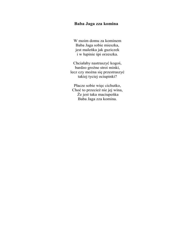 Baba Jaga zza komina W moim domu za kominem Baba Jaga sobie mieszka, jest maleńka jak guziczek i w łupinie śpi orzeszka. Chciałaby nastraszyć kogoś, bardzo groźne stroi minki, lecz czy można się przestraszyć takiej tyciej ociupinki? Płacze sobie więc cichutko, Choć to przecież nie jej wina, Że jest taka maciupeńka Baba Jaga zza komina.