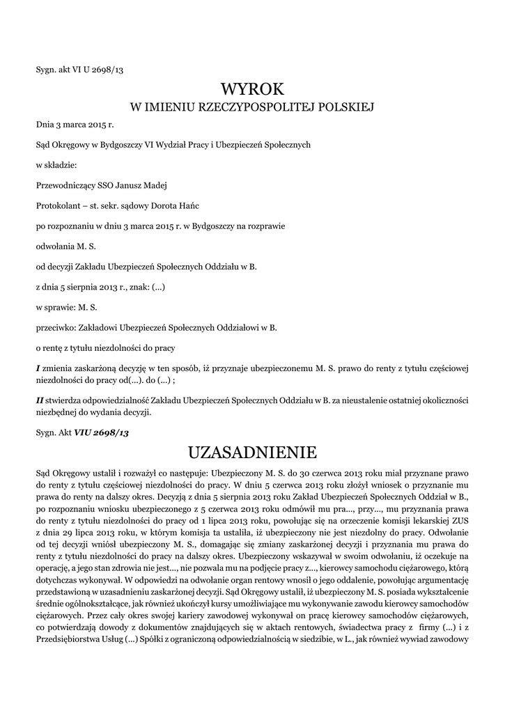 Sygn. akt VI U 2698/13 WYROK W IMIENIU RZECZYPOSPOLITEJ POLSKIEJ Dnia 3 marca 2015 r. Sąd Okręgowy w Bydgoszczy VI Wydział Pracy i Ubezpieczeń Społecznych w składzie: Przewodniczący SSO Janusz Madej Protokolant – st. sekr. sądowy Dorota Hańc po rozpoznaniu w dniu 3 marca 2015 r. w Bydgoszczy na rozprawie odwołania M. S. od decyzji Zakładu Ubezpieczeń Społecznych Oddziału w B. z dnia 5 sierpnia 2013 r., znak: (...) w sprawie: M. S. przeciwko: Zakładowi Ubezpieczeń Społecznych Oddziałowi w B. o rentę z tytułu niezdolności do pracy I zmienia zaskarżoną decyzję w ten sposób, iż przyznaje ubezpieczonemu M. S. prawo do renty z tytułu częściowej niezdolności do pracy od(...). do (...) ; II stwierdza odpowiedzialność Zakładu Ubezpieczeń Społecznych Oddziału w B. za nieustalenie ostatniej okoliczności niezbędnej do wydania decyzji. Sygn. Akt VIU 2698/13 UZASADNIENIE Sąd Okręgowy ustalił i rozważył co następuje: Ubezpieczony M. S. do 30 czerwca 2013 roku miał przyznane prawo do renty z tytułu częściowej niezdolności do pracy. W dniu 5 czerwca 2013 roku złożył wniosek o przyznanie mu prawa do renty na dalszy okres. Decyzją z dnia 5 sierpnia 2013 roku Zakład Ubezpieczeń Społecznych Oddział w B., po rozpoznaniu wniosku ubezpieczonego z 5 czerwca 2013 roku odmówił mu pra..., przy..., mu przyznania prawa do renty z tytułu niezdolności do pracy od 1 lipca 2013 roku, powołując się na orzeczenie komisji lekarskiej ZUS z dnia 29 lipca 2013 roku, w którym komisja ta ustaliła, iż ubezpieczony nie jest niezdolny do pracy. Odwołanie od tej decyzji wniósł ubezpieczony M. S., domagając się zmiany zaskarżonej decyzji i przyznania mu prawa do renty z tytułu niezdolności do pracy na dalszy okres. Ubezpieczony wskazywał w swoim odwołaniu, iż oczekuje na operację, a jego stan zdrowia nie jest..., nie pozwala mu na podjęcie pracy z..., kierowcy samochodu ciężarowego, którą dotychczas wykonywał. W odpowiedzi na odwołanie organ rentowy wnosił o jego oddalenie, powołując argumentację przedstawioną w uzasadnieniu zaskarżonej decyzji. Sąd Okręgowy ustalił, iż ubezpieczony M. S. posiada wykształcenie średnie ogólnokształcące, jak również ukończył kursy umożliwiające mu wykonywanie zawodu kierowcy samochodów ciężarowych. Przez cały okres swojej kariery zawodowej wykonywał on pracę kierowcy samochodów ciężarowych, co potwierdzają dowody z dokumentów znajdujących się w aktach rentowych, świadectwa pracy z firmy (...) i z Przedsiębiorstwa Usług (...) Spółki z ograniczoną odpowiedzialnością w siedzibie, w L., jak również wywiad zawodowy na karcie 10 akt rentowych. W treści wywiadu zawodowego z dnia 21 lipca 2011 roku wskazano, iż ubezpieczony nie posiada innych kwalifikacji zawodowych, niż zawód kierowcy. W celu zweryfikowania stanowiska organu rentowego, zaprezentowanego w zaskarżonej decyzji i opierającego się na orzeczeniu komisji lekarskiej ZUS, Sąd Okręgowy dopuścił w toku procesu dowody z opinii dwóch zespołów biegłych sądowych. Pierwszy zespół biegłych sądowych w opinii z dnia 14 stycznia 2014 roku, karta 11, 12 akt sprawy, rozpoznał u ubezpieczonego uszkodzenie mięśnia nadgrzbietowego prawego, nieograniczającego istotnie funkcji barku prawego. Po przeprowadzonych badaniach sądowo-lekarskich i zapoznaniu się z dokumentacją, znajdującą się w aktach sprawy i aktach organu rentowego oraz dostarczoną do..., przez ubezpieczonego, biegli sądowi pierwszego zespołu ustalili, iż ubezpieczony jest zdolny do pracy zgodnie ze s..., zgodnie ze swoim wykształceniem. Biegli w uzasadnieniu tego stanowiska wskazali, że uszkodzenie mięśnia nadgrzbietowego prawego, leczone zachowawczo i rehabilitowane, zostało zakwalifikowane do leczenia operacyjnego splotu barkowego prawego za 3, 4 lata w P.. O.... Zdaniem biegłych, obecnie ubezpieczony mając wykształcenie średnie, winien przekwalifikować się do innej pracy, ponieważ wykonywanie zawodu kierowcy samochodów ciężarowych jest aktualnie przeciwwskazane. Biegli wskazali, że dysponowali tymi samymi dowodami, którymi w postępowaniu administracyjnym dysponował także organ rentowy, i zgodzili się z orze..., oceną komisji lekarskiej ZUS z dnia 29 lipca 2013 roku. Zastrzeżenia do tej opinii wniósł ubezpieczony, kwestionując ustalenie biegłych sądowych, iż posiada wykształcenie średnie technika ekonomisty. Ubezpieczony kwestionował tę okoliczność, twierdząc, że nie posiada ani wykształcenia technicznego, ani ekonomicznego, a po sz..., skończeniu szkoły podstawowej ukończył jedynie roczne studium dla dorosłych o profilu ogólnym w Centrum (...) w T.. Nie zdobył tym samym żadnego zawodu czy wykształcenia kierunkowego, pozwalającego na uzyskanie jakiegokolwiek zawodu. Wskazywał, że jego doświadczenie zawodowe opiera się jedynie o pracę kierowcy od 1997 roku, a nie mając innego wykształcenia nie ma możliwości podjęcia jakiejkolwiek innej pracy fizycznej, a prace ciężkie czy fizyczne komisja biegłych w..., wykluczała. Biegli sądowi pierwszego zespołu, w skład którego wszedł specjalista medycyny przemysłowej, specjalista neurolog i specjalista z zakresu chirurgii ortopedycznej i urazowej, o..., zajmując stanowisko co do zastrzeżeń ubezpieczonego, wskazali, że ze względu na stan zdrowia - uszkodzenie mięśnia nadgrzbietowego prawego, ubezpieczony nie może nadal pracować jako kierowca samochodów ciężarowych. Może przekwalifikować się do pracy na stanowisku pracy chronione..., chronionej, gdzie będzie mógł podjąć pracę dostosowaną do wykształcenia i istniejących w niewielkim stopniu schorzeń. Biegli podkreślili, że aktualnie nie stwierdza się zmian neurologicznych w kończynach górnych, a jedynie uszkodzenie mięśnia nadgrzbietowego prawego, nie ag..., nieograniczającego istotnie funkcji barku i ruchomości kończyn górnych. Jest szansa, że po operacj