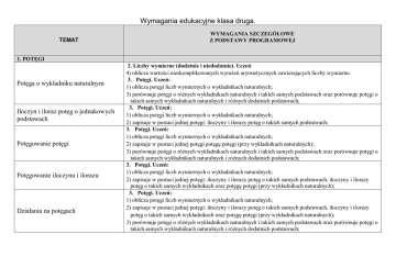 Wymagania edukacyjne klasa druga. TEMAT WYMAGANIA SZCZEGÓŁOWE Z PODSTAWY PROGRAMOWEJ 1. POTĘGI Potęga o wykładniku naturalnym Iloczyn i iloraz potęg o jednakowych podstawach Potęgowanie potęgi Potęgowanie iloczynu i ilorazu Działania na potęgach 2. Liczby wymierne (dodatnie i niedodatnie). Uczeń: 4) oblicza wartości nieskomplikowanych wyrażeń arytmetycznych zawierających liczby wymierne. 3. Potęgi. Uczeń: 1) oblicza potęgi liczb wymiernych o wykładnikach naturalnych; 3) porównuje potęgi o różnych wykładnikach naturalnych i takich samych podstawach oraz porównuje potęgi o takich samych wykładnikach naturalnych i różnych dodatnich podstawach; 3. Potęgi. Uczeń: 1) oblicza potęgi liczb wymiernych o wykładnikach naturalnych; 2) zapisuje w postaci jednej potęgi: iloczyny i ilorazy potęg o takich samych podstawach; 3. Potęgi. Uczeń: 1) oblicza potęgi liczb wymiernych o wykładnikach naturalnych; 2) zapisuje w postaci jednej potęgi potęgę potęgi (przy wykładnikach naturalnych); 3) porównuje potęgi o różnych wykładnikach naturalnych i takich samych podstawach oraz porównuje potęgi o takich samych wykładnikach naturalnych i różnych dodatnich podstawach; 3. Potęgi. Uczeń: 1) oblicza potęgi liczb wymiernych o wykładnikach naturalnych; 2) zapisuje w postaci jednej potęgi: iloczyny i ilorazy potęg o takich samych podstawach, iloczyny i ilorazy potęg o takich samych wykładnikach oraz potęgę potęgi (przy wykładnikach naturalnych); 3. Potęgi. Uczeń: 1) oblicza potęgi liczb wymiernych o wykładnikach naturalnych; 2) zapisuje w postaci jednej potęgi: iloczyny i ilorazy potęg o takich samych podstawach, iloczyny i ilorazy potęg o takich samych wykładnikach oraz potęgę potęgi (przy wykładnikach naturalnych); 3) porównuje potęgi o różnych wykładnikach naturalnych i takich samych podstawach oraz porównuje potęgi o takich samych wykładnikach naturalnych i różnych dodatnich podstawach; Potęga o wykładniku całkowitym ujemnym 3. Potęgi. Uczeń: 3) porównuje potęgi o różnych wykładnikach naturalnych i takich samych podstawach oraz porównuje potęgi o takich samych wykładnikach naturalnych i różnych dodatnich podstawach; 4) zamienia potęgi o wykładnikach całkowitych ujemnych na odpowiednie potęgi o wykładnikach naturalnych; Notacja wykładnicza 1. Liczby wymierne dodatnie. Uczeń: 7) stosuje obliczenia na liczbach wymiernych do rozwiązywania problemów w kontekście praktycznym, w tym do zamiany jednostek (jednostek prędkości, gęstości itp.). 3. Potęgi. Uczeń: 5) zapisuje liczby w notacji wykładniczej, tzn. w postaci a·10k, gdzie 1 ≤ α < 10 oraz k jest liczbą całkowitą. 2.PIERWIASTKI Pierwiastki Działania na pierwiastkach Działania na pierwiastkach (cd.) 4. Pierwiastki. Uczeń: 1) oblicza wartości pierwiastków drugiego i trzeciego stopnia z liczb, które są odpowiednio kwadratami lub sześcianami liczb wymiernych; 4. Pierwiastki. Uczeń: 1) oblicza wartości pierwiastków drugiego i trzeciego stopnia z liczb, które są odpowiednio kwadratami lub sześcianami liczb wymiernych; 3) mnoży i dzieli pierwiastki drugiego stopnia; 4) mnoży i dzieli pierwiastki trzeciego stopnia. 4. Pierwiastki. Uczeń: 1) oblicza wartości pierwiastków drugiego i trzeciego stopnia z liczb, które są odpowiednio kwadratami lub sześcianami liczb wymiernych; 2) wyłącza czynnik przed znak pierwiastka oraz włącza czynnik pod znak pierwiastka; 3) mnoży i dzieli pierwiastki drugiego stopnia; 4) mnoży i dzieli pierwiastki trzeciego stopnia. 3. DŁUGOŚĆ OKRĘGU. POLE KOŁA Liczba π. Długość okręgu Pole koła 10. Figury płaskie. Uczeń: 5) oblicza długość okręgu; 10. Figury płaskie. Uczeń: 6) oblicza pole koła, pierścienia kołowego; 9) oblicza pola i obwody trójkątów i czworokątów; Długość łuku. Pole wycinka koła 10. Figury płaskie. Uczeń: 5) oblicza długość okręgu i łuku okręgu; 6) oblicza pole koła, pierścienia kołowego, wycinka kołowego; 9) oblicza pola i obwody trójkątów i czworokątów; 4.WYRAŻENIA ALGEBRAICZNE Jednomiany i sumy algebraiczne Mnożenie jednomianów przez sumy Mnożenie sum algebraicznych 6. Wyrażenia algebraiczne. Uczeń: 1) opisuje za pomocą wyrażeń algebraicznych związki między różnymi wielkościami; 3) redukuje wyrazy podobne w sumie algebraicznej; 4) dodaje i odejmuje sumy algebraiczne; 5) mnoży jednomiany; 6. Wyrażenia algebraiczne. Uczeń: 1) opisuje za pomocą wyrażeń algebraicznych związki między różnymi wielkościami; 3) redukuje wyrazy podobne w sumie algebraicznej; 4) dodaje i odejmuje sumy algebraiczne; 5) mnoży jednomiany, mnoży sumę algebraiczną przez jednomian oraz, w nietrudnych przykładach, mnoży sumy algebraiczne; 6) wyłącza wspólny czynnik z wyrazów sumy algebraicznej poza nawias; 6. Wyrażenia algebraiczne. Uczeń: 1) opisuje za pomocą wyrażeń algebraicznych związki między różnymi wielkościami; 2) oblicza wartości liczbowe wyrażeń algebraicznych; 3) redukuje wyrazy podobne w sumie algebraicznej; 5) mnoży jednomiany, mnoży sumę algebraiczną przez jednomian oraz, w nietrudnych przykładach, mnoży sumy algebraiczne; 5.UKŁADY RÓWNAŃ Do czego służą układy równań? Rozwiązywanie układów równań 7. Równania. Uczeń: 4) zapisuje związki między nieznanymi wielkościami za pomocą układu dwóch równań pierwszego stopnia z dwiema niewiadomymi; 5) sprawdza, czy dana para liczb spełnia układ dwóch równań stopnia pierwszego z dwiema niewiadomymi; 7. Równania. Uczeń: 4) zapisuje związki między nieznanymi wielkościami za pomocą układu dwóch równań pierwszego stopnia z dwiema niewiadomymi; 6) rozwiązuje układy równań stopnia pierwszego z dwiema niewiadomymi; Rozwiązywanie układów równań (cd.) Ile rozwiązań może mieć układ równań? Zadania tekstowe Procenty w zadaniach tekstowych 7. Równania. Uczeń 4) zapisuje związki między nieznanymi wielkościami za pomoc