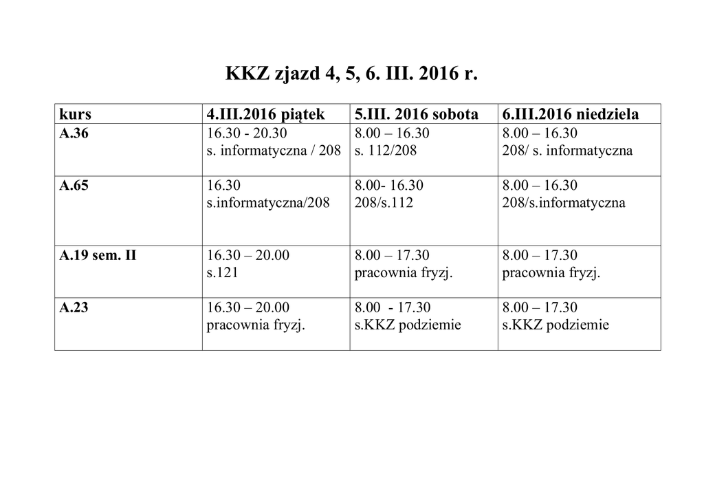 KKZ zjazd 4, 5, 6. III. 2016 r. kurs 4.III.2016 piątek 5.III. 2016 sobota 6.III.2016 niedziela A.36 16.30 - 20.30 8.00 – 16.30 s. informatyczna / 208 s. 112/208 8.00 – 16.30 208/ s. informatyczna A.65 16.30 s.informatyczna/208 8.00- 16.30 208/s.112 8.00 – 16.30 208/s.informatyczna A.19 sem. II 16.30 – 20.00 s.121 8.00 – 17.30 pracownia fryzj. 8.00 – 17.30 pracownia fryzj. A.23 16.30 – 20.00 pracownia fryzj. 8.00 - 17.30 s.KKZ podziemie 8.00 – 17.30 s.KKZ podziemie