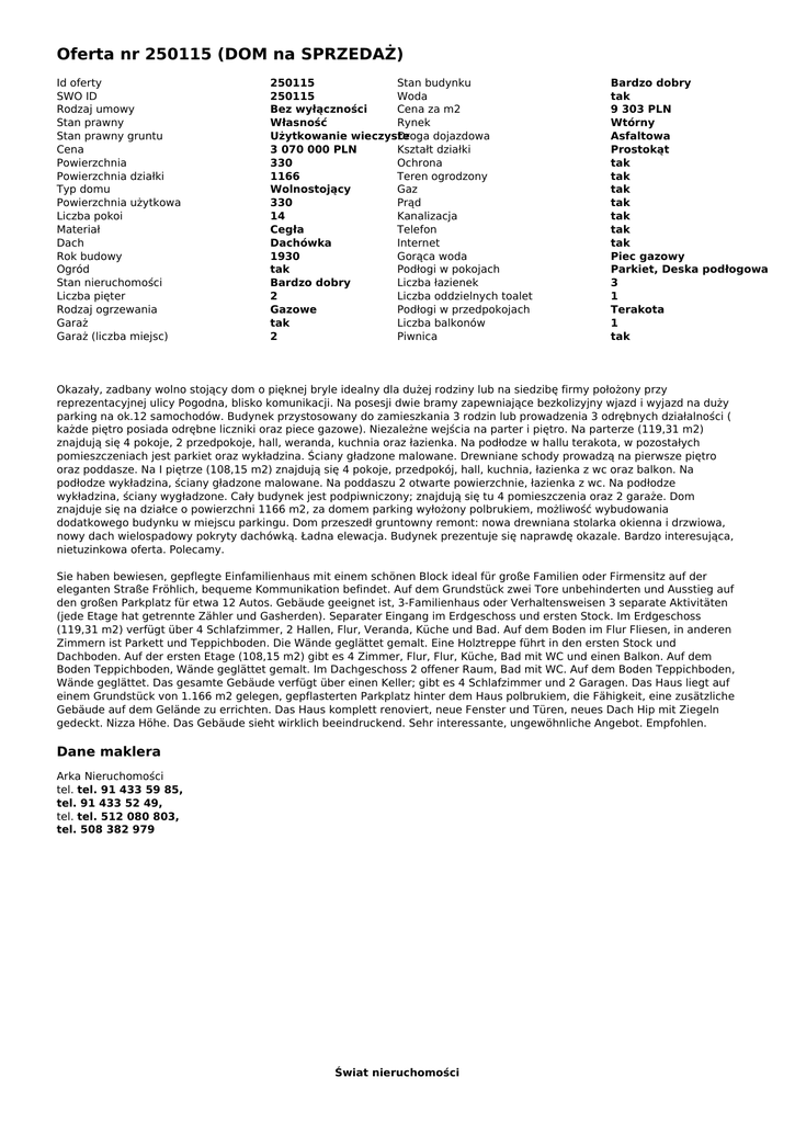 Oferta nr 250115 (DOM na SPRZEDAŻ) Id oferty SWO ID Rodzaj umowy Stan prawny Stan prawny gruntu Cena Powierzchnia Powierzchnia działki Typ domu Powierzchnia użytkowa Liczba pokoi Materiał Dach Rok budowy Ogród Stan nieruchomości Liczba pięter Rodzaj ogrzewania Garaż Garaż (liczba miejsc) 250115 Stan budynku 250115 Woda Bez wyłączności Cena za m2 Własność Rynek Użytkowanie wieczyste Droga dojazdowa 3 070 000 PLN Kształt działki 330 Ochrona 1166 Teren ogrodzony Wolnostojący Gaz 330 Prąd 14 Kanalizacja Cegła Telefon Dachówka Internet 1930 Gorąca woda tak Podłogi w pokojach Bardzo dobry Liczba łazienek 2 Liczba oddzielnych toalet Gazowe Podłogi w przedpokojach tak Liczba balkonów 2 Piwnica Bardzo dobry tak 9 303 PLN Wtórny Asfaltowa Prostokąt tak tak tak tak tak tak tak Piec gazowy Parkiet, Deska podłogowa 3 1 Terakota 1 tak Okazały, zadbany wolno stojący dom o pięknej bryle idealny dla dużej rodziny lub na siedzibę firmy położony przy reprezentacyjnej ulicy Pogodna, blisko komunikacji. Na posesji dwie bramy zapewniające bezkolizyjny wjazd i wyjazd na duży parking na ok.12 samochodów. Budynek przystosowany do zamieszkania 3 rodzin lub prowadzenia 3 odrębnych działalności ( każde piętro posiada odrębne liczniki oraz piece gazowe). Niezależne wejścia na parter i piętro. Na parterze (119,31 m2) znajdują się 4 pokoje, 2 przedpokoje, hall, weranda, kuchnia oraz łazienka. Na podłodze w hallu terakota, w pozostałych pomieszczeniach jest parkiet oraz wykładzina. Ściany gładzone malowane. Drewniane schody prowadzą na pierwsze piętro oraz poddasze. Na I piętrze (108,15 m2) znajdują się 4 pokoje, przedpokój, hall, kuchnia, łazienka z wc oraz balkon. Na podłodze wykładzina, ściany gładzone malowane. Na poddaszu 2 otwarte powierzchnie, łazienka z wc. Na podłodze wykładzina, ściany wygładzone. Cały budynek jest podpiwniczony; znajdują się tu 4 pomieszczenia oraz 2 garaże. Dom znajduje się na działce o powierzchni 1166 m2, za domem parking wyłożony polbrukiem, możliwość wybudowania dodatkowego budynku w miejscu parkingu. Dom przeszedł gruntowny remont: nowa drewniana stolarka okienna i drzwiowa, nowy dach wielospadowy pokryty dachówką. Ładna elewacja. Budynek prezentuje się naprawdę okazale. Bardzo interesująca, nietuzinkowa oferta. Polecamy. Sie haben bewiesen, gepflegte Einfamilienhaus mit einem schönen Block ideal für große Familien oder Firmensitz auf der eleganten Straße Fröhlich, bequeme Kommunikation befindet. Auf dem Grundstück zwei Tore unbehinderten und Ausstieg auf den großen Parkplatz für etwa 12 Autos. Gebäude geeignet ist, 3-Familienhaus oder Verhaltensweisen 3 separate Aktivitäten (jede Etage hat getrennte Zähler und Gasherden). Separater Eingang im Erdgeschoss und ersten Stock. Im Erdgeschoss (119,31 m2) verfügt über 4 Schlafzimmer, 2 Hallen, Flur, Veranda, Küche und Bad. Auf dem Boden im Flur Fliesen, in anderen Zimmern ist Parkett und Teppichboden. Die Wände geglättet gemalt. Eine Holztreppe führt in den ersten Stock und Dachboden. Auf der ersten Etage (108,15 m2) gibt es 4 Zimmer, Flur, Flur, Küche, Bad mit WC und einen Balkon. Auf dem Boden Teppichboden, Wände geglättet gemalt. Im Dachgeschoss 2 offener Raum, Bad mit WC. Auf dem Boden Teppichboden, Wände geglättet. Das gesamte Gebäude verfügt über einen Keller; gibt es 4 Schlafzimmer und 2 Garagen. Das Haus liegt auf einem Grundstück von 1.166 m2 gelegen, gepflasterten Parkplatz hinter dem Haus polbrukiem, die Fähigkeit, eine zusätzliche Gebäude auf dem Gelände zu errichten. Das Haus komplett renoviert, neue Fenster und Türen, neues Dach Hip mit Ziegeln gedeckt. Nizza Höhe. Das Gebäude sieht wirklich beeindruckend. Sehr interessante, ungewöhnliche Angebot. Empfohlen. Dane maklera Arka Nieruchomości tel. tel. 91 433 59 85, tel. 91 433 52 49, tel. tel. 512 080 803, tel. 508 382 979 Świat nieruchomości Powered by TCPDF (www.tcpdf.org)