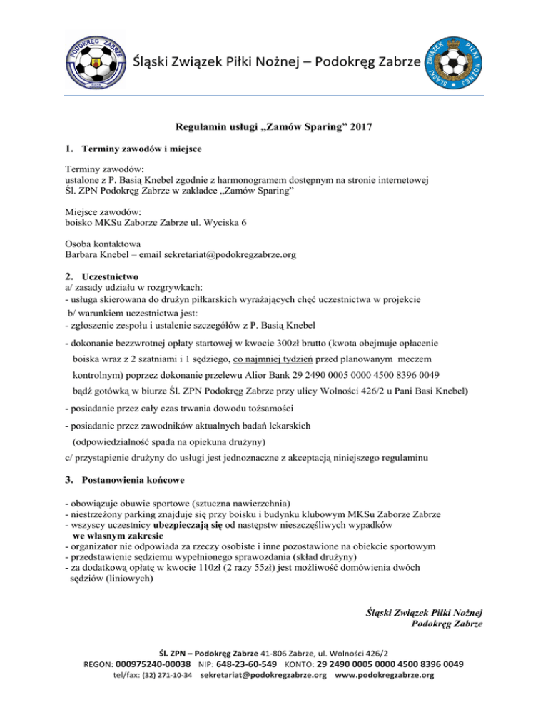 Śląski Związek Piłki Nożnej – Podokręg Zabrze Regulamin usługi „Zamów Sparing” 2017 1. Terminy zawodów i miejsce Terminy zawodów: ustalone z P. Basią Knebel zgodnie z harmonogramem dostępnym na stronie internetowej Śl. ZPN Podokręg Zabrze w zakładce „Zamów Sparing” Miejsce zawodów: boisko MKSu Zaborze Zabrze ul. Wyciska 6 Osoba kontaktowa Barbara Knebel – email [email protected] 2. Uczestnictwo a/ zasady udziału w rozgrywkach: - usługa skierowana do drużyn piłkarskich wyrażających chęć uczestnictwa w projekcie b/ warunkiem uczestnictwa jest: - zgłoszenie zespołu i ustalenie szczegółów z P. Basią Knebel - dokonanie bezzwrotnej opłaty startowej w kwocie 300zł brutto (kwota obejmuje opłacenie boiska wraz z 2 szatniami i 1 sędziego, co najmniej tydzień przed planowanym meczem kontrolnym) poprzez dokonanie przelewu Alior Bank 29 2490 0005 0000 4500 8396 0049 bądź gotówką w biurze Śl. ZPN Podokręg Zabrze przy ulicy Wolności 426/2 u Pani Basi Knebel) - posiadanie przez cały czas trwania dowodu tożsamości - posiadanie przez zawodników aktualnych badań lekarskich (odpowiedzialność spada na opiekuna drużyny) c/ przystąpienie drużyny do usługi jest jednoznaczne z akceptacją niniejszego regulaminu 3. Postanowienia końcowe - obowiązuje obuwie sportowe (sztuczna nawierzchnia) - niestrzeżony parking znajduje się przy boisku i budynku klubowym MKSu Zaborze Zabrze - wszyscy uczestnicy ubezpieczają się od następstw nieszczęśliwych wypadków we własnym zakresie - organizator nie odpowiada za rzeczy osobiste i inne pozostawione na obiekcie sportowym - przedstawienie sędziemu wypełnionego sprawozdania (skład drużyny) - za dodatkową opłatę w kwocie 110zł (2 razy 55zł) jest możliwość domówienia dwóch sędziów (liniowych) Śląski Związek Piłki Nożnej Podokręg Zabrze Śl. ZPN – Podokręg Zabrze 41-806 Zabrze, ul. Wolności 426/2 REGON: 000975240-00038 NIP: 648-23-60-549 KONTO: 29 2490 0005 0000 4500 8396 0049 tel/fax: (32) 271-10-34 [email protected] www.podokregzabrze.org