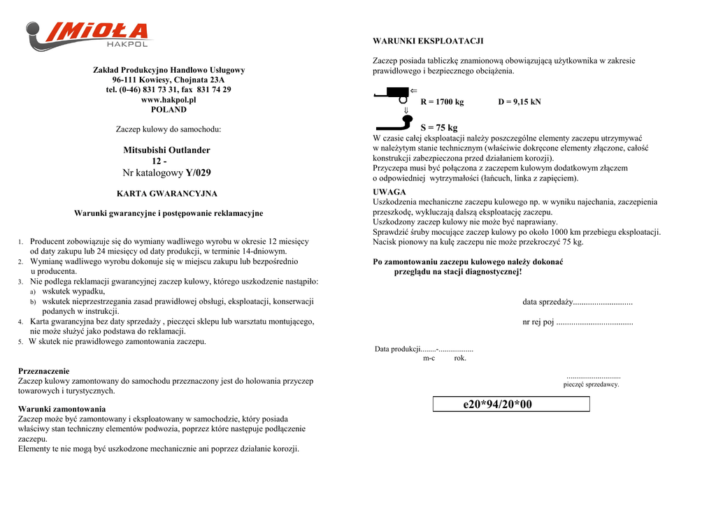 WARUNKI EKSPLOATACJI Zakład Produkcyjno Handlowo Usługowy 96-111 Kowiesy, Chojnata 23A tel. (0-46) 831 73 31, fax 831 74 29 www.hakpol.pl POLAND Zaczep kulowy do samochodu: Mitsubishi Outlander 12 - Nr katalogowy Y/029 KARTA GWARANCYJNA Warunki gwarancyjne i postępowanie reklamacyjne 1. 2. 3. 4. 5. Producent zobowiązuje się do wymiany wadliwego wyrobu w okresie 12 miesięcy od daty zakupu lub 24 miesięcy od daty produkcji, w terminie 14-dniowym. Wymianę wadliwego wyrobu dokonuje się w miejscu zakupu lub bezpośrednio u producenta. Nie podlega reklamacji gwarancyjnej zaczep kulowy, którego uszkodzenie nastąpiło: a) wskutek wypadku, b) wskutek nieprzestrzegania zasad prawidłowej obsługi, eksploatacji, konserwacji podanych w instrukcji. Karta gwarancyjna bez daty sprzedaży , pieczęci sklepu lub warsztatu montującego, nie może służyć jako podstawa do reklamacji. W skutek nie prawidłowego zamontowania zaczepu. Zaczep posiada tabliczkę znamionową obowiązującą użytkownika w zakresie prawidłowego i bezpiecznego obciążenia. R = 1700 kg D = 9,15 kN ⇓ S = 75 kg W czasie całej eksploatacji należy poszczególne elementy zaczepu utrzymywać w należytym stanie technicznym (właściwie dokręcone elementy złączone, całość konstrukcji zabezpieczona przed działaniem korozji). Przyczepa musi być połączona z zaczepem kulowym dodatkowym złączem o odpowiedniej wytrzymałości (łańcuch, linka z zapięciem). UWAGA Uszkodzenia mechaniczne zaczepu kulowego np. w wyniku najechania, zaczepienia przeszkodę, wykluczają dalszą eksploatację zaczepu. Uszkodzony zaczep kulowy nie może być naprawiany. Sprawdzić śruby mocujące zaczep kulowy po około 1000 km przebiegu eksploatacji. Nacisk pionowy na kulę zaczepu nie może przekroczyć 75 kg. Po zamontowaniu zaczepu kulowego należy dokonać przeglądu na stacji diagnostycznej! data sprzedaży............................ nr rej poj .................................... Data produkcji........-.................. m-c rok. Przeznaczenie Zaczep kulowy zamontowany do samochodu przeznaczony jest do holowania przyczep towarowych i turystycznych. Warunki zamontowania Zaczep może być zamontowany i eksploatowany w samochodzie, który posiada właściwy stan techniczny elementów podwozia, poprzez które następuje podłączenie zaczepu. Elementy te nie mogą być uszkodzone mechanicznie ani poprzez działanie korozji. ............................ pieczęć sprzedawcy. e20*94/20*00 Gniazdo 7-biegunowe 12V z ruchomymi bolcami Symbol SWW 1135-812 Oznaczenie zacisku 31 L R 54 58L 58R + Zacisk do łączenia przewodów do masy pojazdu do świateł kierunku jazdy lewych do świateł kierunku jazdy prawych do świateł hamowania do świateł pozycyjnych lewych do świateł pozycyjnych prawych tylne światła przeciwmgłowe ZESTAW ŚRUBOWY: FASTENING MEANS: Kolory Biały , white Żółty , yellow zielony, green czerwony, red czarny, black brązowy, brown niebieski , blue -M12x70 8.8 2szt -M12x40 8.8 7szt -M10x120 8.8 1szt -M10x110 8.8 1szt -M10x1,25x40 6szt -M10x1,25x35 2szt -M12 9szt -M10 12szt -M12 10szt Mitsubishi Outlander 12 NO CAT. Y/029 INSTRUKCJA MONTAŻU: FITTING INSTRUCTION: -M12 -M10 Moment skręcający dla śrub i nakrętek (8.8) Torgue settings for nuts and bolts (8.8) M8 25 Nm M12 M10 55 Nm M14 M16 195 Nm • • • • • • • 12szt 7szt 2szt 85 Nm 135 Nm • • • • • -Ø30 Odkręcić lampy, zderzak i belkę zderzeniową ( nie będzie już potrzebna ). Demontujemy koło zapasowe. Odkręcamy lewe ucho holownicze i opuszczamy tłumik. Element E z elementem D i element C z elementem D przykręcamy lekko do podłużnic śrubami M10x1,25x40 (pkt 4), M10x1,25x35 (pkt 2 i 5), M10x1,5x110 (pkt3). Następnie element G przykręcamy do elementu C i do boku podłużnicy z elementem F śrubą M12x40 (pkt 7) i śrubą M10x120 (pkt 8 i 6). Belkę haka A wsuwamy między elementy i przykręcamy śrubami M12x40 (pkt 1). Wycinamy w dolnej części zderzaka, w jego osi fragment 50x30. Zamontować zderzak i lampy. Dokręcić wszystkie śruby z momentem według tabeli. Dokręcić kulę i blachę gniazda elektrycznego. Podłączyć instalację elektryczną. • • • • • • • • • • Unscrew the lamp, bumper and bumper bar (it will not be used anymore). Disassemble the spare wheel. Unscrew the left towing eye and lower the damper. Screw slightly the elements E with the element D and C with the element D to the frame side members with bolts M10x1,25x40 8.8 (point 4), M10x1,25x35 8.8 (point 2 and 5), M10x1,5x110 (point 3). Screw the element G to the element C and to the side of the frame side member with the element F with bolt M12x40 8.8 (point 7) and M10x120 8.8 (point 8 and 6). Insert the main bar A between the elements and screw with bolts M12x40 8.8 (point 1). Cut out the fragment 50x30 in the bumper, in its axle. Screw the bumper and lamps. Tighten all the bolts according to the torque setting- see the table. Fix the ball and electric plate. Connect the electric wires. Nakrętka M10 ; Nut Podkł. spręż.10,2 ; Spring Washer Podkł. okr. pow. 10,5 ; Plain Washer Podkł. spręż.10,2 ; Spring Washer Śruba M10x120-8.8 ; Bolt Nakrętka M10x1,5 ; Nut Podkł. spręż.10,2 ; Spring Washer Podkł. okr. pow. 10,5 ; Plain Washer Podkł. spręż.10,2 ; Spring Washer Śruba M10x1,5x110-8.8 ; Bolt Śruba M10x1,25x35-8.8 ; Bolt Podkł. spręż.10,2 ; Spring Washer Podkł. okr. pow. 10,5 ; Plain Washer D Pkt. 2 Pkt. 3 Pkt. 7 G Pkt. 8 F D Pkt. 5 Śruba M10x1,25x35-8.8 ; Bolt Podkł. spręż.10,2 ; Spring Washer Podkł. okr. pow. 10,5 ; Plain Washer Śruba M10x120-8.8 ; Bolt Podkł. spręż.10,2 ; Spring Washer Podkł. okr. pow. 10,5 ; Plain Washer Pkt. 4 Nakrętka M12 ; Nut Podkł. spręż.12,2 ; Spring Washer Podkł. okr. 13 ; Plain Washer Pkt. 1 Pkt. 6 Śruba M12x40-8.8 ; Bolt Podkł. spręż.12,2 ; Spring Washer Podkł. okr. 13; Plain Washer A Śruba M12x40-8.8 ; Bolt Podkł. spręż.12,2 ; Spring Washer Podkł. okr. 13; Plai