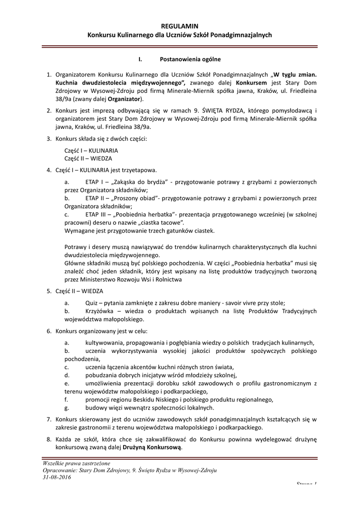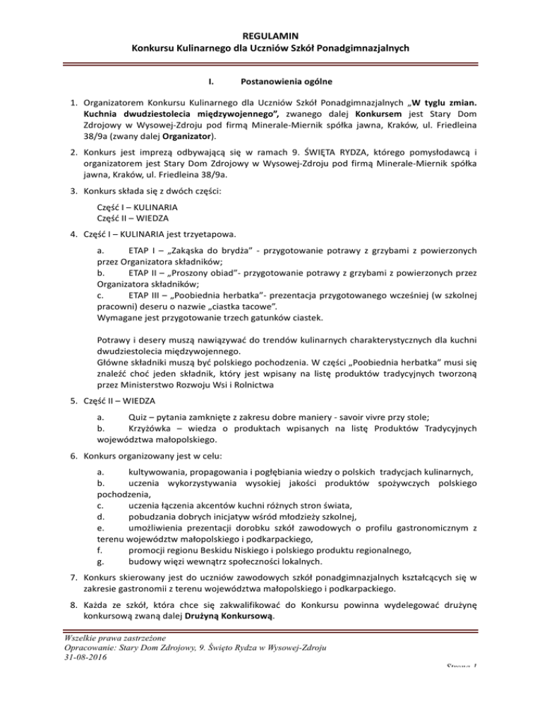 REGULAMIN KonkursuKulinarnegodlaUczniówSzkółPonadgimnazjalnych I. Postanowieniaogólne 1. Organizatorem Konkursu Kulinarnego dla Uczniów Szkół Ponadgimnazjalnych „W tyglu zmian. Kuchnia dwudziestolecia międzywojennego”, zwanego dalej Konkursem jest Stary Dom Zdrojowy w Wysowej-Zdroju pod firmą Minerale-Miernik spółka jawna, Kraków, ul. Friedleina 38/9a(zwanydalejOrganizator). 2. Konkurs jest imprezą odbywającą się w ramach 9. ŚWIĘTA RYDZA, którego pomysłodawcą i organizatorem jest Stary Dom Zdrojowy w Wysowej-Zdroju pod firmą Minerale-Miernik spółka jawna,Kraków,ul.Friedleina38/9a. 3. Konkursskładasięzdwóchczęści: CzęśćI–KULINARIA CzęśćII–WIEDZA 4. CzęśćI–KULINARIAjesttrzyetapowa. a. ETAP I – „Zakąska do brydża” - przygotowanie potrawy z grzybami z powierzonych przezOrganizatoraskładników; b. ETAPII–„Proszonyobiad”-przygotowaniepotrawyzgrzybamizpowierzonychprzez Organizatoraskładników; c. ETAPIII–„Poobiedniaherbatka”-prezentacjaprzygotowanegowcześniej(wszkolnej pracowni)deseruonazwie„ciastkatacowe”. Wymaganejestprzygotowanietrzechgatunkówciastek. Potrawyideserymusząnawiązywaćdotrendówkulinarnychcharakterystycznychdlakuchni dwudziestoleciamiędzywojennego. Główneskładnikimusząbyćpolskiegopochodzenia.Wczęści„Poobiedniaherbatka”musisię znaleźć choć jeden składnik, który jest wpisany na listę produktów tradycyjnych tworzoną przezMinisterstwoRozwojuWsiiRolnictwa 5. CzęśćII–WIEDZA a. Quiz–pytaniazamkniętezzakresudobremaniery-savoirvivreprzystole; b. Krzyżówka – wiedza o produktach wpisanych na listę Produktów Tradycyjnych województwamałopolskiego. 6. Konkursorganizowanyjestwcelu: a. kultywowania,propagowaniaipogłębianiawiedzyopolskichtradycjachkulinarnych, b. uczenia wykorzystywania wysokiej jakości produktów spożywczych polskiego pochodzenia, c. uczeniałączeniaakcentówkuchniróżnychstronświata, d. pobudzaniadobrychinicjatywwśródmłodzieżyszkolnej, e. umożliwienia prezentacji dorobku szkół zawodowych o profilu gastronomicznym z terenuwojewództwmałopolskiegoipodkarpackiego, f. promocjiregionuBeskiduNiskiegoipolskiegoprodukturegionalnego, g. budowywięziwewnątrzspołecznościlokalnych. 7. Konkurs skierowany jest do uczniów zawodowych szkół ponadgimnazjalnych kształcących się w zakresiegastronomiizterenuwojewództwamałopolskiegoipodkarpackiego. 8. Każda ze szkół, która chce się zakwalifikować do Konkursu powinna wydelegować drużynę konkursowązwanądalejDrużynąKonkursową. Wszelkie prawa zastrzeżone Opracowanie: Stary Dom Zdrojowy, 9. Święto Rydza w Wysowej-Zdroju 31-08-2016 Strona 1 REGULAMIN KonkursuKulinarnegodlaUczniówSzkółPonadgimnazjalnych 9. WKonkursieprzewidzianesąnastępującenagrody: a. Nagrodyrzeczowedlauczniów; b. Nagrodyrzeczowedlaszkół; c. Wyróżnienia(dyplomyipodziękowania); ponadto d. Szkoła, której Drużyna Konkursowa zdobędzie I miejsce będzie mieć prawo do nazywaniaswoichpotrawkonkursowychtytułem „PotrawawyróżnionawKonkursieKulinarnymdlaUczniówSzkółPonadgimnazjalnych-W tygluzmian.Kuchniadwudziestoleciamiędzywojennego”. II. Warunkiuczestnictwa 1. Przystąpienie do Konkursu następuje poprzez zapoznanie się z niniejszym regulaminem oraz poprzezwypełnienieFormularzaZgłoszeniowego. 2. Wypełniony Formularz Zgłoszeniowy należy dostarczyć w sposób wybrany z poniższych możliwości: a. dostarczyćosobiściedoStaregoDomuZdrojowegowWysowej-Zdroju,Wysowa-Zdrój 12,38-316Wysowa-Zdrój, b. przesłaćpocztąnawskazanypowyżejadres, c. przesłaćpocztąelektronicznąnaadres:[email protected] 3. Ostatecznyterminnadsyłaniazgłoszeńupływa19września2016r. 4. Ze względów organizacyjnych w Konkursie wziąć udział może maksymalnie 5 (pięć) szkół - decydujedataotrzymaniaprzezOrganizatorawypełnionegoFormularzaZgłoszeniowego. 5. Każda ze szkół chcących wystąpić w Konkursie zobowiązana jest do zorganizowania Drużyny Konkursowejliczącej3(trzech)ucznióworazminimum1(jednego)opiekuna. 6. Szkoły uczestniczące w Konkursie zobowiązane są do zakupu produktów, niezbędnych do przygotowania potrawy konkursowej tj. deseru – Cześć I, ETAP III we własnym zakresie i na własnykoszt. 7. Organizator jest zobowiązany do przygotowania wybranych przez niego składników, z których DrużynyKonkursoweprzygotująpotrawykonkursowe–CzęśćI,EtapIorazEtapII. 8. OrodzajuwybranejdoprzygotowaniapotrawyOrganizatorpoinformujeDrużynyKonkursowew czasietrwaniaKonkursu. 9. Zabronionejestkorzystaniezproduktówwysoceprzetworzonych,wszczególnościzawierających glutaminiansodu,konserwanty,sztucznebarwniki. 10. Każda z Drużyn Konkursowych we własnym zakresie zobowiązana jest do posiadania w trakcie Konkursu niezbędnego sprzętu kuchennego (patelnie, garnki, noże, talerze, sztućce, deski do krojenia,miski,itp). 11. Członkowie Drużyn Konkursowych winni być ubrani w określone przepisami stroje robocze, zapaskiiczapkikucharskieorazpowinnibyćwyposażeniwrękawiczkilateksowe. 12. Każda Drużyna Konkursowa przygotowuje jedną porcję wskazanej przez Organizatora potrawy konkursowejdlaocenywartościwizualnejoraz7(siedmiu)porcjitejpotrawy,każdaowadzeod5 (pięciu)dkgdo10(dziesięciu)dkg,służącychdoocenywalorówsmakowych. Wszelkie prawa zastrzeżone Opracowanie: Stary Dom Zdrojowy, 9. Święto Rydza w Wysowej-Zdroju 31-08-2016 Strona 2 REGULAMIN KonkursuKulinarnegodlaUczniówSzkółPonadgimnazjalnych 13. KażdaDrużynaKonkursowaprzygotowujejednąporcjędeserudlaocenywartościwizualnejoraz 7(siedmiu)porcjideseru,każdaowadzeod5(pięciu)dkgdo10(dziesięciu)dkg,służącychdo ocenywalorówsmakowych. 14. Przygotowanie większej ilości porcji potraw dla degustacji wśród widzów nie jest obowiązkowa anipunktowana. 15. KosztyprzejazdunamiejsceKonkursuorazpowrotupokrywaszkołauczestniczącawKonkursie. III. Wsparcieorganizacyjne 1. DodyspozycjiDrużynKonkursowychzapewnionebędąstanowiskadoprzygotowaniapotraw.
