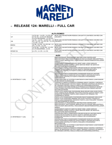 • RELEASE 124: MARELLI – FULL CAR ALFA ROMEO 147 159 BRERA GT SPIDER '06 1.6 TS 16V , 1.9 JTD , 1.9 JTD 16V , 2.0 TS 16V , 2.0 TS 16V SELESP. , 3.2 GTA SELESPEED , 3.2 V6 GTA 1.8 16V , 1.9 JTD , 1.9 JTD 16V , 1.9 JTS , 2.0 JTD , 2.0 JTD 16V , 2.2 JTS , 2.4 JTD , 3.2 JTS 1.8 TBI , 2.0 JTD , 2.0 JTD 16V , 2.2 JTS , 2.4 JTD , 3.2 JTS 1.8 TS 16V , 1.9 JTD 16V , 2.0 JTS , 2.0 JTS SELESPEED , 3.2 V6 2.2 JTS , 2.4 JTD , 3.2 JTS RETE CAN CAN NETWORK RESEAU CAN ∆ΙΚΤΥΟ CAN REDE CAN RED CAN CAN-NETZ RETE CAN CAN NETWORK RESEAU CAN ∆ΙΚΤΥΟ CAN REDE CAN RED CAN CAN-NETZ RETE CAN CAN NETWORK RESEAU CAN ∆ΙΚΤΥΟ CAN REDE CAN RED CAN CAN-NETZ RETE CAN CAN NETWORK RESEAU CAN ∆ΙΚΤΥΟ CAN REDE CAN RED CAN CAN-NETZ RETE CAN CAN NETWORK RESEAU CAN ∆ΙΚΤΥΟ CAN REDE CAN RED CAN CAN-NETZ • AUDI A1 SPORTBACK '11 (8X) 1.2 A1 SPORTBACK '11 (8X) 1.4 ABS/CONTROLLO TRAZIONE/ESP ABS/TRACTION CONTROL/ESP ABS/CONTROLE TRACTION/ESP ABS/ΕΛΕΓΧΟΣ ΕΛΞΗΣ/ESP ABS/CONTROLO TRACΗΓO/ESP ABS/CONTROL TRACCIΣN/ESP ABS/ANTRIEBKONTROLLE/ESP AIRBAG AZZERAMENTO SERVICE SERVICE RESET MISE A ZERO SERVICE ΜΗ∆ΕΝΙΣΜΟΣ ΣΕΡΒΙΣ AJUSTE A ZERO SERVICE RESET DE SERVICIO NULLSETZUNG SERVICEANZEIGE CENTRALINA PORTA CONDUCENTE DRIVER DOOR ECU BOITIER PORTE CONDUCTEUR ΕΓΚΕΦΑΛΟΣ ΘΥΡΑΣ Ο∆ΗΓΟΥ CENTRALINA PORTA CONDUTOR CENTRALITA PUERTA CONDUCTOR STEUERGER∆T FAHRERTÜR CENTRALINA PORTA PASSEGGERO PASSENGER DOOR ECU BOITIER PORTE PASSAGER ΕΓΚΕΦΑΛΟΣ ΘΥΡΑΣ ΕΠΙΒΑΤΗ CENTRALINA PORTA PASSAGEIRO CENTRALITA PUERTA PASAJERO STEUERGER∆T BEIFAHRERTÜR CLIMATIZZATORE A/C SYSTEM CLIMATISEUR ΚΛΙΜΑΤΙΣΜΟΣ CLIMATIZADOR CLIMATIZADOR KLIMAANLAGE CONTROLLO ANGOLO STERZATA STEERING ANGLE CONTROL CONTROLE ANGLE DE BRAQUAGE ΕΛΕΓΧΟΣ ΓΩΝΙΑΣ ΤΙΜΟΝΙΑΣ CONTROLO DO ΒNGULO DE VIRAGEM CONTROL ΑNGULO DIRECCIΣN LENKWINKELKONTROLL ELETTRONICA MOTORE ENGINE ELECTRONICS ELECTRONIQUE MOTEUR ΗΛΕΚΤΡΟΝΙΚΗ ΚΙΝΗΤΗΡΑ ELECTRΣNICA MOTOR ELECTRΣNICA MOTOR MOTORELEKTRONIK PORTA LATO GUIDATORE POSTERIORE REAR DRIVER SIDE DOOR PORTE COTE CONDUCTEUR ARRIERE ΠΙΣΩ ΘΥΡΑ ΠΛΕΥΡΑΣ Ο∆ΗΓΟΥ PORTA LADO CONDUTOR TRASEIRA PUERTA LADO CONDUCTOR TRASERO TÜR FAHRERSEITE HINTEN PORTA LATO PASSEGGERO POSTERIORE REAR PASSENGER SIDE DOOR PORTE COTE PASSAGER ARRIERE ΠΙΣΩ ΘΥΡΑ ΠΛΕΥΡΑΣ ΣΥΝΟ∆ΗΓΟΥ PORTA LADO PASSAGEIRO TRASEIRA PUERTA LADO PASAJERO TRASERO TÜR BEIFAHRERSEITE HINTEN ABS/CONTROLLO TRAZIONE/ESP ABS/TRACTION CONTROL/ESP ABS/CONTROLE TRACTION/ESP ABS/ΕΛΕΓΧΟΣ ΕΛΞΗΣ/ESP ABS/CONTROLO TRACΗΓO/ESP ABS/CONTROL TRACCIΣN/ESP ABS/ANTRIEBKONTROLLE/ESP AIRBAG AZZERAMENTO SERVICE SERVICE RESET MISE A ZERO SERVICE ΜΗ∆ΕΝΙΣΜΟΣ ΣΕΡΒΙΣ AJUSTE A ZERO SERVICE RESET DE SERVICIO NULLSETZUNG SERVICEANZEIGE CENTRALINA PORTA CONDUCENTE DRIVER DOOR ECU BOITIER PORTE CONDUCTEUR ΕΓΚΕΦΑΛΟΣ ΘΥΡΑΣ Ο∆ΗΓΟΥ CENTRALINA PORTA CONDUTOR CENTRALITA PUERTA CONDUCTOR STEUERGER∆T FAHRERTÜR CENTRALINA PORTA PASSEGGERO PASSENGER DOOR ECU BOITIER PORTE PASSAGER ΕΓΚΕΦΑΛΟΣ ΘΥΡΑΣ ΕΠΙΒΑΤΗ CENTRALINA PORTA PASSAGEIRO CENTRALITA PUERTA PASAJERO STEUERGER∆T BEIFAHRERTÜR CLIMATIZZATORE A/C SYSTEM CLIMATISEUR ΚΛΙΜΑΤΙΣΜΟΣ CLIMATIZADOR CLIMATIZADOR KLIMAANLAGE CONTROLLO ANGOLO STERZATA STEERING ANGLE CONTROL CONTROLE ANGLE DE BRAQUAGE ΕΛΕΓΧΟΣ ΓΩΝΙΑΣ ΤΙΜΟΝΙΑΣ CONTROLO DO ΒNGULO DE VIRAGEM CONTROL ΑNGULO DIRECCIΣN LENKWINKELKONTROLL 1 A1 SPORTBACK '11 (8X) 1.6 TDI A2 (8Z0) 1.2 TDI , 1.4 , 1.4 TDI , 1.6 PORTA LATO GUIDATORE POSTERIORE REAR DRIVER SIDE DOOR PORTE COTE CONDUCTEUR ARRIERE ΠΙΣΩ ΘΥΡΑ ΠΛΕΥΡΑΣ Ο∆ΗΓΟΥ PORTA LADO CONDUTOR TRASEIRA PUERTA LADO CONDUCTOR TRASERO TÜR FAHRERSEITE HINTEN PORTA LATO PASSEGGERO POSTERIORE REAR PASSENGER SIDE DOOR PORTE COTE PASSAGER ARRIERE ΠΙΣΩ ΘΥΡΑ ΠΛΕΥΡΑΣ ΣΥΝΟ∆ΗΓΟΥ PORTA LADO PASSAGEIRO TRASEIRA PUERTA LADO PASAJERO TRASERO TÜR BEIFAHRERSEITE HINTEN ABS/CONTROLLO TRAZIONE/ESP ABS/TRACTION CONTROL/ESP ABS/CONTROLE TRACTION/ESP ABS/ΕΛΕΓΧΟΣ ΕΛΞΗΣ/ESP ABS/CONTROLO TRACΗΓO/ESP ABS/CONTROL TRACCIΣN/ESP ABS/ANTRIEBKONTROLLE/ESP AIRBAG AZZERAMENTO SERVICE SERVICE RESET MISE A ZERO SERVICE ΜΗ∆ΕΝΙΣΜΟΣ ΣΕΡΒΙΣ AJUSTE A ZERO SERVICE RESET DE SERVICIO NULLSETZUNG SERVICEANZEIGE CENTRALINA PORTA CONDUCENTE DRIVER DOOR ECU BOITIER PORTE CONDUCTEUR ΕΓΚΕΦΑΛΟΣ ΘΥΡΑΣ Ο∆ΗΓΟΥ CENTRALINA PORTA CONDUTOR CENTRALITA PUERTA CONDUCTOR STEUERGER∆T FAHRERTÜR CENTRALINA PORTA PASSEGGERO PASSENGER DOOR ECU BOITIER PORTE PASSAGER ΕΓΚΕΦΑΛΟΣ ΘΥΡΑΣ ΕΠΙΒΑΤΗ CENTRALINA PORTA PASSAGEIRO CENTRALITA PUERTA PASAJERO STEUERGER∆T BEIFAHRERTÜR CLIMATIZZATORE A/C SYSTEM CLIMATISEUR ΚΛΙΜΑΤΙΣΜΟΣ CLIMATIZADOR CLIMATIZADOR KLIMAANLAGE CONTROLLO ANGOLO STERZATA STEERING ANGLE CONTROL CONTROLE ANGLE DE BRAQUAGE ΕΛΕΓΧΟΣ ΓΩΝΙΑΣ ΤΙΜΟΝΙΑΣ CONTROLO DO ΒNGULO DE VIRAGEM CONTROL ΑNGULO DIRECCIΣN LENKWINKELKONTROLL ELETTRONICA MOTORE ENGINE ELECTRONICS ELECTRONIQUE MOTEUR ΗΛΕΚΤΡΟΝΙΚΗ ΚΙΝΗΤΗΡΑ ELECTRΣNICA MOTOR ELECTRΣNICA MOTOR MOTORELEKTRONIK PORTA LATO GUIDATORE POSTERIORE REAR DRIVER SIDE DOOR PORTE COTE CONDUCTEUR ARRIERE ΠΙΣΩ ΘΥΡΑ ΠΛΕΥΡΑΣ Ο∆ΗΓΟΥ PORTA LADO CONDUTOR TRASEIRA PUERTA LADO CONDUCTOR TRASERO TÜR FAHRERSEITE HINTEN PORTA LATO PASSEGGERO POSTERIORE REAR PASSENGER SIDE DOOR PORTE COTE PASSAGER ARRIERE ΠΙΣΩ ΘΥΡΑ ΠΛΕΥΡΑΣ ΣΥΝΟ∆ΗΓΟΥ PORTA LADO PASSAGEIRO TRASEIRA PUERTA LADO PASAJERO TRASERO TÜR BEIFAHRERSEITE HINTEN RIGENERAZIONE FILTRO PARTICOLATO PARTICULATE FILTER REGENERATION REGENERATION FILTRE A PARTICULES ΑΝΑΝΕΩΣΗ ΦΙΛΤΡΟΥ ΜΙΚΡΟΣΩΜΑΤΙ∆ΙΩΝ REGENERAΗΓO FILTRO DE PARTΝCULAS REGENERACIΣN FILTRO PARTICULAS REGENERATION PARTIKELFILTER ABS/CONTROLLO TRAZIONE/ESP ABS/TRACTION CONTROL/ESP ABS/C