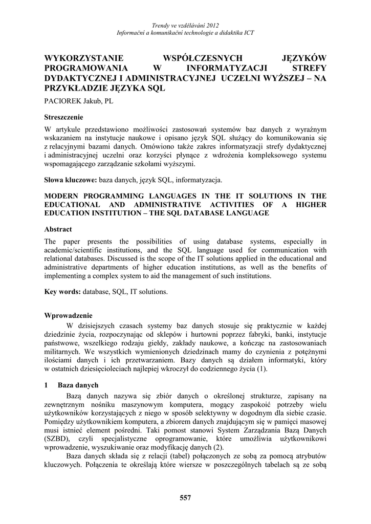 Trendy ve vzdělávání 2012 Informační a komunikační technologie a didaktika ICT WYKORZYSTANIE WSPÓŁCZESNYCH JĘZYKÓW PROGRAMOWANIA W INFORMATYZACJI STREFY DYDAKTYCZNEJ I ADMINISTRACYJNEJ UCZELNI WYŻSZEJ – NA PRZYKŁADZIE JĘZYKA SQL PACIOREK Jakub, PL Streszczenie W artykule przedstawiono możliwości zastosowań systemów baz danych z wyraźnym wskazaniem na instytucje naukowe i opisano język SQL służący do komunikowania się z relacyjnymi bazami danych. Omówiono także zakres informatyzacji strefy dydaktycznej i administracyjnej uczelni oraz korzyści płynące z wdrożenia kompleksowego systemu wspomagającego zarządzanie szkołami wyższymi. Słowa kluczowe: baza danych, język SQL, informatyzacja. MODERN PROGRAMMING LANGUAGES IN THE IT SOLUTIONS IN THE EDUCATIONAL AND ADMINISTRATIVE ACTIVITIES OF A HIGHER EDUCATION INSTITUTION – THE SQL DATABASE LANGUAGE Abstract The paper presents the possibilities of using database systems, especially in academic/scientific institutions, and the SQL language used for communication with relational databases. Discussed is the scope of the IT solutions applied in the educational and administrative departments of higher education institutions, as well as the benefits of implementing a complex system to aid the management of such institutions. Key words: database, SQL, IT solutions. Wprowadzenie W dzisiejszych czasach systemy baz danych stosuje się praktycznie w każdej dziedzinie życia, rozpoczynając od sklepów i hurtowni poprzez fabryki, banki, instytucje państwowe, wszelkiego rodzaju giełdy, zakłady naukowe, a kończąc na zastosowaniach militarnych. We wszystkich wymienionych dziedzinach mamy do czynienia z potężnymi ilościami danych i ich przetwarzaniem. Bazy danych są działem informatyki, który w ostatnich dziesięcioleciach najlepiej wkroczył do codziennego życia (1). 1 Baza danych Bazą danych nazywa się zbiór danych o określonej strukturze, zapisany na zewnętrznym nośniku maszynowym komputera, mogący zaspokoić potrzeby wielu użytkowników korzystających z niego w sposób selektywny w dogodnym dla siebie czasie. Pomiędzy użytkownikiem komputera, a zbiorem danych znajdującym się w pamięci masowej musi istnieć element pośredni. Taki pomost stanowi System Zarządzania Bazą Danych (SZBD), czyli specjalistyczne oprogramowanie, które umożliwia użytkownikowi wprowadzenie, wyszukiwanie oraz modyfikację danych (2). Baza danych składa się z relacji (tabel) połączonych ze sobą za pomocą atrybutów kluczowych. Połączenia te określają które wiersze w poszczególnych tabelach są ze sobą 557 Trendy ve vzdělávání 2012 Informační a komunikační technologie a didaktika ICT związane. Wiązania te w docelowej, prawidłowo zaprojektowanej bazie danych mogą być tylko typu jeden do jeden lub jeden do wielu. Nowoczesne relacyjne bazy danych są wielodostępne o architekturze Klient/Serwer lub rozproszonej. Własności statyczne, zwane schematem bazy danych, są stałe, niezmienne w czasie. Schemat odpowiada temu, co nazywamy zazwyczaj językiem definiowania danych (ang. Data Definition Language – DDL). Natomiast własności dynamiczne, zwane stanem bazy danych, są wyrażone zbiorem operacji odpowiadających językowi manipulowania danymi (ang. Data Manipulation Language – DML. Opisując składnie języka SQL wspomnieć należy również o DCL (ang. Data Control Language). Składnia ta odpowiada za nadawanie uprawnień do obiektów bazodanowych (3). Język SQL Język SQL stanowi najbardziej popularny mechanizm definiowania poleceń, zapytań i modyfikacji w relacyjnych systemach baz danych. Słowo SQL jest skrótem angielskim od „ Structured Query Language”, tj. „język zapytań strukturalnych”. Interpretując SQL i zarządzanie relacyjną bazą danych należy jasno określić, że cała informacja w bazie danych – niezależnie od tego czy są to dane użytkownika, czy systemu – jest reprezentowana w postaci tabel (4). Język ten stosowany jest do operowania danymi (wyszukiwania i modyfikowania) oraz definiowania danych i administrowania nimi. We wszystkich zapytaniach SQL używa się słowa kluczowego SELECT. Natomiast operacje modyfikowania danych są realizowane przez użycie słów kluczowych: INSERT, DELETE i UPDATE. Istnieją również polecenia dotyczące utworzenia lub usunięcia struktury (bazy, tabeli, indeksu) bądź zmiany struktury (dodanie kolumny do tabeli, zmiana typu danych w kolumnie tabeli). Należą do nich słowa: CREATE, DROP i ALTER. Za nadawanie uprawnień do obiektów bazodanowych odpowiadają polecenia: GRANT i REVOKE – oznaczające kolejno przyznanie praw do tabeli lub odebranie praw użytkownikowi (5). 1.1 2 Zakres informatyzacji Wykorzystanie odpowiednich języków programowania, w szczególności języka C++, języka wysokiego poziomu SQL oraz relacyjnych baz danych umożliwiło stworzenie kompleksowego systemu wspomagającego zarządzanie uczelnią wyższą. Najistotniejszą rolę w zakresie informatyzacji strefy dydaktycznej i administracyjnej odgrywa wdrożenie programu ułatwiającego i wspomagającego pracę dziekanatu, działu rekrutacji i kwestury szkół wyższych oraz umożliwienie studentom dostępu do informacji przy wykorzystaniu Internetu. W przypadku opisywanego systemu taką witryną jest „Wirtualna Uczelnia” . Należy również zaznaczyć, że sektor wyższych uczelni jest obecnie jednym z liderów w zakresie informatyzacji różnych obszarów funkcjonowania. Wdrożenie systemu Prace przedwdrożeniowe rozpoczynają się od szczegółowej analizy przygotowującej do wdrożenia kompleksowego, zintegrowanego rozwiązania wspierającego pracę administracji uczelni, obsługę i prowadzenie różnych form kształcenia oraz wymianę informacji pomiędzy nauczycielami akademickimi i osobami obsługującymi dydaktykę a studentami. Zakres dostawy systemu obejmuje dostarczenie oprogramowania wraz z udzieleniem licencji, modyfikacj