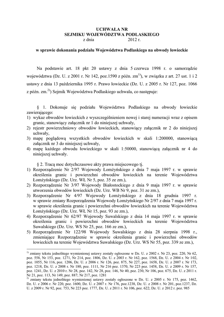 UCHWAŁA NR SEJMIKU WOJEWÓDZTWA PODLASKIEGO z dnia 2012 r. w sprawie dokonania podziału Województwa Podlaskiego na obwody łowieckie Na podstawie art. 18 pkt 20 ustawy z dnia 5 czerwca 1998 r. o samorządzie województwa (Dz. U. z 2001 r. Nr 142, poz.1590 z późn. zm1)), w związku z art. 27 ust. 1 i 2 ustawy z dnia 13 października 1995 r. Prawo łowieckie (Dz. U. z 2005 r. Nr 127, poz. 1066 z późn. zm.2)) Sejmik Województwa Podlaskiego uchwala, co następuje: § 1. Dokonuje się podziału Województwa Podlaskiego na obwody łowieckie zawierającego: 1) wykaz obwodów łowieckich z wyszczególnieniem nowej i starej numeracji wraz z opisem granic, stanowiący załącznik nr 1 do niniejszej uchwały, 2) rejestr powierzchniowy obwodów łowieckich, stanowiący załącznik nr 2 do niniejszej uchwały, 3) mapę poglądową wszystkich obwodów łowieckich w skali 1:200000, stanowiącą załącznik nr 3 do niniejszej uchwały, 4) mapę każdego obwodu łowieckiego w skali 1:50000, stanowiącą załącznik nr 4 do niniejszej uchwały. § 2. Tracą moc dotychczasowe akty prawa miejscowego tj. 1) Rozporządzenie Nr 2/97 Wojewody Łomżyńskiego z dnia 7 maja 1997 r. w sprawie określenia granic i powierzchni obwodów łowieckich na terenie Województwa Łomżyńskiego (Dz. Urz. WŁ Nr 5, poz. 35 ze zm.), 2) Rozporządzenie Nr 3/97 Wojewody Białostockiego z dnia 9 maja 1997 r. w sprawie utworzenia obwodów łowieckich (Dz. Urz. WB Nr 9, poz. 31 ze zm.), 3) Rozporządzenie Nr 4/97 Wojewody Łomżyńskiego z dnia 18 grudnia 1997 r. w sprawie zmiany Rozporządzenia Wojewody Łomżyńskiego Nr 2/97 z dnia 7 maja 1997 r. w sprawie określenia granic i powierzchni obwodów łowieckich na terenie Województwa Łomżyńskiego (Dz. Urz. WŁ Nr 15, poz. 93 ze zm.), 4) Rozporządzenie Nr 62/97 Wojewody Suwalskiego z dnia 14 maja 1997 r. w sprawie określenia granic i powierzchni obwodów łowieckich na terenie Województwa Suwalskiego (Dz. Urz. WS Nr 25, poz. 166 ze zm.), 5) Rozporządzenie Nr 122/98 Wojewody Suwalskiego z dnia 28 sierpnia 1998 r., zmieniające Rozporządzenie w sprawie określenia granic i powierzchni obwodów łowieckich na terenie Województwa Suwalskiego (Dz. Urz. WS Nr 55, poz. 339 ze zm.), 1) zmiany tekstu jednolitego wymienionej ustawy zostały ogłoszone w Dz. U. z 2002 r. Nr 23, poz. 220, Nr 62, poz. 558, Nr 153, poz. 1271, Nr 214, poz. 1806, Dz. U. z 2003 r. Nr 162, poz. 1568, Dz. U. z 2004 r. Nr 102, poz. 1055, Nr 116, poz. 1206, Dz. U. z 2006 r. Nr 126, poz. 875, Nr 227, poz. 1658, Dz. U. z 2007 r. Nr 173, poz. 1218, Dz. U. z 2008 r. Nr 180, poz. 1111, Nr 216 poz. 1370, Nr 223 poz. 1458, Dz. U. z 2009 r. Nr 157, poz. 1241, Dz. U. z 2010 r. Nr 28, poz. 142, Nr 28, poz. 146, Nr 40, poz. 230, Nr 106, poz. 675, Dz. U. z 2011 r. Nr 21, poz. 113, Nr 149, poz. 887; Nr 217, poz. 1281 2) zmiany tekstu jednolitego wymienionej ustawy zostały ogłoszone w Dz. U. z 2005 r. Nr 175, poz. 1462, Dz. U. z 2006 r. Nr 220, poz. 1600, Dz. U. z 2007 r. Nr 176, poz.1238, Dz. U. z 2008 r. Nr 201, poz.1237, Dz. U. z 2009 r. Nr 92, poz. 753, Nr 223 poz. 1777, Dz. U. z 2011 r. Nr 106, poz. 622; Dz. U. z 2012 r. poz. 985 6) Rozporządzenie Nr 11/00 Wojewody Podlaskiego z dnia 26 września 2000 r., zmieniające Rozporządzenie Wojewody Suwalskiego w sprawie określenia granic i powierzchni obwodów łowieckich na terenie Województwa Podlaskiego (Dz. Urz. WP Nr 25, poz. 359 ze zm.), 7) Rozporządzenie Nr 23/01 Wojewody Podlaskiego z dnia 17 września 2001 r. zmieniające Rozporządzenie w sprawie określenia granic i powierzchni obwodów łowieckich na terenie Województwa Podlaskiego (Dz. Urz. WP Nr 39, poz. 662 ze zm.), 8) Rozporządzenie Nr 16/02 Wojewody Podlaskiego z dnia 16 maja 2002 r. zmieniające Rozporządzenie w sprawie określenia granic i powierzchni obwodów łowieckich na terenie Województwa Podlaskiego (Dz. Urz. WP Nr 17, poz. 426 ze zm.), 9) Rozporządzenie Nr 59/02 Wojewody Podlaskiego z dnia 17 grudnia 2002 r., zmieniające Rozporządzenia w sprawie określenia granic i powierzchni obwodów łowieckich na terenie Województwa Podlaskiego (Dz. Urz. WP Nr 86, poz. 2155 ze zm.). § 3. Wykonanie uchwały powierza się Zarządowi Województwa Podlaskiego. § 4. Uchwała podlega ogłoszeniu w Dzienniku Urzędowym Województwa Podlaskiego i wchodzi w życie z dniem 1 kwietnia 2013 r.