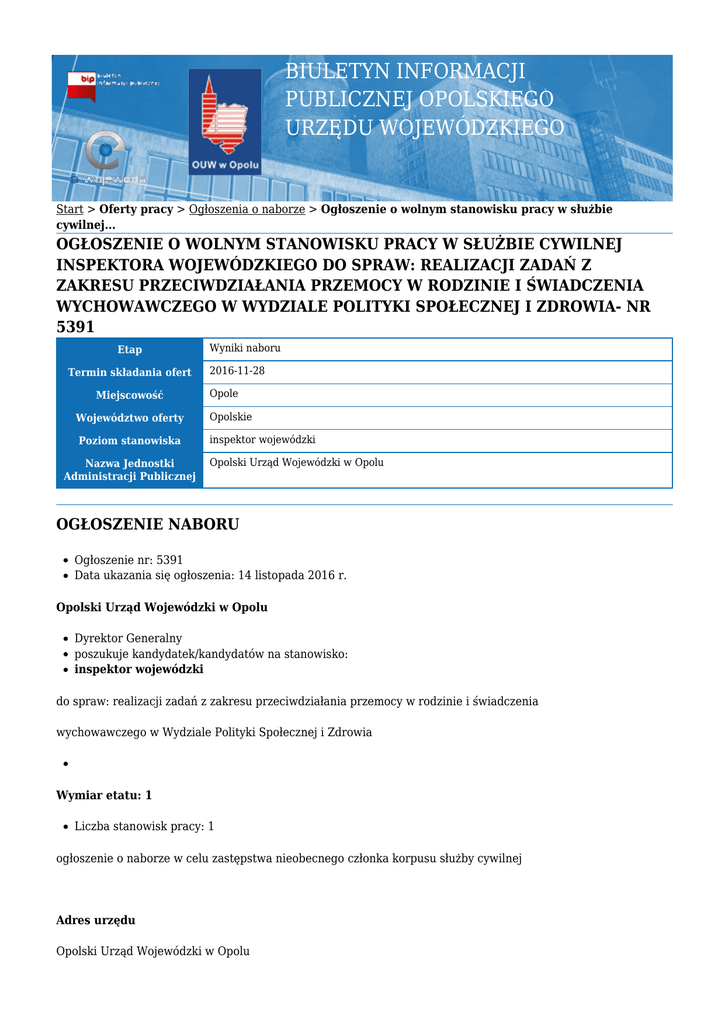 BIULETYN INFORMACJI PUBLICZNEJ OPOLSKIEGO URZĘDU WOJEWÓDZKIEGO Start > Oferty pracy > Ogłoszenia o naborze > Ogłoszenie o wolnym stanowisku pracy w służbie cywilnej... OGŁOSZENIE O WOLNYM STANOWISKU PRACY W SŁUŻBIE CYWILNEJ INSPEKTORA WOJEWÓDZKIEGO DO SPRAW: REALIZACJI ZADAŃ Z ZAKRESU PRZECIWDZIAŁANIA PRZEMOCY W RODZINIE I ŚWIADCZENIA WYCHOWAWCZEGO W WYDZIALE POLITYKI SPOŁECZNEJ I ZDROWIA- NR 5391 Etap Termin składania ofert Miejscowość Wyniki naboru 2016-11-28 Opole Województwo oferty Opolskie Poziom stanowiska inspektor wojewódzki Nazwa Jednostki Administracji Publicznej Opolski Urząd Wojewódzki w Opolu OGŁOSZENIE NABORU Ogłoszenie nr: 5391 Data ukazania się ogłoszenia: 14 listopada 2016 r. Opolski Urząd Wojewódzki w Opolu Dyrektor Generalny poszukuje kandydatek/kandydatów na stanowisko: inspektor wojewódzki do spraw: realizacji zadań z zakresu przeciwdziałania przemocy w rodzinie i świadczenia wychowawczego w Wydziale Polityki Społecznej i Zdrowia Wymiar etatu: 1 Liczba stanowisk pracy: 1 ogłoszenie o naborze w celu zastępstwa nieobecnego członka korpusu służby cywilnej Adres urzędu Opolski Urząd Wojewódzki w Opolu ul. Piastowska 14 45-082 Opole Miejsce wykonywania pracy: Opole WARUNKI PRACY Praca w siedzibie Urzędu. Permanentna obsługa klientów zewnętrznych (spoza administracji, np. obywatele, przedsiębiorstwa) lub przeprowadzanie kontroli w innych urzędach. Zagrożenie korupcją. ZAKRES ZADAŃ Nadzorowanie realizacji zadań z zakresu przeciwdziałania przemocy w rodzinie realizowanych przez samorząd gminny, powiatowy i województwa, w tym przeprowadzenie kontroli realizacji zadań z zakresu przeciwdziałania przemocy w rodzinie wykonywanych przez podmioty niepubliczne na podstawie umów z organami administracji rządowej i samorządowej; Monitorowanie zjawiska przemocy w rodzinie; Kontrolowanie ośrodków pomocy społecznej i urzędów gmin w zakresie kwalifikowania i przyznawania świadczenia wychowawczego; Monitorowanie sposobu wykonania zaleceń pokontrolnych wojewody przez kontrolowane jednostki Opracowywanie materiałów instruktażowych, zaleceń, procedur postępowania interwencyjnego w sytuacjach kryzysowych związanych z przemocą w rodzinie; Opracowywanie i przedkładanie przełożonym do akceptacji sporządzonej dokumentacji kontrolnej, zawiadomień o istotnych uchybieniach w działalności kontrolowanej jednostki do organów założycielskich oraz organów zlecających realizację zadania, a także sporządzanie okresowych analizy, sprawozdań i informacji w zakresie realizowanych zadań; Załatwianie skarg, wniosków, petycji oraz interwencji osobistych i przygotowywanie projektów odpowiedzi WYMAGANIA NIEZBĘDNE Wykształcenie: wyższe Ukończone studia II stopnia na jednym z kierunków: prawo, pedagogika, pedagogika specjalna, psychologia, politologia, politologia i nauki społeczne, socjologia, polityka społeczna, nauki o rodzinie lub inne uzupełnione studiami podyplomowymi w zakresie psychologii, pedagogiki, pedagogiki specjalnej lub resocjalizacji. Udokumentowany co najmniej roczny staż pracy w instytucjach lub innych podmiotach realizujących zadania na rzecz przeciwdziałania przemocy w rodzinie lub zaświadczenie o ukończeniu szkoleń w zakresie przeciwdziałania przemocy w rodzinie w wymiarze co najmniej 100 godzin albo specjalizację II stopnia w zawodzie pracownik socjalny ze specjalnością przemoc w rodzinie. staż pracy: 1 rok w jednostkach pomocy społecznej lub w instytucjach lub innych podmiotach realizujących zadania na rzecz przeciwdziałania przemocy w rodzinie Umiejętność obsługi programów pakietu Microsoft Office. Znajomość ustawy o przeciwdziałaniu przemocy w rodzinie, Znajomość ustawy o pomocy państwa w wychowywaniu dzieci, Znajomość kodeksu postępowania administracyjnego, Znajomość ustawy o służbie cywilnej Znajomość ustawy o kontroli w administracji rządowej. Znajomość ustawy o administracji rządowej w województwie, umiejętność interpretacji przepisów prawa, umiejętność analitycznego i logicznego myślenia umiejętność precyzyjnego wyrażania myśli, umiejętność prawidłowego formułowania wniosków i zaleceń pokontrolnych umiejętność komunikacji interpersonalnej, umiejętność pracy w zespole. Posiadanie obywatelstwa polskiego Korzystanie z pełni praw publicznych Nieskazanie prawomocnym wyrokiem za umyślne przestępstwo lub umyśle przestępstwo skarbowe WYMAGANIA DODATKOWE Wykształcenie: wyższe Specjalizacja z zakresu organizacji pomocy społecznej. staż pracy: 1 rok Praca w jednostkach realizujących zadania na rzecz przeciwdziałania przemocy w rodzinie. Poświadczenie bezpieczeństwa upoważniające do dostępu do informacji niejawnych, uzyskane na podstawie przepisów ustawy z dnia 5 sierpnia 2010 r. o ochronie informacji niejawnych (Dz. U. Nr 182, poz. 1228 oraz z 2015 r. poz. 21). DOKUMENTY I OŚWIADCZENIA NIEZBĘDNE Życiorys/CV i list motywacyjny Kopie dokumentów potwierdzających spełnienie wymagania niezbędnego w zakresie wykształcenia Kopie dokumentów potwierdzających spełnienie wymagania niezbędnego w zakresie doświadczenia zawodowego / stażu pracy Oświadczenie o posiadaniu obywatelstwa polskiego albo kopia dokumentu potwierdzającego posiadanie polskiego obywatelstwa Oświadczenie o wyrażeniu zgody na przetwarzanie danych osobowych do celów naboru Oświadczenie o korzystaniu z pełni praw publicznych Oświadczenie o nieskazaniu prawomocnym wyrokiem za umyślne przestępstwo lub umyślne przestępstwo skarbowe DOKUMENTY I OŚWIADCZENIA DODATKOWE kopia dokumentu potwierdzającego niepełnosprawność - w przypadku kandydatek/kandydatów, zamierzających skorzystać z pierwszeństwa w zatrudnieniu w przypadku, gdy znajdą się w gronie najlepszych kandydatek/kandydatów Kopie dokumentów potwierdzających spełnienie wymagania dodatkowego w zakresie wykształcenia Kopie dokumentów potwierdzających spełnienie wymagania 