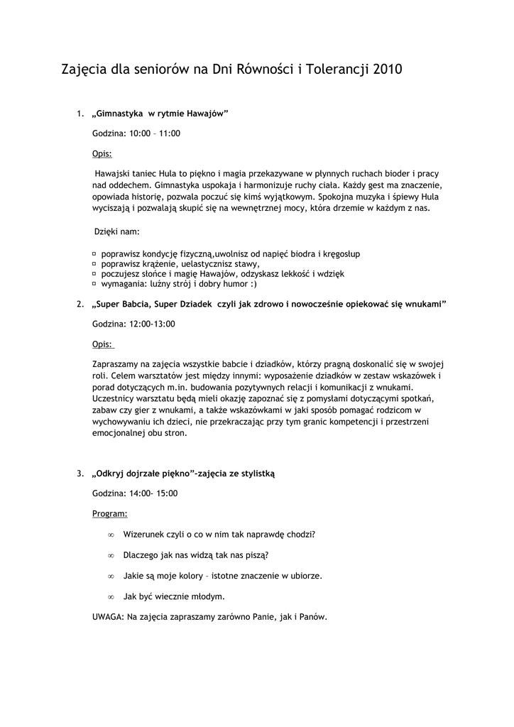 Zajęcia dla seniorów na Dni Równości i Tolerancji 2010 1. „Gimnastyka w rytmie Hawajów” Godzina: 10:00 – 11:00 Opis: Hawajski taniec Hula to piękno i magia przekazywane w płynnych ruchach bioder i pracy nad oddechem. Gimnastyka uspokaja i harmonizuje ruchy ciała. Każdy gest ma znaczenie, opowiada historię, pozwala poczuć się kimś wyjątkowym. Spokojna muzyka i śpiewy Hula wyciszają i pozwalają skupić się na wewnętrznej mocy, która drzemie w każdym z nas. Dzięki nam: poprawisz kondycję fizyczną,uwolnisz od napięć biodra i kręgosłup poprawisz krążenie, uelastycznisz stawy, poczujesz słońce i magię Hawajów, odzyskasz lekkość i wdzięk wymagania: luźny strój i dobry humor :) 2. „Super Babcia, Super Dziadek czyli jak zdrowo i nowocześnie opiekować się wnukami” Godzina: 12:00-13:00 Opis: Zapraszamy na zajęcia wszystkie babcie i dziadków, którzy pragną doskonalić się w swojej roli. Celem warsztatów jest między innymi: wyposażenie dziadków w zestaw wskazówek i porad dotyczących m.in. budowania pozytywnych relacji i komunikacji z wnukami. Uczestnicy warsztatu będą mieli okazję zapoznać się z pomysłami dotyczącymi spotkań, zabaw czy gier z wnukami, a także wskazówkami w jaki sposób pomagać rodzicom w wychowywaniu ich dzieci, nie przekraczając przy tym granic kompetencji i przestrzeni emocjonalnej obu stron. 3. „Odkryj dojrzałe piękno”–zajęcia ze stylistką Godzina: 14:00- 15:00 Program: • Wizerunek czyli o co w nim tak naprawdę chodzi? • Dlaczego jak nas widzą tak nas piszą? • Jakie są moje kolory – istotne znaczenie w ubiorze. • Jak być wiecznie młodym. UWAGA: Na zajęcia zapraszamy zarówno Panie, jak i Panów. 4. „Porady komputerowe czyli komputer to nie czarna magia” Godzina: 16:00-17:00 Opis: Chcesz kupić komputer, ale nie wiesz na co zwrócić uwagę? Chcesz poznać porady jak dobrze korzystać z komputera? Masz pytania, na które nie możesz uzyskać odpowiedzi? Poznaj sprzęty komputerowe dla seniorów. Nie daj sobie wmówić, że komputer nie jest dla Ciebie! 5. Wolontariat drugiej młodości Godzina: 18:00-19:00 Opis: Jak skutecznie spożytkować czas pomagając innym? Jakie korzyści płyną z wolontariatu? Gdzie szukać możliwości zaangażowania się? 6. „Wieczorek filmowy przy ciasteczku” Godzina: 19:00 – 21:00 Zapraszamy na wieczorek z niespodzianką filmową. Spotkanie przy kawie i ciastku będzie okazją do miłego spędzenia wieczoru i nawiązania nowych znajomości. Po filmie przewidujemy burzliwe dyskusje i dużo usmiechów