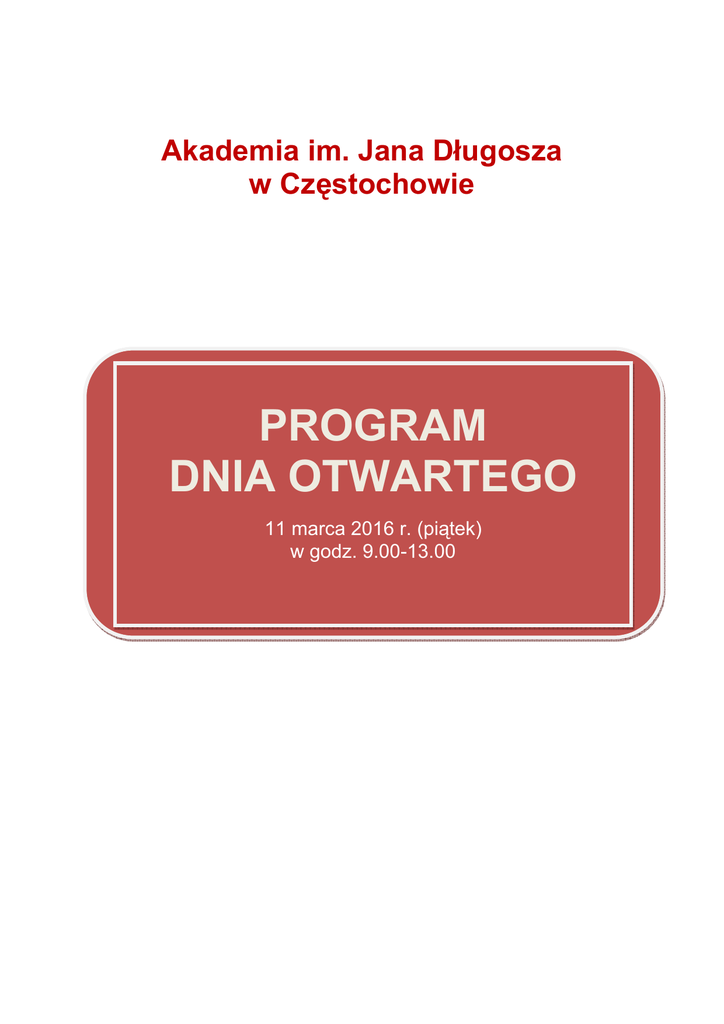 Akademia im. Jana Długosza w Częstochowie PROGRAM DNIA OTWARTEGO 11 marca 2016 r. (piątek) w godz. 9.00-13.00 Wydział Matematyczno- Przyrodniczy Instytut Edukacji Technicznej i Bezpieczeństwa Tytuł prezentacji: Miejsce realizacji „Pokazy pierwszej pomocy” budynek przy ul. Zbierskiego 2/4 Pokazy nowoczesnych urządzeń peryferyjnych – drukarka 3D i inne sala A-108 al. Armii Krajowej 13/15 Instytut Chemii i Ochrony Środowiska Zajęcia laboratoryjne Budynek przy al. Armii Krajowej 13/15 „Fascynujący świat bakterii” –– mgr Monika Lemańska, mgr Agnieszka Godela Grupy 12 osobowe – konieczność wcześniejszej rezerwacji miejsc. Zgłoszenia proszę składać pod numerem tel. 343784361 do 7 marca 2016 r. sala 0015 godz. 10.00 godz. 12.00 „Magia DNA” –– dr Magdalena Myga-Nowak , mgr Tomasz Głąb Grupy 12 osobowe – konieczność wcześniejszej rezerwacji miejsc. Zgłoszenia proszę składać pod numerem tel. 343784361 do 7 marca 2016 r. “Od alchemii do chemii współczesnej” – wybrane doświadczenia chemiczne i ich przekorne interpretacje - dr Andrzej Wręczycki Grupy 12 osobowe – konieczność wcześniejszej rezerwacji miejsc. Zgłoszenia proszę składać pod numerem tel. 343784361 do 7 marca 2016 r. „Co w szklance wody piszczy – chemiczni detektywi” – dr Krystyna Giełzak-Koćwin Grupy 12 osobowe – konieczność wcześniejszej rezerwacji miejsc. Zgłoszenia proszę składać pod numerem tel. 343784361 do 7 marca 2016 r. ”Wiem, co jem!” – rola składników Ŝywności i ich oznaczanie –dr Przemysław Siemion Grupy 12 osobowe – konieczność wcześniejszej rezerwacji miejsc. Zgłoszenia proszę składać pod numerem tel. 343784361 do 7 marca 2016 r. „Zawartość cukru w cukrze”– dr Małgorzata Szyrej Grupy 12 osobowe – konieczność wcześniejszej rezerwacji miejsc. Zgłoszenia proszę składać pod numerem sala 0008 godz. 11.00 godz. 12.00 sala 231 godz. 10.00 godz. 12.00 133 sala godz. 11.00 godz. 12.00 sala 212 godz. 10.00 godz. 12.00 sala 42 godz. 10.00 godz. 11.00 tel. 343784361 do 7 marca 2016 r. Wykłady popularno-naukowe - dla grup max 50 osobowych Najgroźniejsze bakterie świata – dr Katarzyna Bandurska – Zgłoszenia proszę składać pod numerem tel. 343784361 do 7 marca 2016 r. Podkręcony mózg – działanie neurotransmiterów i substancji odurzających - dr Agnieszka Berdowska Zgłoszenia proszę składać pod numerem tel. 343784361 do 7 marca 2016 r. Budynek przy al. Armii Krajowej 13/15 - sala 139 godz.10.00 – sala 234 godz. 10.00 Rośliny lecznicze – sprzymierzeńcy człowieka – pogadanka - dr Renata Musielińska Zgłoszenia proszę składać pod numerem tel. 343784361 do 7 marca 2016 r. Cała prawda o wampirach – dr Dominika Olszewska Zgłoszenia proszę składać pod numerem tel. 343784361 do 7 marca 2016 r. - sala 139 godz.11.00 – sala 234 godz.11.00 Instytut Matematyki i Informatyki Tytuł prezentacji: Czy kwadrat moŜe być kulą? - dr hab. Małgorzata Wróbel wykład - grupa do 50 osób Zgłoszenia proszę składać pod numerem tel. 343784361 do 7 marca 2016 r. Tworzenie wirtualnej rzeczywistości z uŜyciem grafiki komputerowej - dr Artur Gola - warsztaty – grupa 12 osób – konieczność wcześniejszej rezerwacji miejsc Zgłoszenia proszę składać pod numerem tel. 343784361 do 7 marca 2016 r. Webbesigner, webbedeveloper czy webmaster? Kim chciałbyś być? - mgr inŜ. Jacek Małek wykład - grupa do 50 osób Budynek B1 przy al. Armii Krajowej 13/15 sala AB3012 godz. 10.00 sala AB3018 godz. 10.00 sala AB3002 godz. 11.00 Zgłoszenia proszę składać pod numerem tel. 343784361 do 7 marca 2016 r. Tajemnica światła w fotografii - mgr Olga Cegielska wykład - grupa do 50 osób sala AB3002 godz. 10.00 Zgłoszenia proszę składać pod numerem tel. 343784361 do 7 marca 2016 r. Portret modelowany światłem – sesja w studio fotograficznym - mgr Olga Cegielska - warsztaty - grupa 16 osób – konieczność wcześniejszej rezerwacji miejsc Zgłoszenia proszę składać pod numerem tel. 343784361 do 7 marca 2016 r. sala AB3011 11.00 -13.00 Prezentacja Laboratorium Badań Eksperymentalnych BIOFEEDBACK - dr Paweł Borkowski - grupa do 20 osób pokój 1001 godz. 10:00 – 13:00 – konieczność wcześniejszej rezerwacji miejsc Zgłoszenia proszę składać pod numerem tel. 343784361 do 7 marca 2016 r. Instytut Fizyki Budynek B1 przy al. Armii Krajowej 13/15 Tytuł prezentacji Pokazy z fizyki: - Źródła energii elektrycznej – grupa do 100 osób sala 1023 9:00 - 10:00 - Czym jest światło? – grupa do 100 osóbProwadzący: dr Zygmunt Olesik 10:00 - 11:00 Zgłoszenia proszę składać pod numerem tel. 343784361 do 7 marca 2016 r Pokazy w Planetarium: czwarte piętro - Tajemnica Gwiazdy Betlejemskiej – grupa do 50 osób - Lodowe Krainy – grupa do 50 osób - Dwa Szkiełka – grupa do 50 osób - Cuda Wszechświata – grupa do 50 osób Prowadzący: dr Bogdan Wszołek 9:00 - 10:00 10:00 - 11:00 11:00 - 12:00 12:00 - 13:00 – konieczność wcześniejszej rezerwacji miejsc Zgłoszenia proszę składać pod numerem tel. 343784361 do 7 marca 2016 r MoŜliwość obejrzenia (usłyszenia) komory bezechowej Prowadzący: dr Rafał Miedziński sala 2021 Zgłoszenia proszę składać pod numerem tel. 343784361 do 7 marca 2016 r. 9:00-13:00 Wykład pt.”Dźwięki i decybele” – grupa do 70 osób Prowadzący: dr Rafał Miedziński Budynek B1 przy al. Armii Krajowej 13/15 sala 015, 9:00-9:45 Zgłoszenia proszę składać pod numerem tel. 343784361 do 7 marca 2016 r. Wydział Filologiczno-Historyczny Instytut Filologii Obcych Budynek przy ul. Zbierskiego 2/4 Tytuł prezentacji: „Tłumaczenia symultaniczne a konsekutywne – cóŜ to takiego? Pogimnastykuj się z nami - Brain workout” 45-minutowe warsztaty z tłumaczeń konsekutywnych i symultanicznych oraz mnemotechnik, sala 0.14 godz. 9.30-10.30 Zgłoszenia proszę składać pod numerem tel. 343784361 do 7 marca 2016 r. „Nie taki 45-minuto