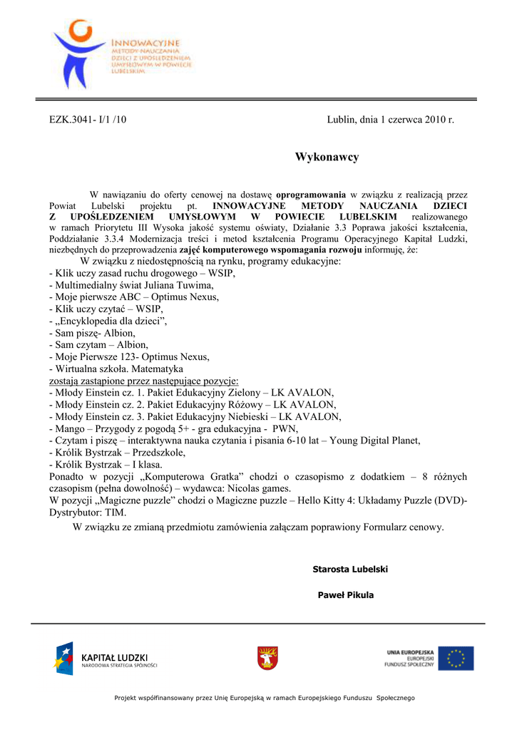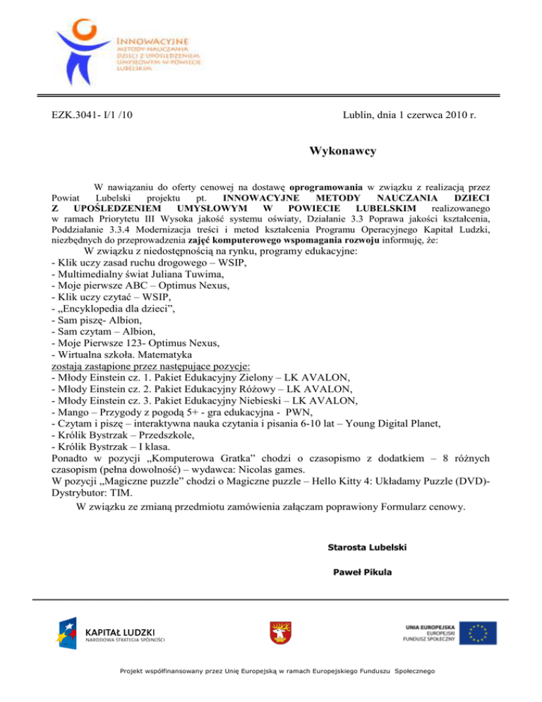EZK.3041- I/1 /10 Lublin, dnia 1 czerwca 2010 r. Wykonawcy W nawiązaniu do oferty cenowej na dostawę oprogramowania w związku z realizacją przez Powiat Lubelski projektu pt. INNOWACYJNE METODY NAUCZANIA DZIECI Z UPOŚLEDZENIEM UMYSŁOWYM W POWIECIE LUBELSKIM realizowanego w ramach Priorytetu III Wysoka jakość systemu oświaty, Działanie 3.3 Poprawa jakości kształcenia, Poddziałanie 3.3.4 Modernizacja treści i metod kształcenia Programu Operacyjnego Kapitał Ludzki, niezbędnych do przeprowadzenia zajęć komputerowego wspomagania rozwoju informuję, Ŝe: W związku z niedostępnością na rynku, programy edukacyjne: - Klik uczy zasad ruchu drogowego – WSIP, - Multimedialny świat Juliana Tuwima, - Moje pierwsze ABC – Optimus Nexus, - Klik uczy czytać – WSIP, - „Encyklopedia dla dzieci”, - Sam piszę- Albion, - Sam czytam – Albion, - Moje Pierwsze 123- Optimus Nexus, - Wirtualna szkoła. Matematyka zostają zastąpione przez następujące pozycje: - Młody Einstein cz. 1. Pakiet Edukacyjny Zielony – LK AVALON, - Młody Einstein cz. 2. Pakiet Edukacyjny RóŜowy – LK AVALON, - Młody Einstein cz. 3. Pakiet Edukacyjny Niebieski – LK AVALON, - Mango – Przygody z pogodą 5+ - gra edukacyjna - PWN, - Czytam i piszę – interaktywna nauka czytania i pisania 6-10 lat – Young Digital Planet, - Królik Bystrzak – Przedszkole, - Królik Bystrzak – I klasa. Ponadto w pozycji „Komputerowa Gratka” chodzi o czasopismo z dodatkiem – 8 róŜnych czasopism (pełna dowolność) – wydawca: Nicolas games. W pozycji „Magiczne puzzle” chodzi o Magiczne puzzle – Hello Kitty 4: Układamy Puzzle (DVD)Dystrybutor: TIM. W związku ze zmianą przedmiotu zamówienia załączam poprawiony Formularz cenowy. Starosta Lubelski Paweł Pikula Projekt współfinansowany przez Unię Europejską w ramach Europejskiego Funduszu Społecznego Strona 2 z Strona 3 z