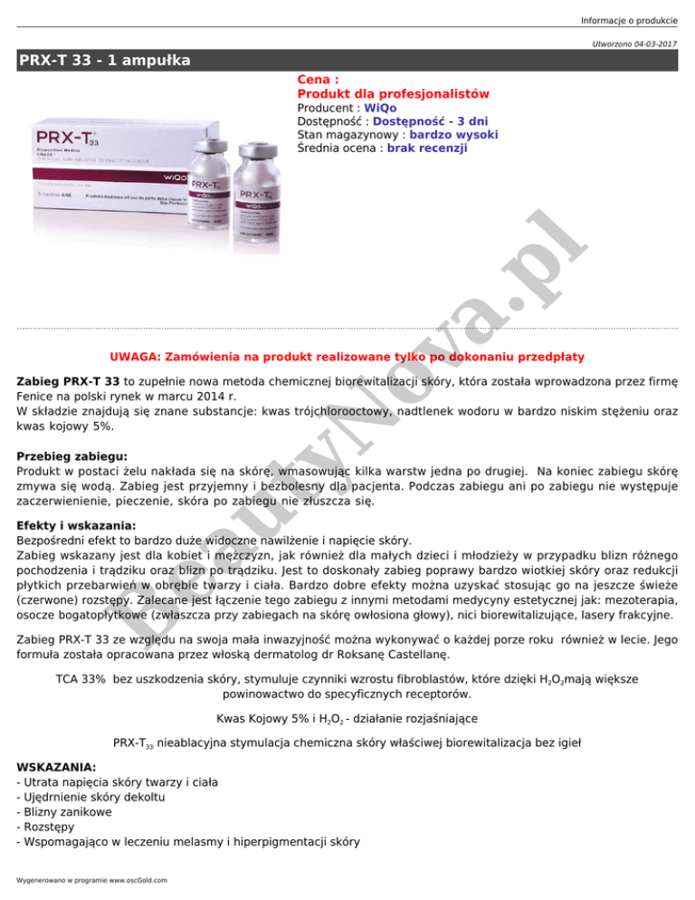 Informacje o produkcie Utworzono 04-03-2017 PRX-T 33 - 1 ampułka Cena : Produkt dla profesjonalistów ov a. pl Producent : WiQo Dostępność : Dostępność - 3 dni Stan magazynowy : bardzo wysoki Średnia ocena : brak recenzji UWAGA: Zamówienia na produkt realizowane tylko po dokonaniu przedpłaty yN Zabieg PRX-T 33 to zupełnie nowa metoda chemicznej biorewitalizacji skóry, która została wprowadzona przez firmę Fenice na polski rynek w marcu 2014 r. W składzie znajdują się znane substancje: kwas trójchlorooctowy, nadtlenek wodoru w bardzo niskim stężeniu oraz kwas kojowy 5%. ut Przebieg zabiegu: Produkt w postaci żelu nakłada się na skórę, wmasowując kilka warstw jedna po drugiej. Na koniec zabiegu skórę zmywa się wodą. Zabieg jest przyjemny i bezbolesny dla pacjenta. Podczas zabiegu ani po zabiegu nie występuje zaczerwienienie, pieczenie, skóra po zabiegu nie złuszcza się. B ea Efekty i wskazania: Bezpośredni efekt to bardzo duże widoczne nawilżenie i napięcie skóry. Zabieg wskazany jest dla kobiet i mężczyzn, jak również dla małych dzieci i młodzieży w przypadku blizn różnego pochodzenia i trądziku oraz blizn po trądziku. Jest to doskonały zabieg poprawy bardzo wiotkiej skóry oraz redukcji płytkich przebarwień w obrębie twarzy i ciała. Bardzo dobre efekty można uzyskać stosując go na jeszcze świeże (czerwone) rozstępy. Zalecane jest łączenie tego zabiegu z innymi metodami medycyny estetycznej jak: mezoterapia, osocze bogatopłytkowe (zwłaszcza przy zabiegach na skórę owłosiona głowy), nici biorewitalizujące, lasery frakcyjne. Zabieg PRX-T 33 ze względu na swoja mała inwazyjność można wykonywać o każdej porze roku również w lecie. Jego formuła została opracowana przez włoską dermatolog dr Roksanę Castellanę. TCA 33% bez uszkodzenia skóry, stymuluje czynniki wzrostu fibroblastów, które dzięki H2O2mają większe powinowactwo do specyficznych receptorów. Kwas Kojowy 5% i H2O2 - działanie rozjaśniające PRX-T33 nieablacyjna stymulacja chemiczna skóry właściwej biorewitalizacja bez igieł WSKAZANIA: - Utrata napięcia skóry twarzy i ciała - Ujędrnienie skóry dekoltu - Blizny zanikowe - Rozstępy - Wspomagająco w leczeniu melasmy i hiperpigmentacji skóry Wygenerowano w programie www.oscGold.com PRX-T33 zabieg mało inwazyjny dla pacjenta - Biorewitalizacja bez użycia igieł - TCA bez ryzyka frostu - Nie jest bolesny - Bez długiej rekonwalescencji - Nie jest fotouczulający można wykonywać również w lecie - Prosty i krótki do protokół zabiegowy do 10-15 minut PRX-T33 jest dobrym zabiegiem jako: - Pierwszy zabieg w medycynie estetycznej dla niezdecydowanego pacjenta - Zabieg połączony z wypełnianiem kwasem hialuronowym (poprawia efekt zabiegu wypełniania) - Zabieg, który poprawia efekty innych procedur medycyny estetycznej jak nici, mikronakłuwanie, itp. B ea ut yN ov a. pl PRX-T33 jest zabiegiem przeznaczonym dla obu płci, w każdym wieku o wszystkich porach roku: 5-12 lat - blizny (ospa wietrzna, liszajec) 12-25 lat - zastępuje oczyszczanie twarzy (wygładza skórę i ułatwia redukcję zaskórników) 25-35 lat - melasma - rozstępy 35-45 lat - biorewitalizacja twarzy - biorewitaliazcja ciała - profilaktyka procesu starzenia się skóry - zwiotczenie skóry biustu >45 lat - korekcja zwiotczałej skóry - poprawa jędrności skóry dekoltu i biustu