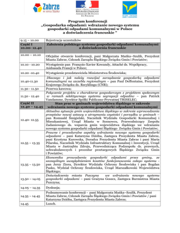 Program konferencji ,,Gospodarka odpadami: wdrażanie nowego systemu gospodarki odpadami komunalnymi w Polsce a doświadczenia francuskie ” 9.15 – 10.00 Część I 10.00- 12.40 Rejestracja uczestników Założenia polskiego systemu gospodarki odpadami komunalnymi a doświadczenia francuskie 10.00 – 10.10 Oficjalne otwarcie konferencji, pani Małgorzata Mańka–Szulik, Prezydent Miasta Zabrze, Członek Zarządu Śląskiego Związku Gmin i Powiatów; 10.10 - 10.20 Wystąpienie pan François-Xavier Kowandy, Attaché ds. Współpracy, Ambasada Francji w Polsce; 10.20 -10.40 Wystąpienie przedstawiciela Ministerstwa Środowiska; Dlaczego i jak należy rozwijać zarządzanie gospodarką odpadami komunalnymi na szczeblu regionalnym – pan Paul Deffontaine, Prezydent Krajowego Związku ds. Recyklingu (CNR); 11.30 - 11.50 Przerwa kawowa; Połączenie projektu o charakterze gospodarczym z projektem społecznym 11.50 - 12.40 w ramach selektywnego systemu segregacji odpadów – pan Patrick Vandamme, Dyrektor Spółki Publiczno-Prywatnej TRISELEC; Część II Stan prac w gminach województwa śląskiego w zakresie 12.40 – 14.45 wdrażania nowego systemu gospodarki odpadami komunalnymi Aktualna sytuacja gmin województwa śląskiego w zakresie wprowadzania przepisów nowej ustawy o utrzymaniu czystości i porządku w gminach – pan Romuald Śmigielski, Naczelnik Wydziału Gospodarki Komunalnej i 12.40- 12.55 Mieszkaniowej, Urząd Miasta w Sosnowcu, Przewodniczący Zespołu Zadaniowego ds. wsparcia gmin województwa śląskiego we wdrażaniu nowego systemu gospodarki odpadami Śląskiego Związku Gmin i Powiatów; Prawne i proceduralne aspekty wdrażania nowego systemu gospodarki odpadami – pani Katarzyna Dzióba, Zastępca Prezydenta Miasta Zabrze, pani Krystyna Kurowska, Doradca Prezydenta Miasta Zabrze i pani Maria 12.55 – 13.35 Pilarska, Naczelnik Wydziału Infrastruktury Komunalnej i Inwestycji, Urząd Miasta w Jastrzębiu Zdroju, Przewodnicząca Podzespołu ds. prawnych, uchwałodawczych i procedur przetargowych Śląskiego Związku Gmin i Powiatów; Ekonomika prowadzenia gospodarki odpadami przez gminy, ze szczególnym uwzględnieniem kosztów funkcjonowania całego systemu 13.35 – 13.50 pan Jerzy Ziora, Dyrektor Wydziału Ochrony Środowiska i pan Bogdan Pasko, Wydział Ochrony Środowiska, Urząd Marszałkowski Województwa Śląskiego; Doświadczenia miasta Pszczyna we wdrażaniu nowego systemu 13.50 – 14.05 gospodarki odpadami – pani Grażyna Goszcz, Zastępca Burmistrza Miasta Pszczyna; 10.40-11.30 14.05 – 14.35 14.35 – 14.45 14.45 Dyskusja; Podsumowanie konferencji - pani Małgorzata Mańka–Szulik, Prezydent Miasta Zabrze, Członek Zarządu Śląskiego Związku Gmin i Powiatów / pani Katarzyna Dzióba, Zastępca Prezydenta Miasta Zabrze; Lunch.