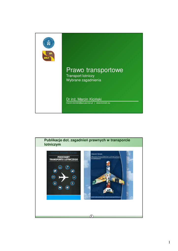 Prawo transportowe Transport lotniczy Wybrane zagadnienia Dr inż. Marcin Kiciński [email protected] | www.kicinski.eu Publikacje dot. zagadnień prawnych w transporcie lotniczym 2 1 Agenda 1. Wprowadzenie • Specyfika transportu lotniczego • Zarys historyczny prawa w transporcie lotniczym 2. Konwencja chicagowska 3. Wolności lotnicze 4. Organizacje i instytucje lotnicze • Podział i klasyfikacje • Charakterystyka 3 1. Wprowadzenie – specyfika transportu lotniczego 1. Najbardziej „umiędzynarodowiona” gałąź transportu 2. Transport wymagający wysokich nakładów kapitałowych i wysoko wykwalifikowanej kadry (piloci, obsługa naziemna) 3. Wielość przepisów prawnych na świecie • Na poziomie globalnym • Na poziomie regionalnym • Na poziomie rządów krajowych i lokalnych 4 2 1. Wprowadzenie – specyfika transportu lotniczego Interakcje pomiędzy ustawodawcami Rys. Chakuu S. i in. (2012) 5 1. Wprowadzenie – zarys historyczny prawa 1. 1889 rok - Kongres Aeronautyczny przy Powszechnej Wystawie Międzynarodowej w ParyŜu 2. 1904 rok – pierwsze odnotowane naruszenia przestrzeni powietrznej obcego państwa (zestrzelenie balonu) 3. 1914-1918 rok – pierwsze uŜycie lotnictwa do celów bojowych 4. 1919 rok – Konwencja Paryska • Zasada suwerenności przestrzeni powietrznej • Zasada przynaleŜności państwowej i rejestracji • Kwalifikacje załóg • Warunki wykonywania lotów • Powołała do Ŝycia CINA (Międzynarodową Komisję ds. śeglugi Powietrznej) 5. 1926 rok – Konwencja Iberoamerykańska (Hiszpania, Portugalia, Meksyk, Paragwaj, Kostaryka, Dominikana) 6. 1928 rok – Konwencja Hawańska (Ameryka Północna i Środkowa) 6 3 1. Wprowadzenie – zarys historyczny prawa 7. 8. 1929 rok – Konwencja Warszawska: Konwencja o ujednoliceniu niektórych prawideł dotyczących międzynarodowego przewozu lotniczego • Definicja transportu MN • Wprowadzenie pojęcia dokumentów przewozowych • Odpowiedzialność za szkody w transporcie lotniczym • Po II WŚ wprowadzono poprawki (Protokół Haski – 1955 rok, Konwencja Guadalajarska – 1961 rok) • Najstarsza obowiązująca konwencja międzynarodowego prawa lotniczego 1933 rok – Konwencja Sanitarna w Hadze 1941 i 1944 – poprawki • • Oficjalnie obowiązuje do dziś; w praktyce przepisy WHO (1951) 7 1. Wprowadzenie – zarys historyczny prawa 9. 1933 rok – Konwencje Rzymskie: „O zajęciu zabezpieczającym statków powietrznych” – dot. roszczeń cywilnych • – • Zmodyfikowana w 1963 roku „W sprawie szkód wyrządzonych na powierzchni ziemi” – Zastąpiona konwencja z 1952 roku – – – Uzupełniona przez Protokół Montrealski z 1978 roku Ratyfikowana przez 5 państwa Szkody o jakich traktowała konwencja są regulowane za pomocą przepisów regionalnych 8 4 1. Wprowadzenie – zarys historyczny prawa 10. 1944 rok – Konferencja Międzynarodowego Lotnictwa Cywilnego (Chicago) – Układ tymczasowy o lotnictwie cywilnym (MN) – od 1944 do 1947 (PICAO – Tymczasowa Międzynarodowa Organizacja Lotnictwa Cywilnego) • Konwencja o Międzynarodowym Lotnictwie Cywilnym • Utworzenie ICAO – International Civil Aviation Organization (Międzynarodowa Organizacja Lotnictwa Cywilnego) • Układ o tranzycie międzynarodowych słuŜb powietrznych – „Układ o dwóch wolnościach” • Układ o międzynarodowym przewozie powietrznym – „Układ o pięciu wolnościach” – – początkowo 12 państw/ do 2001 roku 187/ Polska 1958 r. zastępowała konwencje paryską, iberoamerykańską i panamerykańską) 9 1. Wprowadzenie – zarys historyczny prawa 11. 1955 rok – Protokół haski • Poprawka do konwencji warszawskiej • Podnosił górna granice odpowiedzialności przewodnika na wypadek śmierci lub obraŜeń cielesnych pasaŜera • Złagodził wymagania dotyczące dokumentów przewozowych 12. 1961 rok – Konwencja guadalajarska • Uzupełnienie do konwencji warszawskiej • Regulacja kwestii eksploatacji zamiennej statków powietrznych i wzajemnego wyręczania się przez przewoźników • Regulacja (uzupełnienie) dotycząca międzynarodowego przewozu lotniczego wykonywanego przez osobę inna niŜ przewoźnik umowy 10 5 1. Wprowadzenie – zarys historyczny prawa 13. 1963 rok – Konwencja tokijska: „O zapobieganiu porwaniom samolotów i bezprawnym czynom na pokładzie” • Jurysdykcja nad sprawcami czynów zabronionych (państwo rejestracji statku powietrznego; zmiana – umowa dwustronna) • Zezwolenie na rewizje bagaŜu osobistego • Załoga dostała prawo do ograniczania wolności pasaŜera i zastosowania środków przymusu do punktu lądowania 14. 1970 rok – Konwencja haska: „O zwalczaniu bezprawnego zawładnięcia statkami powietrznymi” • Jednoznaczna definicja zjawiska porwania – zagroŜenia dla bezpieczeństwa ruchu lotniczego • Państwo ma obowiązek osądzenia i skazania porywacza • Regulacje kwestii wydania porywacze organom ścigania jego kraju macierzystego • Uzupełnienia: protokoły montrealskie: 1971, 1975, 1988 11 1. Wprowadzenie – zarys historyczny prawa 15. 1999 rok – Konwencja montrealska : „O ujednoliceniu niektórych prawideł dotyczących międzynarodowego przewozu lotniczego” • Ujednolicenie postanowień konwencji warszawskiej, protokołu haskiego i konwencji guadalkarajskiej • Regulacja nowych metod organizacji przelotów, dostępów do systemów elektronicznych rezerwacji, odpowiedzialności za szkody, metody jurysdykcji tych szkód 12 6 1. Wprowadzenie Ogół norm prawnych obowiązujących w polskim lotnictwie cywilnym jest zawarty przede wszystkim w ustawie z dnia 3 lipca 2002 r. – Prawo lotnicze (Dz. U. z 2006 r. Nr 100, poz. 696, z późn. zm.). Ustawa określa zadania i kompetencje organów lotnictwa cywilnego w zakresie współpracy międzynarodowej. 13 1. Wprowadzenie – Ustawa – Prawo lotnicze Ustawa określa: 1. stosunek polskiego prawa lotniczego do umów międzynarodowych 2. zwierzchnictwo 