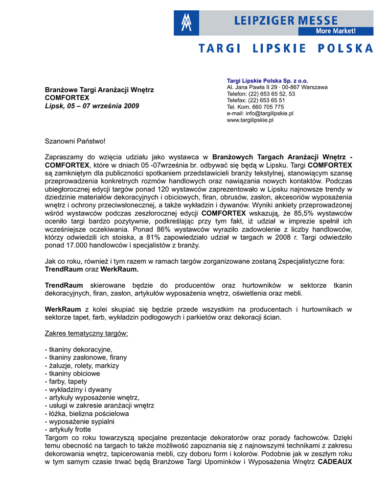 Branżowe Targi Aranżacji Wnętrz COMFORTEX Lipsk, 05 – 07 września 2009 Targi Lipskie Polska Sp. z o.o. Al. Jana Pawła II 29 · 00-867 Warszawa Telefon: (22) 653 65 52, 53 Telefax: (22) 653 65 51 Tel. Kom. 660 705 775 e-mail: [email protected] www.targilipskie.pl Szanowni Państwo! Zapraszamy do wzięcia udziału jako wystawca w Branżowych Targach Aranżacji Wnętrz COMFORTEX, które w dniach 05 -07września br. odbywać się będą w Lipsku. Targi COMFORTEX są zamkniętym dla publiczności spotkaniem przedstawicieli branży tekstylnej, stanowiącym szansę przeprowadzenia konkretnych rozmów handlowych oraz nawiązania nowych kontaktów. Podczas ubiegłorocznej edycji targów ponad 120 wystawców zaprezentowało w Lipsku najnowsze trendy w dziedzinie materiałów dekoracyjnych i obiciowych, firan, obrusów, zasłon, akcesoriów wyposażenia wnętrz i ochrony przeciwsłonecznej, a także wykładzin i dywanów. Wyniki ankiety przeprowadzonej wśród wystawców podczas zeszłorocznej edycji COMFORTEX wskazują, że 85,5% wystawców oceniło targi bardzo pozytywnie, podkreślając przy tym fakt, iż udział w imprezie spełnił ich wcześniejsze oczekiwania. Ponad 86% wystawców wyraziło zadowolenie z liczby handlowców, którzy odwiedzili ich stoiska, a 81% zapowiedziało udział w targach w 2008 r. Targi odwiedziło ponad 17.000 handlowców i specjalistów z branży. Jak co roku, również i tym razem w ramach targów zorganizowane zostaną 2specjalistyczne fora: TrendRaum oraz WerkRaum. TrendRaum skierowane będzie do producentów oraz hurtowników w sektorze dekoracyjnych, firan, zasłon, artykułów wyposażenia wnętrz, oświetlenia oraz mebli. tkanin WerkRaum z kolei skupiać się będzie przede wszystkim na producentach i hurtownikach w sektorze tapet, farb, wykładzin podłogowych i parkietów oraz dekoracji ścian. Zakres tematyczny targów: - tkaniny dekoracyjne, - tkaniny zasłonowe, firany - żaluzje, rolety, markizy - tkaniny obiciowe - farby, tapety - wykładziny i dywany - artykuły wyposażenie wnętrz, - usługi w zakresie aranżacji wnętrz - łóżka, bielizna pościelowa - wyposażenie sypialni - artykuły frotte Targom co roku towarzyszą specjalne prezentacje dekoratorów oraz porady fachowców. Dzięki temu obecność na targach to także możliwość zapoznania się z najnowszymi technikami z zakresu dekorowania wnętrz, tapicerowania mebli, czy doboru form i kolorów. Podobnie jak w zeszłym roku w tym samym czasie trwać będą Branżowe Targi Upominków i Wyposażenia Wnętrz CADEAUX oraz Dni Zegarków i Biżuterii MIDORA. Połączenie imprez o zbliżonej tematyce pozwoli wystawcom na nawiązanie interesujących kontaktów z większą liczbą handlowców. Dla polskiej branży tekstyliów domowych oraz wyposażenia wnętrz targi COMFORTEX stanowią doskonałą okazję do zaprezentowania swojej oferty jak z najlepszej strony na rynku niemieckim. W ciągu zaledwie trzech dni umożliwiają dotarcie do różnych grup odbiorców i pozwalają na zawieranie umów handlowych w trakcie ich trwania. Koszt wynajmu 1 m2 stoiska przy zamówieniu powierzchni ekspozycyjnej jest następujący: stoisko szeregowe 72,00 Euro + 19% VAT stoisko narożne 77,00 Euro + 19% VAT stoisko czołowe 82,00 Euro + 19% VAT Obowiązkowy wpis do katalogu wynosi: 130,00 Euro + 19% VAT Specjalna oferta dla firm wystawiających się po raz pierwszy na targach COMFORTEX: Organizatorzy targów przygotowali dla polskich firm bardzo korzystną finansowo ofertę zabudowanych stoisk w następujących cenach: stoisko 9m2 w cenie 1.400,00 euro, + 19% VAT stoisko 12 m2 w cenie 1.700,00 euro, + 19% VAT stoisko 15 m2 w cenie 2.000,00 euro. + 19% VAT Powyższe ceny obejmują wynajem powierzchni +standardową zabudowę stoiska (ściany działowe, napis na fryzie, oświetlenie, wykładzina, stolik okrągły, 2 krzesła, podłączenie do prądu oraz wpis do katalogu). Istnieje możliwość odpłatnego zamówienia dodatkowego wyposażenia stoiska. Udział w targach i bezpośrednie rozmowy z kontrahentami podczas ich trwania to najlepsza droga do poszerzenia rynku zbytu, a co się z tym wiąże do zbudowania wizerunku własnej marki. Jeśli są Państwo zainteresowani zaprezentowaniem swojej oferty na targach COMFORTEX 2009 w Lipsku, prosimy o kontakt z naszym Przedstawicielstwem. Termin zgłoszeń: do 15 czerwca br. Z poważaniem Marzena Kuropieska Targi Lipskie Polska Sp. z o.o