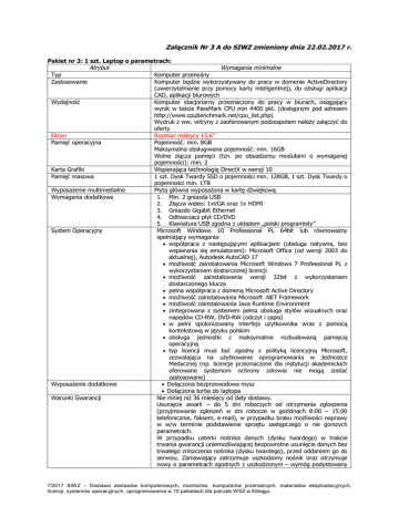 Załącznik Nr 3 A do SIWZ zmieniony dnia 22.02.2017 r. Pakiet nr 3: 1 szt. Laptop o parametrach: Atrybut Wymagania minimalne Typ Komputer przenośny Zastosowanie Komputer będzie wykorzystywany do pracy w domenie ActiveDirectory (uwierzytelnianie przy pomocy karty inteligentnej), do obsługi aplikacji CAD, aplikacji biurowych Wydajność Komputer stacjonarny przeznaczony do pracy w biurach, osiągający wynik w teście PassMark CPU min 4400 pkt. (dostępnym pod adresem http://www.cpubenchmark.net/cpu_list.php) Wydruk z ww. witryny z zaoferowanym podzespołem należy załączyć do oferty Ekran Rozmiar matrycy 15,6” Pamięć operacyjna Pojemność: min. 8GB Maksymalna obsługiwana pojemność: min. 16GB Wolne złącza pamięci (tzn. po obsadzeniu modułami o wymaganej pojemności): min. 2 Karta Grafiki Wspierająca technologię DirectX w wersji 10 Pamięć masowa 1 szt. Dysk Twardy SSD o pojemności min. 128GB, 1 szt. Dysk Twardy o pojemności min. 1TB Wyposażenie multimedialne Płyta główna wyposażona w kartę dźwiękową Wymagania dodatkowe 1. Min. 2 gniazda USB 2. Złącza wideo: 1xVGA oraz 1x HDMI 3. Gniazdo Gigabit Ethernet 4. Odtwarzacz płyt CD/DVD 5. Klawiatura USB zgodna z układem „polski programisty” System Operacyjny Microsoft Windows 10 Professional PL 64bit lub równoważny spełniający wymagania: współpraca z następującymi aplikacjami (obsługa natywna, bez wspierania się emulatorem): Microsoft Office (od wersji 2003 do aktualnej), Autodesk AutoCAD 17 możliwość zainstalowania Microsoft Windows 7 Professional PL z wykorzystaniem dostarczonej licencji możliwość zainstalowania wersji 32bit z wykorzystaniem dostarczonego klucza pełna współpraca z domeną Microsoft Active Directory możliwość zainstalowania Microsoft .NET Framework możliwość zainstalowania Java Runtime Environment zintegrowana z systemem pełna obsługa stylów wizualnych oraz napędów CD-RW, DVD-RW (odczyt i zapis) w pełni spolonizowany interfejs użytkownika wraz z pomocą kontekstową w języku polskim obsługa jednostki z maksymalnie rozbudowaną pamięcią operacyjną typ licencji musi być zgodny z polityką licencyjną Microsoft, zezwalająca na użytkowanie oprogramowania w Jednostce Medycznej (np. licencje przeznaczone dla instytucji akademickich oferowane systemom ochrony zdrowia nie mogą zostać zastosowane) Wyposażenie dodatkowe Dołączona bezprzewodowa mysz Dołączona torba do laptopa Warunki Gwarancji Nie mniej niż 36 miesięcy od daty dostawy. Usunięcie awarii – do 5 dni roboczych od otrzymania zgłoszenia (przyjmowanie zgłoszeń w dni robocze w godzinach 8:00 – 15:00 telefonicznie, faksem, e-mail), w przypadku braku możliwości naprawy w w/w terminie podstawienie sprzętu zastępczego o nie gorszych parametrach. W przypadku usterki nośnika danych (dysku twardego) w trakcie trwania gwarancji uniemożliwiającej bezpowrotne usunięcie danych bez trwałego zniszczenia nośnika (dysku twardego), przed oddaniem go do serwisu, Zamawiający zatrzymuje uszkodzony nośnik oraz otrzymuje nowy o parametrach zgodnych z uszkodzonym – wymóg podyktowany 7/2017 SIWZ – Dostawa zestawów komputerowych, monitorów, komputerów przenośnych, materiałów eksploatacyjnych, licencji, systemów operacyjnych, oprogramowania w 10 pakietach dla potrzeb WSZ w Elblągu. koniecznością wyeliminowania możliwości wycieku danych wrażliwych, które mogą być na ww. nośniku przechowywane. 7/2017 SIWZ – Dostawa zestawów komputerowych, monitorów, komputerów przenośnych, materiałów eksploatacyjnych, licencji, systemów operacyjnych, oprogramowania w 10 pakietach dla potrzeb WSZ w Elblągu.