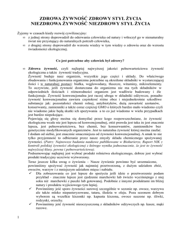ZDROWA ŻYWNOŚĆ ZDROWY STYL ŻYCIA NIEZDROWA ŻYWNOŚĆ NIEZDROWY STYL ŻYCIA Żyjemy w czasach kiedy rozwój cywilizacyjny: • z jednej strony doprowadził do oderwania człowieka od natury i wtłoczył go w nienaturalny świat nie przystający do naturalnych potrzeb człowieka, • z drugiej strony doprowadził do wzrostu wiedzy w tym wiedzy o zdrowiu oraz do wzrostu świadomości ekologicznej. Co jest potrzebne aby człowiek był zdrowy? • 1 Zdrowa żywność, czyli najlepiej najwyższej jakości pełnowartościowa żywność ekologiczna a także żywność tradycyjna. Żywność buduje nasz organizm, wszystkie jego części i układy. Do właściwego zbudowania i funkcjonowania organizmu potrzebne są określone składniki w wystarczającej ilości i w naturalnej postaci: białka, węglowodany, tłuszcze, witaminy, mikroelementy. To oczywiste, jeśli żywność dostarczana do organizmu nie ma tych składników w odpowiednich ilościach i różnorodności organizm jest wadliwie budowany i źle funkcjonuje. Żywność konwencjonalna jest raczej uboga w składniki odżywcze, ponadto żywność konwencjonalna zawiera częstokroć różne obce i niejednokrotnie szkodliwe substancje jak: pozostałości chemii rolnej, antybiotyków, dużą zawartość azotanów, konserwanty, zamienniki a także coraz częściej GMO o których bardzo mało wiadomo czyli nie wiadomo jakie będą skutki ich spożywania a to co już wiadomo w wielu przypadkach jest bardzo niepokojące. Pojawiają się głosy można się domyślać przez kogo rozpowszechniane, że żywność ekologiczna wcale nie jest lepsza od konwencjonalnej, otóż prawda jest taka że jest znacznie lepsza, jest pełnowartościowa, bez chemii, bez konserwantów, zamienników bez genetycznie modyfikowanych organizmów. Jest to naturalna żywność której można zaufać. I dodam od siebie, jest znacznie smaczniejsza od żywności konwencjonalnej. A smak to nie tylko przyjemność to odbieranie przez nasze zmysły składu chemicznego spożywanej żywności. (Patrz: Najnowsze badania naukowe publikowane w Biokurierze, Raport NIK z kontroli polskiej żywności ekologicznej z którego wynika jednoznacznie, że jest to żywność najwyższej klasy, pewna i pełnowartościowa). Podsumowując najlepiej jest wybrać produkt rolnictwa ekologicznego, dobrze jest wybrać produkt tradycyjny uczciwie wytworzony. Teraz jeszcze kilka uwag o żywieniu – Nasze żywienie powinno być urozmaicone, powinniśmy spożywać żywność jak najmniej przetworzoną, z dużym udziałem zbóż, owoców, warzyw i z mniejszym udziałem mięsa i nabiału. Dla zobrazowania co jest lepsze do spożycia jeśli idzie o przetworzenie podam przykład - znacznie lepsze jest zjedzenie marchewki lub świeżo wyciśniętego z niej soku niż marchewki z puszki lub gotowanej. Podobnie z innymi produktami im bliżej natury i produktu wyjściowego tym lepiej. Powinniśmy jeść sporo żywności surowej szczególnie w sezonie np. owoce, warzywa ale także mleko niepasteryzowane, tatara, śledzia w oleju. Poza sezonem dobrym wyborem są wszelkie kiszonki np. kapusta kiszona, owoce suszone np. śliwki, rodzynki, orzechy. Powinniśmy jeść żywność nieoczyszczoną z składników odżywczych np. kasze, mąki razowe. Powinniśmy jeść żywność gotowaną a nie smażoną. Sól należy używać oszczędnie i naturalną a do słodzenia miód lub cukier brązowy. Nie muszę już przypominać, że najlepiej by było gdyby wszystkie te produkty były ekologiczne lub tradycyjnie wytworzone z pewnego źródła. Ponadto są liczne zalecenia innego typu co do żywności np.: Musi być zachowana równowaga zasadowo-kwasowa w żywności czyli zrównoważone spożywanie pokarmów zasadotwórczych np. pełnych zbóż, warzyw, fasoli i kwasotwórczych np. mięsa, nabiału. Nie należy łączyć w jednym posiłku nieodpowiednich pokarmów np. skrobi z białkiem czyli np. ziemniaków i chleba z mięsem. Powinno się także dobierać odpowiednie typy pokarmów do swojej grupy krwi itp. Kolejna kwestia. Żywność to podstawowe dobro od którego zależy nasze zdrowie. Oczywistym zatem jest że powinno się kupować, spożywać najlepszą, najzdrowszą żywność. Tymczasem tak nie jest, powszechnie spożywa się żywność miernej jakości, niepełnowartościową lub bywa, że nawet szkodliwą. Pytanie dlaczego tak jest? Ano przede wszystkim dlatego, że jest niska świadomość tego jaką żywność jemy a jaką powinniśmy jeść, jaka żywność jest dla nas dobra a jaka niedobra. Z powyższym łączy się kwestia wieloletnich zaniedbań edukacyjnych w temacie zdrowej żywności, przez całe lata agendy rządowe odpowiedzialne za zdrowie społeczeństwa w tym za zdrowe odżywianie nie robiły nic w tym temacie. Dopiero niedawno zaistniały adekwatne kampanie informacyjne krajowe i europejskie . Ale kto z Państwa słyszał o krajowej i europejskiej kampanii informacyjnej nt. rolnictwa i żywności ekologicznej? I tu mamy kolejny problem, mimo wielomilionowych nakładów upowszechnienie tych tematów jest nikłe, w przypadku krajowej kampanii można wręcz mówić o niegospodarności i zmarnowaniu szansy. Jednocześnie wmówiono ludziom, że ważniejsze są dla nich inne dobra niż żywność. Dlatego wielu ludzi woli kupić nowy samochód, telewizor itp. niż zadbać o swoje zdrowie poprzez dobrą żywność. Trzeba jeszcze poruszyć temat kosztów ekologicznej, czy tradycyjnej żywności, bywa, że są produkty znacznie droższe od żywności konwencjonalnej, dotyczy to szczególnie mięs i wędlin. Ale liczne produkty nie są znacząco droższe jak np. mąki, kasze, makarony, warzywa, owoce, fasole a te właśnie produkty powinny być spożywane w największej ilości. Zatem odżywianie ekologiczne w sumie wcale nie jest dużo droższe a sprzyja wydatnie zdrowiu, czyli odpadają koszty i uciążliwości związane z licznymi schorzeniami. Ponadto kupując żywność ekologiczną bezpośrednio od ro