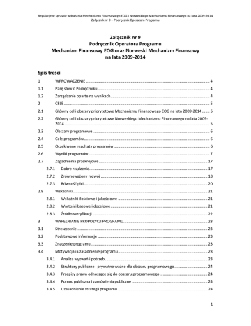 Regulacje w sprawie wdrażania Mechanizmu Finansowego EOG i Norweskiego Mechanizmu Finansowego na lata 2009-2014 Załącznik nr 9 – Podręcznik Operatora Programu Załącznik nr 9 Podręcznik Operatora Programu Mechanizm Finansowy EOG oraz Norweski Mechanizm Finansowy na lata 2009-2014 Spis treści 1 WPROWADZENIE .................................................................................................................... 4 1.1 Parę słów o Podręczniku ......................................................................................................... 4 1.2 Zarządzanie oparte na wynikach............................................................................................. 4 2 CELE......................................................................................................................................... 5 2.1 Główny cel i obszary priorytetowe Mechanizmu Finansowego EOG na lata 2009-2014 ....... 5 2.2 Główny cel i obszary priorytetowe Norweskiego Mechanizmu Finansowego na lata 20092014 ........................................................................................................................................ 5 2.3 Obszary programowe.............................................................................................................. 6 2.4 Cele programów...................................................................................................................... 6 2.5 Oczekiwane rezultaty programów .......................................................................................... 6 2.6 Wyniki programów.................................................................................................................. 7 2.7 Zagadnienia przekrojowe...................................................................................................... 17 2.7.1 Dobre rządzenie............................................................................................................... 17 2.7.2 Zrównoważony rozwój .................................................................................................... 18 2.7.3 Równość płci .................................................................................................................... 20 2.8 Wskaźniki .............................................................................................................................. 21 2.8.1 Wskaźniki ilościowe i jakościowe .................................................................................... 21 2.8.2 Wartości bazowe i docelowe........................................................................................... 21 2.8.3 Źródło weryfikacji ............................................................................................................ 22 3 WYPEŁNIANIE PROPOZYCJI PROGRAMU............................................................................... 23 3.1 Streszczenie........................................................................................................................... 23 3.2 Podstawowe informacje ....................................................................................................... 23 3.3 Znaczenie programu ............................................................................................................. 23 3.4 Motywacja i uzasadnienie programu.................................................................................... 23 3.4.1 Analiza wyzwań i potrzeb ................................................................................................ 23 3.4.2 Struktury publiczne i prywatne ważne dla obszaru programowego ............................... 24 3.4.3 Przepisy prawa odnoszące się do obszaru programowego............................................. 24 3.4.4 Pomoc publiczna i zamówienia publiczne ....................................................................... 24 3.4.5 Uzasadnienie strategii programu .................................................................................... 24 1 Regulacje w sprawie wdrażania Mechanizmu Finansowego EOG i Norweskiego Mechanizmu Finansowego na lata 2009-2014 Załącznik nr 9 – Podręcznik Operatora Programu 3.5 Cele i wskaźniki programu .................................................................................................... 24 3.5.1 Cel programu (oczekiwany wpływ).................................................................................. 25 3.5.2 Oczekiwany rezultat programu ....................................................................................... 25 3.5.3 Wyniki programu ............................................................................................................. 25 3.5.4 Wskaźniki, weryfikacja i wartości bazowe ....................................................................... 25 3.6 Grupy docelowe programu ................................................................................................... 26 3.7 Ryzyko i niepewność ............................................................................................................. 26 3.8 Stosunki dwustronne ............................................................................................................ 27 3.8.1 Partnerzy programu z krajów-darczyńców...................................................................... 27 3.8.2 Projekty partnerskie z darczyńcami................................................................................. 27 3.9 Projekty predefiniowane....................................................................................................... 28 3.10 Fundusze małych grantów .................................................................................................... 28 3.11 Zagadnienia przekrojowe...................................................................................................... 28 3.12 Monitorowanie projektów przez Operatora Programu.......................