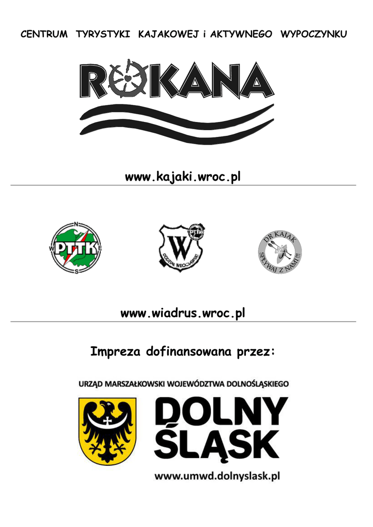 CENTRUM TYRYSTYKI KAJAKOWEJ i AKTYWNEGO WYPOCZYNKU www.kajaki.wroc.pl www.wiadrus.wroc.pl Impreza dofinansowana przez: XII Zimowy Spływ Kajakowy „Pożegnanie Zimy” Ślęza 2013 REGULAMIN SPŁYWU 1. Organizator: Oddział Wrocławski PTTK – WKW „WIADRUS” 2. Współorganizatorzy: Centrum Turystyki Kajakowej i Aktywnego Wypoczynku ROKANA, Wrocław PHU DR KAJAK, Św. Katarzyna 3. Patronat honorowy: Urząd Marszałkowski Województwa Dolnośląskiego 4. Cel imprezy: popularyzacja szlaków kajakowych okolic Wrocławia uczczenie Światowego Dnia Wody upowszechnianie zimowej turystyki kajakowej integracja dolnośląskiego środowiska turystów kajakowych poznanie Muzeum Powozów w Galowicach 5. Kierownictwo spływu: Komandor: Bożena Siczek, IRR nr 7408/I/R/2002, IT PZKaj. II st. nr 2310 sekretariat: Bożena Siczek, obsługa z lądu: Jacek Jasiński pilot początkowy: Marek Nawracaj, Zygmunt Mizgalski pilot końcowy: Andrzej Pawlak służba medyczna: Małgorzata Kułach służba techniczna: Henryk Grygiel, zaplecze żywieniowe: Muzeum w Galowicach 6. Termin i trasa: 23 marca 2013 r., Borów (most na Ślęzie przy wodowskazie) – Galowice, 16 km 7. Program szczegółowy spływu: sobota, 23 marca 2013 8:00 – spotkanie na przystani przy ul. Rzeźbiarskiej, załadunek kajaków i dalszy ciąg weryfikacji uczestników 8:45 – wyjazd autokaru z uczestnikami do wsi Borów na miejsce startu 9:40 – przygotowanie kajaków do wodowania na miejscu startu 10:00 – uroczyste otwarcie spływu i topienie Marzanny 10:15 – start do etapu Borów – Galowice (Muzeum Powozów) 14:00- planowane przypłyniecie na metę, pakowanie sprzętu i przejscie do Muzeum Powozów od 14.30 do 16.30 – wydawanie ciepłego posiłku i zwiedzanie z przewodnikiem Muzeum Powozów 15:30 – wyjazd busa po samochody prywatne pozostawione na starcie 16:30 – uroczyste zakończenie spływu 17:30- wyjazd autokaru do Wrocławia 8. Warunki uczestnictwa: Impreza ma charakter otwarty. W spływie mogą wziąć udział osoby pełnoletnie, umiejące pływać, które do dnia 16 marca zgłoszą swój udział na Karcie Uczestnictwa oraz opłacą stosowne wpisowe. Uczestnicy płyną na własną odpowiedzialność, potwierdzając ten fakt na Oświadczeniu (druk organizatora). Osoby niepełnoletnie płyną po przedstawianiu pisemnej zgody rodziców (druk organizatora) i pod opieką osoby dorosłej, która bierze odpowiedzialność za niepełnoletniego. Wszyscy uczestnicy płyną bezwarunkowo w kamizelkach asekuracyjnych. Każdy uczestnik musi posiadać na wodzie zapasowy komplet ubrań zabezpieczony przed zamoczeniem oraz zaleca się mieć dodatkowy zestaw na przebranie po spływie Uczestnicy podporządkowują się Regulaminowi spływu i zarządzeniom Kierownictwa spływu. UWAGA! Trasa spływu wiedzie przez tereny wodonośne Wrocławia – wymagana duża dyscyplina obowiązkowa przenoska jazu w Pasterzycach lewym brzegiem ( jeśli pilot początkowy tak zdecyduje) 9. Zgłoszenia do imprezy: Przyjmowane wyłącznie na Karcie Uczestnictwa przesłanej na e-mail: [email protected] lub dostarczonej osobiście Sekretariat spływu czynny: 12.03.13 – Rynek- Ratusz 11/12, klub PTTK, godz. 18:00 -19:00 19.03.10 – przystań PTTK, ul. Rzeźbiarska 6, godz. 16.30 -18:00 23.03.10- przystań PTTK, ul. Rzeźbiarska 6, godz. 8:00 - 8:30 10. Wpisowe: 40 zł – członkowie klubu WIADRUS oraz na własnym sprzęcie korzystający z transportu 55 zł – pozostali uczestnicy 30 zł – uczestnicy z własnym kajakiem i dojazdem na miejsce startu 30 zł – osoby towarzyszące korzystające z wyżywienia i wejścia do Muzeum w Galowicach należy wpłacać osobiście w sekretariacie spływu lub przelewem na konto: Oddział Wrocławski PTTK, 50-106 Wrocław, Rynek-Ratusz 11/12 BZ WBK I/O Wrocław, nr 19 1090 2398 0000 0006 0827 5667 z dopiskiem „WKW Wiadrus” Pożegnanie zimy 2010 11. Świadczenia organizatora: miejsce w turystycznym kajaku dwuosobowym z wiosłem i kamizelką asekuracyjną dowóz osób i kajaków z przystani PTTK na miejsce startu przewóz kierowców po samochody na miejsce startu po spływie ciepły posiłek na mecie (talon), herbata, chleb ze smalcem ubezpieczenie uczestników wklejka do książeczki turystycznych odznak kajakowych opieka pilota-przewodnika, ratownika, pomoc techniczna pierwsza pomoc medyczna bilet wstępu do zwiedzania Muzeum Powozów w Galowicach zaplecze sanitarna po spływie 12. Obowiązki uczestników: podporządkowanie się Regulaminowi oraz uzasadnionym poleceniom Kierownictwa spływu przedstawienie w Sekretariacie spływu dokumentów: dowodu osobistego (legitymacji szkolnej), dowodu opłaty wpisowego oraz innych wskazanych przez organizatora udzielanie pomocy uczestnikom na trasie w razie potrzeby niezanieczyszczanie trasy spływu nieużywanie napojów alkoholowych przed i w trakcie płynięcia !!! skompletowanie wyposażenia osobistego we własnym zakresie Każdy uczestnik musi posiadać na wodzie zapasowy komplet ubrań zabezpieczony przed zamoczeniem. Zaleca się zabranie na kajak palm wielkanocnych Wszyscy uczestnicy płyną bezwarunkowo w kamizelkach asekuracyjnych Telefon alarmowy w razie nieprzewidzianych zdarzeń na wodzie 112 13. 14. Postanowienia końcowe: W zależności od nieprzewidzianych okoliczności Organizator zastrzega sobie prawo do dokonania zmian w programie spływu Organizator może odwołać spływ w części lub całości ze względu na niesprzyjające warunki atmosferyczne (ulewny deszcz, niski stan wody, pokrywa lodowa itp.); w takim przypadku uczestnikom przysługuje zwrot wpisowego pomniejszonego o już poniesione przez organizatora koszty w szczególności Organizator rezerwuje sobie prawo do zmiany trasy spływu w przypadku złych warunków atmosferycznych osoby nieprzestrzegające Regulaminu spływu bądź norm współżycia międzyludzkiego mogą być wydalone ze spływu bez prawa do zwrotu wpisowego uczestnicy odpowiadają materialnie za szkody wyrządzone przez siebie w trakc