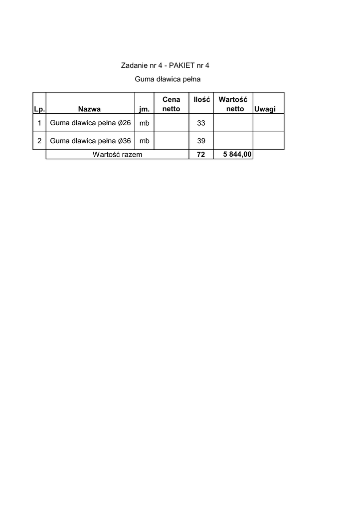 Zadanie nr 4 - PAKIET nr 4 Guma dławica pełna Cena netto Ilość Lp. Nazwa jm. 1 Guma dławica pełna Ø26 mb 33 2 Guma dławica pełna Ø36 mb 39 Wartość razem 72 Wartość netto Uwagi 5 844,00