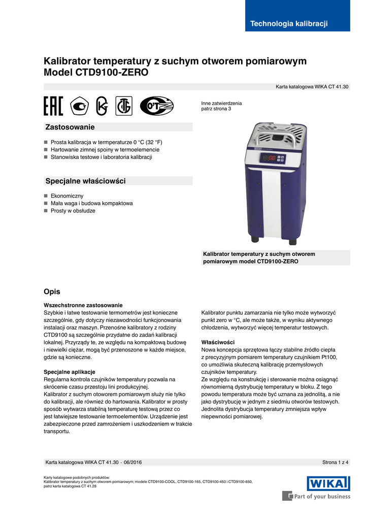 Technologia kalibracji Kalibrator temperatury z suchym otworem pomiarowym Model CTD9100-ZERO Karta katalogowa WIKA CT 41.30 Inne zatwierdzenia patrz strona 3 Zastosowanie ■■ Prosta kalibracja w termperaturze 0 °C (32 °F) ■■ Hartowanie zimnej spoiny w termoelemencie ■■ Stanowiska testowe i laboratoria kalibracji Specjalne właściowści ■■ Ekonomiczny ■■ Mała waga i budowa kompaktowa ■■ Prosty w obsłudze Kalibrator temperatury z suchym otworem pomiarowym model CTD9100-ZERO Opis Wszechstronne zastosowanie Szybkie i łatwe testowanie termometrów jest konieczne szczególnie, gdy dotyczy niezawodności funkcjonowania instalacji oraz maszyn. Przenośne kalibratory z rodziny CTD9100 są szczególnie przydatne do zadań kalibracji lokalnej. Przyrządy te, ze względu na kompaktową budowę i niewielki ciężar, mogą być przenoszone w każde miejsce, gdzie są konieczne. Specjalne aplikacje Regularna kontrola czujników temperatury pozwala na skrócenie czasu przestoju lini produkcyjnej. Kalibrator z suchym otoworem pomiarowym służy nie tylko do kalibracji, ale również do hartowania. Kalibrator w prosty sposób wytwarza stabilną temperaturę testową przez co jest łatwiejsze testowanie termoelementów. Urządzenie jest zabezpieczone przed zamrożeniem i uszkodzeniem w trakcie transportu. Kalibrator punktu zamarzania nie tylko może wytworzyć punkt zero w °C, ale może także, w wyniku aktywnego chłodzenia, wytworzyć więcej temperatur testowych. Właściwości Nowa koncepcja sprzętowa łączy stabilne źródło ciepła z precyzyjnym pomiarem temperatury czujnikiem Pt100, co umożliwia skuteczną kalibrację przemysłowych czujników temperatury. Ze względu na konstrukcję i sterowanie można osiągnąć równomierną dystrybucję temperatury w bloku. Z tego powodu temperatura może być uznana za jednolitą, a nie jako dystrybucję w jednym z siedmiu otworów testowych. Jednolita dystrybucja temperatury zmniejsza wpływ niepewności pomiarowej. Karta katalogowa WIKA CT 41.30 ∙ 06/2016 Karty katalogowe podobnych produktów: Kalibrator temperatury z suchym otworem pomiarowym; modele CTD9100-COOL, CTD9100-165, CTD9100-450 i CTD9100-650, patrz karta katalogowa CT 41.28 Strona 1 z 4 Łatwa obsługa Kalibrator CTD9100-ZERO jest produkowany zgodnie z najnowocześniejszym stanem wiedzy, odnośnie dokładności pomiaru, funkcjonalności oraz bezpieczeństwa działania sprzętu. Pozycja robocza została określona jako pionowa, gdyż w tym ustawieniu zostaje osiągnięta optymalna dystrybucja temperatury. Temperatura kalibracji, regulowana jest za pomocą zaledwie Dane techniczne Wyświetlacz Dla zapewnienia wygodnego odczytu ekran temperatury jest nie tylko duży, ale także nachylony pod kątem 35°. CTD9100-ZERO Zakres temperatury -10 … 0 … +100 °C (14 ... 32 ... 212 °F) Dokładność 0,05 K w 0 °C (32 °F) zazwyczaj 0,1 K 1) Stabilność 2) Rozdzielczość Rozkład temperatury Gradient, osiowy 3) Hartowanie < 0,05 K 0,1 °C < 0,05 K Czas ogrzewania 15 min od -10 °C do +100 °C (od 14 °F do 212 °F) Czas chłodzenia 5 min od 23 °C do 0 °C (od 73 °F do 14 °F) 10 min od 100 °C do 0 °C (od 212 °F do14 °F) Czas stabilizacji4) Metalowy blok w zależności od sposobu użytkowania i obszaru zastosowania Głębokość zanurzenia 150 mm (5,91") Otwór testowy 7 otworów o Ø 6,5 mm (0,26") Materiał bloku aluminium Zasilanie Zasilanie 5) AC 100 ... 240 V, 50/60 Hz Pobór mocy 225 VA Bezpiecznik 3,15 A zabezpieczający przed przepaleniem (przy AC 250 V) Kabel zasilania sieciowego dla Europy, AC 230 V Komunikacja Interfejs Obudowa 1) 2) 3) 4) 5) dwóch przycisków na kontrolerze, bardzo szybko może być sprawdzona. Rzeczywiste i nastawione temperatury podgrzewanego bloku są równocześnie wyświetlane na dużym 4-cyfrowym ekranie LED o wysokim kontraście. W ten sposób zostają prawie całkowicie wyeliminowane błędy odczytu. RS-485 Wymiary (dł. x szer. x wys.) 160 x 230 x 320+50 mm (6,3 x 9,1 x 12,6+2 ") Waga 7 kg (15,5 lbs) Jest definiowana jako błąd pomiarowy pomiędzy wartością pomiarową a wartością referencyjną. Maksymalna różnica temperatury w temperaturze stabilnej przez 30 minut. W tym przypadku gradient oznacza zmienność temperatury w testowym otworze powyżej pierwszych 40 mm od końcówki wkładki. Czas do osiągnięcia stabilnej wartości Zasilanie elektryczne 115 VAC musi być określone w zamówieniu, inaczej dostarczone będzie urządzenie z zasilaniem 230 VAC Niepewność pomiarowa jest definiowana jako całkowita niepewność pomiarowa (k = 2), która składa się z następujących części: dokładności, referencyjnej niepewności pomiarowej, stabilności i jednorodności. Strona 2 z 4 Karta katalogowa WIKA CT 41.30 ∙ 06/2016 Aprobaty Logo Opis Kraj Wspólnota Europejska Deklaracja zgodności WE ■■ Dyrektywa EMC1) EN 61326 emisja (grupa 1, klasa B) i odporność na zakłócenia (obszar przemysłowy) ■■ Dyrektywa niskonapięciowa EN 61010, potwierdzenie bezpieczeństwa elektrycznego dla urządzeń pomiarowych, sterujących i laboratoryjnych - EAC ■■ Kompatybilność elektromagnetyczna ■■ Dyrektywa niskonapięciowa Euroazjatycka Wspólnota Gospodarcza GOST Certyfikat metrologii/ techniki pomiaru Rosja KazInMetr Certyfikat metrologii/ techniki pomiaru Kazachstan MTSCHS Pozwolenie na uruchomienie Kazachstan BelGIM Certyfikat metrologii/ techniki pomiaru Białoruś Uzbekistan Certyfikat metrologii/ techniki pomiaru Uzbekistan Certyfikaty/ świadectwa Certyfikat Kalibracja Standardowo: certyfikat kalibracji 3.1 wg DIN EN 10204 Opcjonalnie: certyfikat kalibracji DKD/DAkkS Zalecane czasookresy rekalibracji 1 w roku (w zależności od używania urządzenia) Zatwierdzenia i certyfikaty dostępne są na stronie internetowej Wyświetlacz i panel sterowania ■■ W pamięci można zapisać do czterech często stosowanych wartości nastawy. ■■ Przycisk U służy do wyszukiwania zapamiętanych 1 2 3 temperatur