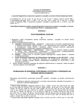 Uchwała Nr XXXVI/426/13 Rady Miasta Kędzierzyn-Koźle z dnia 25 kwietnia 2013 r. w sprawie Regulaminu utrzymania czystości i porządku na terenie Gminy Kędzierzyn-Koźle na podstawie art. 18 ust. 2 pkt. 15, art. 40 ust. 1 i art. 41 ust. 1 ustawy z dnia 8 marca 1990 r. 1) o samorządzie gminnym (Dz.U. z 2001 r. Nr 142, poz. 1591 z późn. zm. ) oraz art. 4 ustawy z dnia 13 września 1996r. o utrzymaniu czystości i porządku w gminach (Dz. U. z 2012 r. poz. 391 2) z późn. zm ), Rada Miasta Kędzierzyn-Koźle uchwala Regulamin utrzymania czystości i porządku na terenie Gminy Kędzierzyn-Koźle o następującej treści: ROZDZIAŁ I POSTANOWIENIA OGÓLNE §1 1. Regulamin ustala szczegółowe zasady utrzymania czystości i porządku na terenie Gminy Kędzierzyn-Koźle. 2. Ilekroć w regulaminie jest mowa o: 1) odpadach surowcowych (tzw. „suchych”) – należy przez to rozumieć wyselekcjonowane z odpadów komunalnych odpady suche, w tym opakowaniowe bez zawartości, takie jak w szczególności: metale żelazne i nieżelazne, papier, tworzywa sztuczne, opakowania wielomateriałowe; z wyłączeniem odpadów niebezpiecznych; 2) odpadach budowlanych i rozbiórkowych - należy przez to rozumieć odpady powstałe w trakcie prac budowlanych, remontowych i rozbiórkowych przeprowadzonych w gospodarstwach domowych indywidualnie przez mieszkańców; 3) Związku – należy przez to rozumieć Związek Międzygminny „Czysty Region” z siedzibą w Kędzierzynie-Koźlu; 4) Planie Gospodarki Odpadami dla Województwa Opolskiego na lata 2012-2017 – należy przez to rozumieć Plan Gospodarki Odpadami dla Województwa Opolskiego na lata 2012-2017 przyjęty uchwałą Sejmiku Województwa Opolskiego Nr XX/271/2012 z dnia 28 sierpnia 2012 roku; 3. Ilekroć niniejszy regulamin posługuje się pojęciami zdefiniowanymi w ustawach, należy te pojęcia rozumieć zgodnie z tymi definicjami. ROZDZIAŁ II WYMAGANIA W ZAKRESIE UTRZYMANIA CZYSTOŚCI I PORZĄDKU NA TERENIE NIERUCHOMOŚCI §2 Właściciele nieruchomości zapewniają utrzymanie czystości i porządku na terenie nieruchomości poprzez: 1) selektywne zbieranie wytwarzanych na terenie nieruchomości odpadów komunalnych, co najmniej w zakresie obejmującym: _____________________ 1) Zmiany tekstu jednolitego ogłoszone zostały w Dz.U. z 2002 r. Nr 23, poz. 220, Nr 62, poz. 558, Nr 113, poz. 984, Nr 153, poz. 1271, Nr 214, poz. 1806, z 2003 r. Nr 80, poz. 717, Nr 162, poz. 1568, z 2004 r. Nr 102, poz. 1055, Nr 116, poz. 1203, z 2005 r. Nr 172, poz. 1441, Nr 175, poz. 1457, z 2006 r. Nr 17, poz. 128, Nr 181, poz. 1337, Dz. U. z 2007 r. Nr 48 poz. 327, Nr 138 poz. 974, Nr 173 poz. 1218, Dz. U. z 2008 r. Nr 180 poz. 1111, Nr 223 poz. 1458, Dz. U. z 2009 r. Nr 52 poz. 420, Nr 157 poz. 1241, Dz. U. z 2010 r. Nr 28 poz. 142, Nr 28 poz. 146, Nr 106 poz. 675, Nr 40 poz. 230, Dz. U. z 2011 r. Nr 117 poz. 679, Nr 134 poz. 777, Nr 21 poz. 113, Nr 217 poz. 1281, Nr 149 poz. 887, Dz. U. z 2012 r. Nr 567 i Dz. U z 2013 r. poz.153. 2) ) Zmiany tekstu jednolitego ogłoszone zostały w Dz.U. z 2012r. poz. 951 i z 2013r. poz. 21 i poz. 228 1 a) b) c) d) e) f) 2) 3) papier, metale, tworzywa sztuczne, szkło opakowaniowe, opakowania wielomateriałowe, odpady komunalne ulegające biodegradacji, w tym odpady opakowaniowe ulegające biodegradacji, g) odpady zielone, h) przeterminowane leki i chemikalia, i) zużyte baterie i akumulatory, j) zużyty sprzęt elektryczny i elektroniczny, k) meble i inne odpady wielkogabarytowe, l) odpady budowlane i rozbiórkowe, m) zużyte opony, w sposób określony w § 3, przekazywanie selektywnie zebranych odpadów uprawnionym podmiotom prowadzącym działalność w zakresie odbierania odpadów komunalnych od właścicieli nieruchomości oraz podmiotom prowadzącym punkty selektywnego zbierania odpadów komunalnych lub przekazywanie odpowiednim podmiotom w trybie określonym przez właściwe przepisy, zbieranie niesegregowanych (zmieszanych) odpadów komunalnych i przekazywanie ich uprawnionym podmiotom prowadzącym działalność w zakresie odbierania odpadów komunalnych od właścicieli nieruchomości. §3 1. Właściciele nieruchomości zobowiązani są do zbierania i przekazywania do odbioru wskazanych poniżej odpadów w następujący sposób: 1) w zabudowie jednorodzinnej: a) odpady surowcowe (tzw. „suche”) – w osobnym worku, b) szkło opakowaniowe – w osobnym worku, c) odpady komunalne ulegające biodegradacji – w osobnym pojemniku, chyba, że prowadzone jest ich kompostowanie we własnym zakresie przy pomocy kompostowników przydomowych, d) niesegregowane (zmieszane) odpady komunalne – w osobnym pojemniku lub worku; 2) w zabudowie wielorodzinnej: a) odpady surowcowe (tzw. „suche”) – w osobnym pojemniku, b) szkło opakowaniowe – w osobnym pojemniku, c) niesegregowane (zmieszane) odpady komunalne – w osobnym pojemniku lub worku; 3) na terenie nieruchomości, na których nie zamieszkują mieszkańcy, a powstają odpady komunalne: a) odpady surowcowe (tzw. „suche”) – w osobnym pojemniku lub worku, b) szkło opakowaniowe – w osobnym pojemniku lub worku, c) niesegregowane (zmieszane) odpady komunalne – w osobnym pojemniku lub worku; 2. Meble i inne odpady wielkogabarytowe, zużyte opony, odpady zielone oraz odpady budowlane i rozbiórkowe, zużyty sprzęt eklektyczny i elektroniczny, odpady surowcowe (tzw. „suche”) oraz szkło opakowaniowe mieszkańcy, właściciele nieruchomości lub upoważniona przez właściciela nieruchomości jednostka, mogą dostarczyć do punktu selektywnego zbierania odpadów komunalnych. 3. Meble i inne odpady wielkogabarytowe, zużyte opony, zużyty sprzęt elektryczny i elektroniczny oraz odpady niebezpieczne mogą być odbierane w systemie akcyjnym §4 1. Z zastrzeżeniem ust. 2 właściciele nieruchomości położonych bezpośrednio wzdłuż chodników mają obowiązek uprzątnięcia błota, śniegu, lodu z części nieruchomości udostępnionej do użytku publiczn