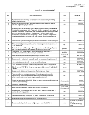 Załącznik nr 3 do Decyzji nr ……../2015 Cennik na pozostałe usługi Lp. 1 Wyszczególnienie Uzgodnienie dokumentacji lub opracowania przez jedną komórkę organizacyjną Spółki Uzgodnienie dokumentacji lub opracowania przez dwie lub więcej komórek organizacyjnych Spółki J.m. Cena [zł] szt. 146,00 zł szt. 302,00 zł 3 Wydanie opinii w zakresie odstępstwa od wymogów Rozporządzenie Ministra Infrastruktury z dnia 7 sierpnia 2008 r. w sprawie wymagań w zakresie odległości i warunków dopuszczających usytuowanie drzew i krzewów, elementów ochrony akustycznej i wykonywania robót ziemnych w sąsiedztwie linii kolejowej, a także sposobu urządzania i utrzymywania zasłon odśnieżnych oraz pasów przeciwpożarowych szt. 525,00 zł 4 Opracowanie tymczasowego regulaminu prowadzenia ruchu pociągów szt. 3 083,00 zł 5 Ustawienie i zdjęcie osygnalizowania miejsc ograniczenia prędkości ruchu pociągów kpl. 210,00 zł godzina 175,00 zł godzina 5 000,00 zł kurs do 15 osób 1 501,00 zł 2 6 7 Zamknięcie toru szlakowego - dotyczy czasów zamknięć zgodnych z tymczasowym regulaminem prowadzenia ruchu pociągów Zamknięcie toru szlakowego - dotyczy zamknięć wynikłych z niedotrzymania terminu planowanych zamknięć 8 Przeszkolenie pracowników wykonawcy w zakresie BHP 9 Opracowanie i wdrożenie rozkładu jazdy na czas zamknięć torowych szt. 2 967,00 zł 10 Informacja dla podróżnych o zmianie rozkładu jazdy szt. 2 374,00 zł 11 Koszt odwołania pociągu rozkładowego na całej trasie lub jej części szt. 3 274,00 zł 12 Zajęcie terenu PKP SKM Sp. z o.o. na czas robót (m.kw.X ilość dni X 2,80 zł) zl/m2 13 Opracowanie działki do Regulaminu Technicznego Stacji szt. 1 837,00 zł 14 Przeprowadzenie postępowania weryfikacyjnego wykonawców ubiegających się o uzyskanie upoważnienia do samodzielnego wykonywania czynności w czynnych urządzeniach srk szt. 93,00 zł 15 Zatrudnienie pracowników PKP SKM Sp. z o.o. do czynności na rzecz podmiotu zewnętrznego roboczogodz. 80,00 zł 16 Komisyjny odbiór robót roboczogodz. 91,00 zł 17 Sporządzenie i wydanie kopii dokumentacji technicznej ilość stron (formatu A4) 2,00 zł 18 Sprawdzenie i uzgodnienie regulaminu pracy bocznicy kolejowej aneksu do w/w regulaminu szt. 726,00 zł 19 Odwołanie zamknięć torowych, za jedno zamknięcie i odwołanie szt. 212,00 zł 20 Ustawienie i zdjęcie osygnalizowania zamknięcia toru. szt. 21 Czasowe udostępnienie pasa kolejowego o szerokości 1,0 m mb 85,00 zł 50,00 zł za pierwsze 100 m 11,00 zł za kolejny metr 2,80 zł Lp. 22 Wyszczególnienie Ograniczenie prędkości biegu pociągów w każdym z torów do 30km/h (za każdą rozpoczętą dobę) w rejonie realizowania robót. J.m. Cena [zł] godz. 280,00 zł (zgodnie z tymczasowym regulaminem prowadzenia robót, 559,00 zł za ograniczenia wynikłe z niedotrzymania terminu zaplaniowanych zamknięć, 1111,00 zł za nieplanowe ograniczenie wynikające z nieprzewidzianych okoliczności w trakcie robót. 140,00 zł (zgodnie z tymczasowym regulaminem prowadzenia robót, 280,00 zł za ograniczenia wynikłe z niedotrzymania terminu zaplaniowanych zamknięć, 547,00 zł za nieplanowe ograniczenie wynikające z nieprzewidzianych okoliczności w trakcie robót. 23 Ograniczenie prędkości biegu pociągów w każdym z torów od 31km/h do 50km/h (za każdą rozpoczętą dobę) w rejonie realizowania robót. godz. 24 Wydanie lub przedłużenie "zezwolenia" na pracę pojazdem trakcyjnym lub z pojazdem trakcyjnym oraz upoważnienie do wykonywania robót na torach PKP SKM szt. 56,00 zł 25 Nadzór pracowników Spółki nad robotami wykonywanymi na terenie PKP SKM przez wykonawców spoza Grupy PKP roboczogodz. 80,00 zł Lp. Wyszczególnienie J.m. Cena [zł] 26 Praca komisji przy szkoleniu pracowników Przewoźników w celu uzyskania znajomości szlaków lub poznania warunków miejscowych osoba 91,00 zł 27 Przeszkolenie pracowników, którzy będą wykonywać roboty w rejonie czynnych torów oraz innych urządzeń i obiektów kolejowych. osoba 91,00 zł 28 Zamknięcie toru stacyjnego - dotyczy zamknięć zgodnych z tymczasowym regulaminem prowadzenia ruchu godz. 80,00 zł 29 Zamknięcie toru stacyjnego - dotyczy zamknięć wynikłych z niedotrzymania terminu planowanych zamknięć godz. 2 500,00 zł 30 Wygłaszanie komunikatów megafonowych 31 Wypożyczenie wózka motorowego WM15 z żurawiem, bez przyczepy 1 mth 489,00 zł 32 Wypożyczenie wózka motorowego WM15 z żurawiem, z przyczepą i operatorem 1 mth 632,00 zł 1 komunikat 1,00 zł
