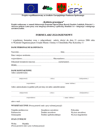 3URMHNWZVSyáILQDQVRZDQ\]HURGNyZ(XURSHMVNLHJR)XQGXV]X6SRáHF]QHJR „.RELHWDSUDFXMFD´ Projekt realizowany w ramach Sektorowego Programu Operacyjnego Rozwój Zasobów Ludzkich, Priorytet 1 – $NW\ZQD SROLW\ND U\QNX SUDF\ RUD] LQWHJUDFML ]DZRGRZHM L VSRáHF]QHM ']LDáDQLH ± ,QWHJUDFMD L UHLQWHJUDFMD zawodowa kobiet. )2508/$5==*à26=(1,2:< Z\SHáQLRQ\ IRUPXODU] ZUD] ] ]DáF]QLNDPL QDOH*\ ]áR*\ü GR GQLD F]HUZFD URNX w:\G]LDOH2UJDQL]DF\MQ\P8U] GX0LDVWDL*PLQ\Z&KPLHOQLNX3ODF.RFLHOQ\/ DANE PERSONALNE KANDYDATA 1D]ZLVNR,PL Data i miejsce urodzenia....................................................................................................................................... województwo................................................................. Obywatelstwo.............................................................. * 'RNXPHQWWR VDPR FLQD]ZDVHULDQXPHU PESEL................................................... DANE KONTAKTOWE Adres zameldowania: ……………………………………………………………………………………………………………………………… PLHMVFRZRüXOLFDNRGSRF]WRZ\ …………………………………………………………………………………………………..…………………………………………………………. (województwo) ( numer telefonu ) * $GUHV]DPLHV]NDQLDZ\SHáQLüMH OLMHVWLQQ\QL DGUHV]DPHOGRZDQLD ……………………………………………………………………………………………………………………………… PLHMVFRZRüXOLFDNRGSRF]WRZ\ …………………………………………………………………………………………………..………………………………………………………… (województwo) ( numer telefonu ) adres e-mail............................................................................................................................................................................ :<.6=7$à&(1,( 3URV] SRVWDZLü]QDN[SU]\Z\EUDQHMSR]\FML 1LHSHáQHSRGVWDZRZH Zasadnicze zawodowe Podstawowe Gimnazjalne UHGQLH]DZRGRZH UHGQLHRJyOQRNV]WDáFFH STAN CYWILNY Wolna *DWND 0 3URV] SRVWDZLü]QDN[SU]\Z\EUDQHMSR]\FML Policealne * * :\ V]H]DZRGRZH :\ V]HPDJLVWHUVNLH 3URMHNWZVSyáILQDQVRZDQ\]H URGNyZ(XURSHMVNLHJR)XQGXV]X6SRáHF]QHJR INFORMACJA O SYTUACJI ZAWODOWEJ * -HVWHPRVRE EH]URERWQ ]DUHMHVWURZDQ Z8U] G]LH3UDF\SU]H]RNUHVQLHNUyWV]\QL PLHVL F\ tak nie 3URV] SRVWDZLü]QDN[SU]\Z\EUDQHMSR]\FML -HOLWDNWRSURVLP\RGRáF]HQLH]DZLDGF]HQLD]3RZLDWRZHJR8U] GX3UDF\ ,1)250$&-$ 2 .25=<67$1,8 = 3202&< 0,(-6.2*0,11(*2 2 52'.$ 3202&< 632à(&=1(-:&+0,(/1,.8 &]\NRU]\VWDáD3DQLZURNX]SRPRF\0*236 tak nie -HOLWDNWRSURVLP\RGRáF]HQLH]DZLDGF]HQLD]0*236Z&KPLHOQLNX * 3UDZG]LZR üSRZ\ V]\FKGDQ\FKSRWZLHUG]DPZáDVQRU F]Q\PSRGSLVHP 'DWD,PL LQD]ZLVNR«««« Podpis kandydatki............................................................. 2 :,$'&=(1,(.$1'<'$7$ 2 ZLDGF]DP *H GHF\GXM VL QD XG]LDá Z SURMHNFLH Ä.RELHWD SUDFXMFD´ UHDOL]RZDQHJR Z UDPDFK 6HNWRURZHJR Programu Operacyjnego Rozwój Zasobów Ludzkich, Priorytet 1 – Aktywna polityka rynku pracy oraz integracji ]DZRGRZHMLVSRáHF]QHM']LDáDQLH±,QWHJUDFMDLUHLQWHJUDFMD]DZRGRZDNRELHW * :\UD DP ]JRG QD JURPDG]HQLH SU]HWZDU]DQLH L SU]HND]\ZDQLH PRLFK GDQ\FK RVRERZ\FK ]ELHUDQ\FK GR 3RGV\VWHPX 0RQLWRURZDQLD (XURSHMVNLHJR )XQGXV]X 6SRáHF]QHJR ]JRGQLH ] 8VWDZ ] GQLD VLHUSQLD U o ochronie danych osobowych Dz..U. Z 2002 r. Nr 101 poz. 926, ze zm.). * * :\UD DP UyZQLH ]JRG QD XG]LDá Z EDGDQLDFK DQNLHWRZ\FK NWyUH RGE G VL Z WUDNFLH L PF\ SR ]DNR F]HQLX XG]LDáXZ3URMHNFLH Podpis kandydatki .............................................................. 3RWZLHUG]DP]JRGQR üGDQ\FKQDSRGVWDZLHGRZRGXRVRELVWHJRVHULDQU Data.......................................... Podpis pracownika.............................................................. DECYZJA REKRUTACYJNA: Komisja Kwalifikacyjna ]DNZDOLILNRZDáDQLH]DNZDOLILNRZDáD QLHSRWU]HEQHVNUHOLü 3DQL «««««««««««««««««««««««««««««««««««««« GR XG]LDáXZSURMHNFLHÄ.RELHWDSUDFXM FD´ Uzasadnienie: kandydatka QLHSRWU]HEQHVNUHOLü VSHáQLD Z\PRJL NZDOLILNDF\MQH QLH VSHáQLD Z\PRJyZ NZDOLILNDF\MQ\FK oraz …………………………………………………………………………………….. ............................................................................................................................................................................... 'DWD3RGSLV\F]áRQNyZNRPLVMLUHNUXWDF\MQHM