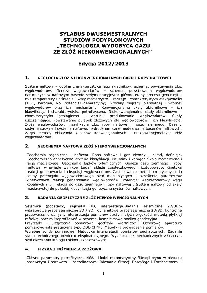 SYLABUS DWUSEMESTRALNYCH STUDIÓW PODYPLOMOWYCH „TECHNOLOGIA WYDOBYCA GAZU ZE ZŁÓŻ NIEKONWENCJONALNYCH” Edycja 2012/2013 1. GEOLOGIA ZŁÓŻ NIEKONWENCJONALNYCH GAZU I ROPY NAFTOWEJ System naftowy – ogólna charakterystyka jego składników; schemat powstawania złóż węglowodorów. Geneza węglowodorów – schemat powstawania węglowodorów naturalnych w naftowym basenie sedymentacyjnym; główne etapy procesu generacji – rola temperatury i ciśnienia. Skały macierzyste – rodzaje i charakterystyka efektywności (TOC, kerogen, Ro, potencjał generacyjny). Procesy migracji pierwotnej i wtórnej węglowodorów oraz ich mechanizmy. Konwencjonalne skały zbiornikowe – ich klasyfikacja i charakterystyka petrofizyczna. Niekonwencjonalne skały zbiornikowe – charakterystyka geologiczna i warunki produkowania węglowodorów. Skały uszczelniające. Powstawanie pułapek złożowych dla węglowodorów i ich klasyfikacja. Złoża węglowodorów, klasyfikacja złóż ropy naftowej i gazu ziemnego. Baseny sedymentacyjne i systemy naftowe, hydrodynamiczne modelowanie basenów naftowych. Zarys metody obliczania zasobów konwencjonalnych i niekonwencjonalnych złóż węglowodorów. 2. GEOCHEMIA NAFTOWA ZŁÓŻ NIEKONWENCJONALNYCH Geochemia organiczna i naftowa. Ropa naftowa i gaz ziemny - skład, definicje, Geochemiczno-genetyczne kryteria klasyfikacji. Bituminy i kerogen Skała macierzysta i facje macierzyste. Geochemia łupków bitumicznych. Geneza gazu ziemnego i ropy naftowej w świetle wyników badań składu cząsteczkowego i izotopowego. Kinetyka reakcji generowania i ekspulsji węglowodorów. Zastosowanie metod pirolitycznych do oceny potencjału węglowodorowego skał macierzystych i określenia parametrów kinetycznych reakcji generowania węglowodorów. Potencjał węglowodorowy węgli kopalnych i ich relacja do gazu ziemnego i ropy naftowej . System naftowy od skały macierzystej do pułapki, klasyfikacja genetyczna systemów naftowych. 3. BADANIA GEOFIZYCZNE ZŁÓŻ NIEKONWENCJONALNYCH Sejsmika (podstawy, sejsmika 3D, interpretacja)Badania sejsmiczne 2D/3D:wibratorowe prace sejsmiczne 2D / 3D, dynamitowe prace sejsmiczne 2D/3D, kontrolne przetwarzanie danych, interpretacja pomiarów strefy małych prędkości metodą płytkiej refrakcji oraz mikroprofilowań w otworze, kompleksowa analiza geodezyjna. Przyrządy i urządzenia pomiarowe geofizyki wiertniczej.. Otworowa aparatura pomiarowo-interpretacyjna typu DDL-CH/PL. Metodyka prowadzenia pomiarów. Wgłębne sondy pomiarowe. Metodyka interpretacji pomiarów geofizycznych. Badania stanu technicznego odwiertu eksploatacyjnego. Wyznaczenie mechanicznych własności, skał określania litologii i składu skał złożowych. 4. FIZYKA I INŻYNIERIA ZŁOŻOWA Główne parametry petrofizyczne złóż. Model matematyczny filtracji płynu w ośrodku porowatym i porowato – szczelinowym. Równanie filtracji Darcy’ego i Forchheimera – 1 warunki stosowalności. Potencjał przepływu. Stany hydrodynamiczne złóż. Równanie dopływu płynu słabo ściśliwego i ściśliwego do odwiertu. Podstawy matematyczne metody superpozycji i analiza przypadków jej stosowalności w procesach filtracji. Dopływ wody do odwiertów. Fizyka ośrodków o małej przepuszczalności. Przepływ gazu w skałach łupkowych siecią nanopor połączonych z mikroporami (uzyskanymi m. in. ze szczelinowania) .Zjawiska desorpcji gazu i dyfuzji w kerogenie do powierzchni kontaktu z nanoporami. Zaburzenia równowagi termodynamicznej (gradient ciśnienia oraz gradient stężenia (dyfuzja)) Przepływ w mikroporach i porach - równanie Naviera-Stokesa (prawo Darcy). Przepływ w nanoporach dyfuzja „z poślizgiem” na ściankach nanopor oraz przepływ molekularny. 5. WŁASNOŚCI PVT PŁYNÓW ZŁÓŻOWYCH Podstawy termodynamiczne, definicje I, II zasady termodynamiki, potencjał chemiczny, pojęcia entalpii, entropia. Własności gazów rzeczywistych – równanie RK, WdW, PR, nomogramy h-s, ciepło właściwe, lepkość prawo stanów odpowiadających. Własności cieczy – gęstość, lepkość , ściśliwość. Sprężanie gazu ziemnego. Efekt Joulea-Thomsona. Układy dwufazowe, równowaga ciecz – para układów wielkoskłądnikowych gazu kondensatowego i lekkiej ropy naftowej. Rekombinacja składu płynu złożowego. Testy termodynamiczne. 6. MECHANIKA SKAŁ I PODSTAWY SZCZELINOWANIA Wprowadzenie do mechaniki ośrodków ciągłych (zależności pomiędzy rozkładami przemieszczeń, odkształceń i naprężeń). Szczegółowo przedstawiony zostanie rozkład naprężeń wokół wyrobiska o przekroju kołowym przy jednorodnym i niejednorodnym stanie naprężeń początkowych. Właściwości mechanicznych skał z uwzględnieniem wytrzymałości na rozrywanie i trójosiowe ściskanie, stanu naprężeń pierwotnych górotworu (obszary geostatyczne i zaburzone tektonicznie). Klasyfikacji szczelinowatości Metody szczelinowania hydraulicznego. Wyznaczenie stref otworu, w których powinien być przeprowadzony proces szczelinowania. Określenie parametrów technologicznych zabiegu (ciśnienia szczelinowania, strumień objętości wtłaczanej cieczy, czas szczelinowania). Projekt szczelinowania i jego skuteczności dla pojedynczego i wielokrotnego zabiegu stymulacyjnego w złożach niuekonwencjonalnych. 7. NOWE TECHNOLOGIE WIERCENIA W ZŁOŻACH NIEKONWENCJONALNYCH Wiercenie otworów kierunkowych i poziomych. Profile otworów kierunkowych i pojęcia charakteryzujące trajektorię osi otworu kierunkowego. Zasady projektowania trajektorii osi otworów kierunkowych. Narzędzia i zestawy odchylające. Przewód wiertniczy stosowany przy wierceniu otworów kierunkowych. Technologia wiercenia przy użyciu przewodu nawijanego. Charakterystyka i zasada działania silników wgłębnych. Systemy telemetryczne pomiarów parametrów w czasie wiercenia. Przyrządy inklinometryczne oraz zasady interpretacji pomiarów przebiegu trajektorii otworów kierunkowych. Uzbrojenie wgłęb
