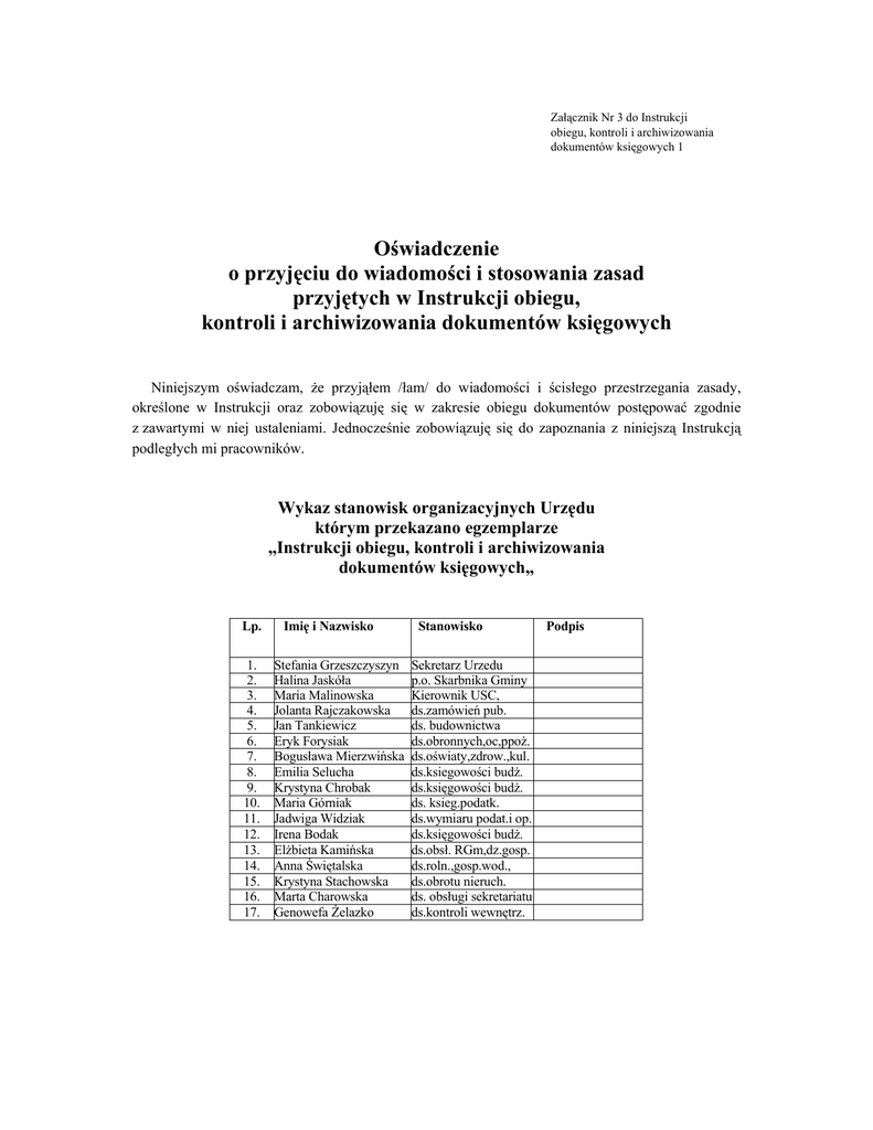 Załącznik Nr 3 do Instrukcji obiegu, kontroli i archiwizowania dokumentów księgowych 1 Oświadczenie o przyjęciu do wiadomości i stosowania zasad przyjętych w Instrukcji obiegu, kontroli i archiwizowania dokumentów księgowych Niniejszym oświadczam, że przyjąłem /łam/ do wiadomości i ścisłego przestrzegania zasady, określone w Instrukcji oraz zobowiązuję się w zakresie obiegu dokumentów postępować zgodnie z zawartymi w niej ustaleniami. Jednocześnie zobowiązuję się do zapoznania z niniejszą Instrukcją podległych mi pracowników. Wykaz stanowisk organizacyjnych Urzędu którym przekazano egzemplarze „Instrukcji obiegu, kontroli i archiwizowania dokumentów księgowych„ Lp. 1. 2. 3. 4. 5. 6. 7. 8. 9. 10. 11. 12. 13. 14. 15. 16. 17. Imię i Nazwisko Stefania Grzeszczyszyn Halina Jaskóła Maria Malinowska Jolanta Rajczakowska Jan Tankiewicz Eryk Forysiak Bogusława Mierzwińska Emilia Selucha Krystyna Chrobak Maria Górniak Jadwiga Widziak Irena Bodak Elżbieta Kamińska Anna Świętalska Krystyna Stachowska Marta Charowska Genowefa Żelazko Stanowisko Sekretarz Urzedu p.o. Skarbnika Gminy Kierownik USC, ds.zamówień pub. ds. budownictwa ds.obronnych,oc,ppoż. ds.oświaty,zdrow.,kul. ds.ksiegowości budż. ds.księgowości budż. ds. ksieg.podatk. ds.wymiaru podat.i op. ds.księgowości budż. ds.obsł. RGm,dz.gosp. ds.roln.,gosp.wod., ds.obrotu nieruch. ds. obsługi sekretariatu ds.kontroli wewnętrz. Podpis
