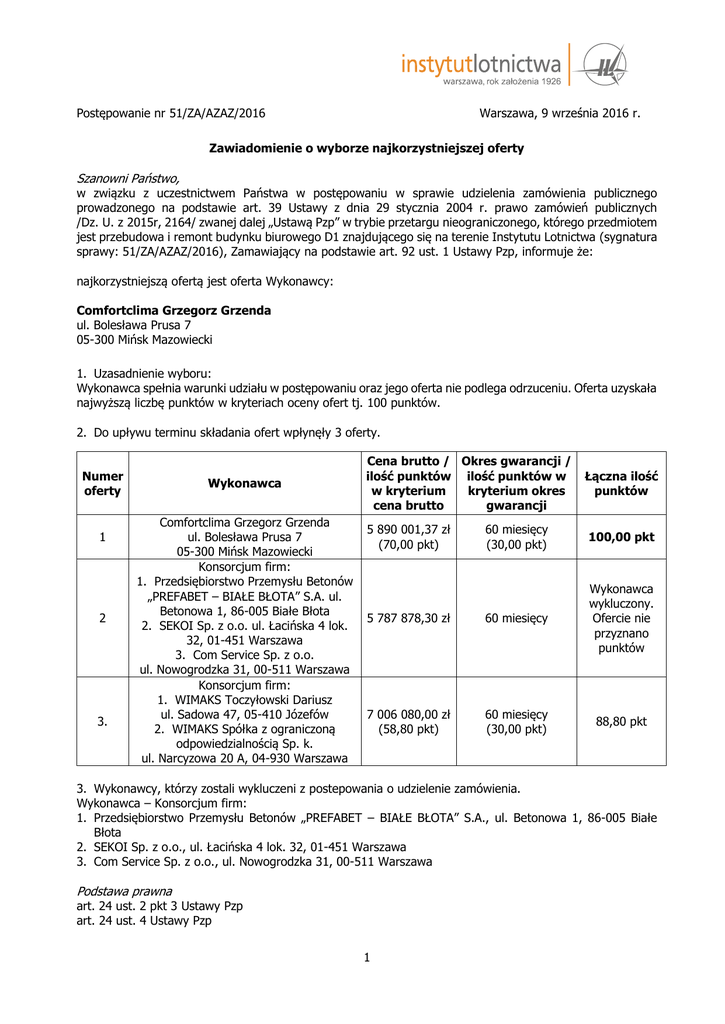 Postępowanie nr 51/ZA/AZAZ/2016 Warszawa, 9 września 2016 r. Zawiadomienie o wyborze najkorzystniejszej oferty Szanowni Państwo, w związku z uczestnictwem Państwa w postępowaniu w sprawie udzielenia zamówienia publicznego prowadzonego na podstawie art. 39 Ustawy z dnia 29 stycznia 2004 r. prawo zamówień publicznych /Dz. U. z 2015r, 2164/ zwanej dalej „Ustawą Pzp” w trybie przetargu nieograniczonego, którego przedmiotem jest przebudowa i remont budynku biurowego D1 znajdującego się na terenie Instytutu Lotnictwa (sygnatura sprawy: 51/ZA/AZAZ/2016), Zamawiający na podstawie art. 92 ust. 1 Ustawy Pzp, informuje że: najkorzystniejszą ofertą jest oferta Wykonawcy: Comfortclima Grzegorz Grzenda ul. Bolesława Prusa 7 05-300 Mińsk Mazowiecki 1. Uzasadnienie wyboru: Wykonawca spełnia warunki udziału w postępowaniu oraz jego oferta nie podlega odrzuceniu. Oferta uzyskała najwyższą liczbę punktów w kryteriach oceny ofert tj. 100 punktów. 2. Do upływu terminu składania ofert wpłynęły 3 oferty. Numer oferty 1 2 3. Wykonawca Comfortclima Grzegorz Grzenda ul. Bolesława Prusa 7 05-300 Mińsk Mazowiecki Konsorcjum firm: 1. Przedsiębiorstwo Przemysłu Betonów „PREFABET – BIAŁE BŁOTA” S.A. ul. Betonowa 1, 86-005 Białe Błota 2. SEKOI Sp. z o.o. ul. Łacińska 4 lok. 32, 01-451 Warszawa 3. Com Service Sp. z o.o. ul. Nowogrodzka 31, 00-511 Warszawa Konsorcjum firm: 1. WIMAKS Toczyłowski Dariusz ul. Sadowa 47, 05-410 Józefów 2. WIMAKS Spółka z ograniczoną odpowiedzialnością Sp. k. ul. Narcyzowa 20 A, 04-930 Warszawa Cena brutto / Okres gwarancji / ilość punktów ilość punktów w w kryterium kryterium okres cena brutto gwarancji 5 890 001,37 zł (70,00 pkt) Łączna ilość punktów 60 miesięcy (30,00 pkt) 100,00 pkt 5 787 878,30 zł 60 miesięcy Wykonawca wykluczony. Ofercie nie przyznano punktów 7 006 080,00 zł (58,80 pkt) 60 miesięcy (30,00 pkt) 88,80 pkt 3. Wykonawcy, którzy zostali wykluczeni z postepowania o udzielenie zamówienia. Wykonawca – Konsorcjum firm: 1. Przedsiębiorstwo Przemysłu Betonów „PREFABET – BIAŁE BŁOTA” S.A., ul. Betonowa 1, 86-005 Białe Błota 2. SEKOI Sp. z o.o., ul. Łacińska 4 lok. 32, 01-451 Warszawa 3. Com Service Sp. z o.o., ul. Nowogrodzka 31, 00-511 Warszawa Podstawa prawna art. 24 ust. 2 pkt 3 Ustawy Pzp art. 24 ust. 4 Ustawy Pzp 1 Uzasadnienie prawne Z postępowania o udzielenie zamówienia wyklucza się również wykonawców, którzy złożyli nieprawdziwe informacje mające wpływ lub mogące mieć wpływ na wynik prowadzonego postępowania. Ofertę wykonawcy wykluczonego uznaje się za odrzuconą. Uzasadnienie faktyczne Zgodnie z zapisami Rozdziału IX ust. 1 pkt 1 SIWZ, w celu potwierdzenia spełniania warunków udziału w postępowaniu w zakresie posiadania wiedzy i doświadczenia, Wykonawcy mieli wykazać, że w okresie ostatnich 5 lat przed upływem terminu składania ofert, a jeżeli okres prowadzenia działalności jest krótszy – w tym okresie, należycie wykonali co najmniej: - 2 roboty budowlane o wartości nie mniejszej niż 1 000 000,00 złotych brutto każda, - 1 robotę budowlaną o wartości nie mniejszej niż 3 000 000,00 złotych brutto obejmujące swoim zakresem budowę, rozbudowę, przebudowę lub remont budynku/budynków lub ich części i instalacje sanitarne i elektryczne. Zamawiający wymagał, aby co najmniej 2 z powyższych robót dotyczyły budowy lub przebudowy systemu klimatyzacji precyzyjnej. W celu potwierdzenia spełniania przez Wykonawcę przedmiotowego warunku udziału w postępowaniu należało przedłożyć wykaz robót budowlanych, w zakresie niezbędnym do wykazania spełniania warunku wiedzy i doświadczenia, wraz z podaniem ich rodzaju i wartości, przedmiotu, dat i miejsca wykonania oraz załączeniem dowodów, czy zostały wykonane lub są wykonywane należycie oraz wskazujących, czy zostały wykonane zgodnie z zasadami sztuki budowlanej i prawidłowo ukończone – wg treści określonej w załączniku nr 9 do SIWZ. Wykonawca - Konsorcjum firm: Przedsiębiorstwo Przemysłu Betonów „PREFABET – BIAŁE BŁOTA” S.A., SEKOI Sp. z o.o. i Com Service Sp. z o.o., złożył wraz z ofertą Wykaz robót budowlanych, w którym wskazał wykonanie 3 robót budowlanych oraz oświadczył, iż każda ze wskazanych prac obejmowała swoim zakresem budowę lub przebudowę systemu klimatyzacji precyzyjnej. Z uwagi na wystąpienie wątpliwości czy wskazane przez Wykonawcę w Wykazie robót budowlanych prace obejmowały budowę lub przebudowę systemu klimatyzacji precyzyjnej, Zamawiający zwrócił się do podmiotów, na których rzecz wykonane zostały prace budowlane, celem ustalenia ich zakresu. Z pozyskanych odpowiedzi wynika, iż 2 z 3 wskazanych w Wykazie robót budowlanych prac nie obejmowało swym zakresem budowy lub przebudowy systemu klimatyzacji precyzyjnej. Z uwagi na złożenie przez Wykonawcę - Konsorcjum firm: Przedsiębiorstwo Przemysłu Betonów „PREFABET – BIAŁE BŁOTA” S.A., , SEKOI Sp. z o.o. i Com Service Sp. z o.o. nieprawdziwych informacji mających wpływ lub mogących mieć wpływ na wynik prowadzonego postępowania, podlega on wykluczeniu z postępowania, a złożona przez niego oferta podlega odrzuceniu. 4. Termin, po którego upływie umowa w sprawie zamówienia publicznego może być zawarta. Z uwagi na powyższe, działając na podstawie art. 94 ust. 1 pkt 2) Ustawy Pzp Zamawiający informuje, że zawiera umowę w sprawie zamówienia publicznego w terminie nie krótszym niż 5 dni od dnia przesłania zawiadomienia o wyborze najkorzystniejszej oferty. 2