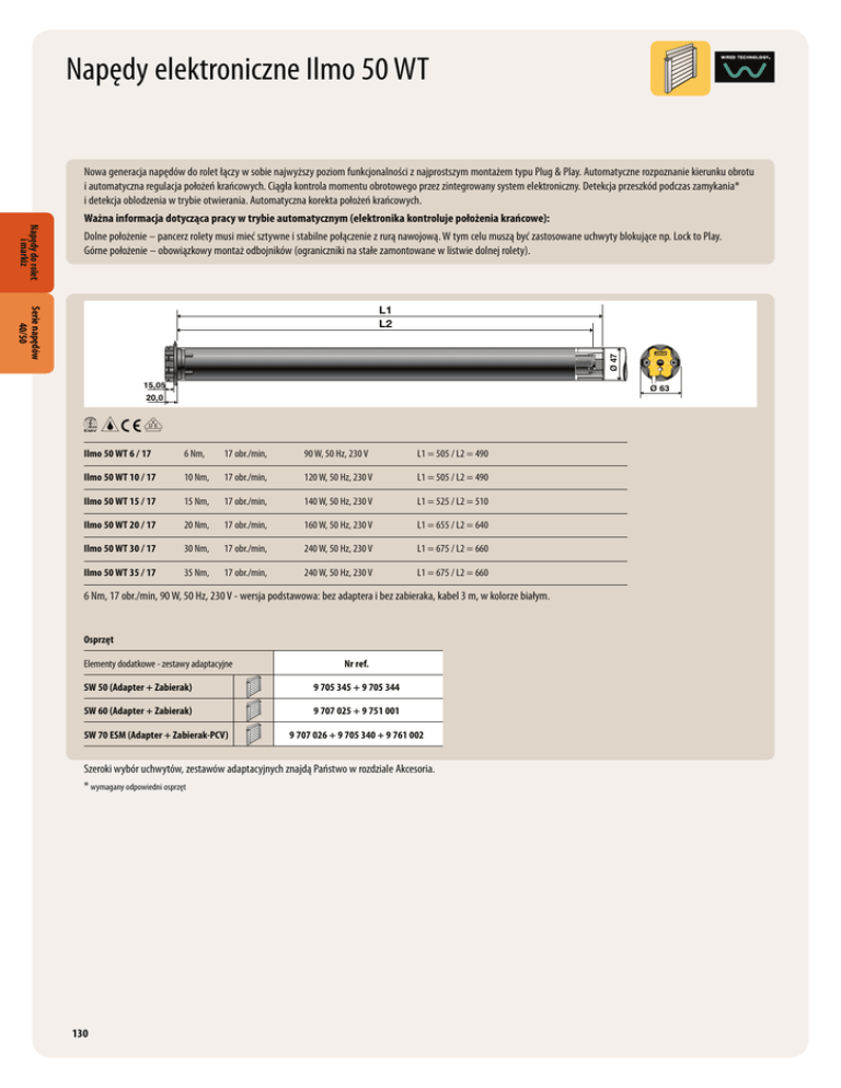 Napędy elektroniczne Ilmo 50 WT Nowa generacja napędów do rolet łączy w sobie najwyższy poziom funkcjonalności z najprostszym montażem typu Plug & Play. Automatyczne rozpoznanie kierunku obrotu i automatyczna regulacja położeń krańcowych. Ciągła kontrola momentu obrotowego przez zintegrowany system elektroniczny. Detekcja przeszkód podczas zamykania* i detekcja oblodzenia w trybie otwierania. Automatyczna korekta położeń krańcowych. 8BȈOBJOGPSNBDKBEPUZD[njDBQSBDZXUSZCJFBVUPNBUZD[OZNFMFLUSPOJLBLPOUSPMVKFQPPȈFOJBLSBǩDPXF /BQǗEZEPSPMFU i markiz Dolne położenie – pancerz rolety musi mieć sztywne i stabilne połączenie z rurą nawojową. W tym celu muszą być zastosowane uchwyty blokujące np. Lock to Play. Górne położenie – obowiązkowy montaż odbojników (ograniczniki na stałe zamontowane w listwie dolnej rolety). Ø 47 4FSJFOBQǗEØX L1 L2 15,05 Ø 63 20,0 *MNP85 6 Nm, 17 obr./min, 90 W, 50 Hz, 230 V L1 = 505 / L2 = 490 *MNP85 10 Nm, 17 obr./min, 120 W, 50 Hz, 230 V L1 = 505 / L2 = 490 *MNP85 15 Nm, 17 obr./min, 140 W, 50 Hz, 230 V L1 = 525 / L2 = 510 *MNP85 20 Nm, 17 obr./min, 160 W, 50 Hz, 230 V L1 = 655 / L2 = 640 *MNP85 30 Nm, 17 obr./min, 240 W, 50 Hz, 230 V L1 = 675 / L2 = 660 *MNP85 35 Nm, 17 obr./min, 240 W, 50 Hz, 230 V L1 = 675 / L2 = 660 6 Nm, 17 obr./min, 90 W, 50 Hz, 230 V - wersja podstawowa: bez adaptera i bez zabieraka, kabel 3 m, w kolorze białym. 0TQS[ǗU Elementy dodatkowe - zestawy adaptacyjne LBCFMND[BSOZ /SSFG 48"EBQUFS;BCJFSBL 48"EBQUFS;BCJFSBL 48&4."EBQUFS;BCJFSBL1$7 Szeroki wybór uchwytów, zestawów adaptacyjnych znajdą Państwo w rozdziale Akcesoria. * wymagany odpowiedni osprzęt LBCFMND[BSOZ LBCFMNCJBZ LBCFMND[BSOZ