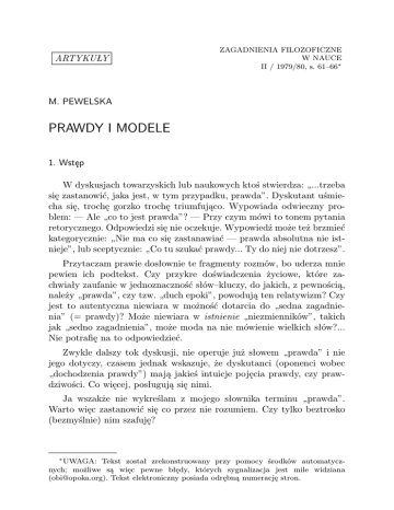 ARTYKUŁY ZAGADNIENIA FILOZOFICZNE W NAUCE II / 1979/80, s. 61–66∗ M. PEWELSKA PRAWDY I MODELE 1. Wstęp W dyskusjach towarzyskich lub naukowych ktoś stwierdza: „...trzeba się zastanowić, jaka jest, w tym przypadku, prawda”. Dyskutant uśmiecha się, trochę gorzko trochę triumfująco. Wypowiada odwieczny problem: — Ale „co to jest prawda”? — Przy czym mówi to tonem pytania retorycznego. Odpowiedzi się nie oczekuje. Wypowiedź może też brzmieć kategorycznie: „Nie ma co się zastanawiać — prawda absolutna nie istnieje”, lub sceptycznie: „Co tu szukać prawdy... Ty do niej nie dotrzesz”. Przytaczam prawie dosłownie te fragmenty rozmów, bo uderza mnie pewien ich podtekst. Czy przykre doświadczenia życiowe, które zachwiały zaufanie w jednoznaczność słów–kluczy, do jakich, z pewnością, należy „prawda”, czy tzw. „duch epoki”, powodują ten relatywizm? Czy jest to autentyczna niewiara w możność dotarcia do „sedna zagadnienia” (= prawdy)? Może niewiara w istnienie „niezmienników”, takich jak „sedno zagadnienia”, może moda na nie mówienie wielkich słów?... Nie potrafię na to odpowiedzieć. Zwykle dalszy tok dyskusji, nie operuje już słowem „prawda” i nie jego dotyczy, czasem jednak wskazuje, że dyskutanci (oponenci wobec „dochodzenia prawdy”) mają jakieś intuicje pojęcia prawdy, czy prawdziwości. Co więcej, posługują się nimi. Ja wszakże nie wykreślam z mojego słownika terminu „prawda”. Warto więc zastanowić się co przez nie rozumiem. Czy tylko beztrosko (bezmyślnie) nim szafuję? ∗ UWAGA: Tekst został zrekonstruowany przy pomocy środków automatycznych; możliwe są więc pewne błędy, których sygnalizacja jest mile widziana ([email protected]). Tekst elektroniczny posiada odrębną numerację stron. 2 M. PEWELSKA 2. „Trzy prawdy” Od razu narzuca się, że słowa „prawda” nie używam jednoznacznie. Wśród różnorodnych treści jakie, to słowo posiada, wyróżnię pewne klasy, którym — dla ułatwienia — nadam odrębne nazwy: — „prawda” — prawda ontologiczna — Prawda Nauka daje nam „prawdę” o rzeczywistości. Dlaczego cudzysłów? Bo uznanie teorii naukowej za prawdziwą odbywa się, w zasadzie, za pomocą pewnej konwencji: umawiamy się np., że teorię naukową uznajemy za prawdziwą, jeśli na razie nie daje się jej sfalsyfikować, czyli obalić przy pomocy doświadczenia niezgodnego z jej przewidywaniami1 . Czy uważamy, że otrzymane wyniki można uznać za prawdziwe wyłącznie z tego powodu, że wcześniej wyznaczyliśmy sobie konwencję, zgodnie z którą można je tak nazwać2 ? Wierzymy chyba, że nauka daje nam jednak jakaś informację o rzeczywistości. Zbliża nas do czegoś, co nazwę prawdą ontologiczną3 . Prawda ontologiczna nie może tkwić w wiedzy naukowej4 , skoro naukowa prawda jest umową (lub przynajmniej ma w sobie wiele z umowy). Więc gdzie? Tam, gdzie „skończy się” (lub mogłaby się skończyć, bo z różnych powodów mocno wątpliwe, czy my, jako ludzkość, tam dojdziemy) ciąg coraz to lepszych teorii5 . A mamy nadzieję, że są coraz to lepsze, bo np. w fizyce, od pewnego momentu w historii nauki (czy od momentu powstania prawdziwej nauki, jak niektórzy wolą) kolejne teorie zawierają (dają się przybliżyć przez) poprzednie teorie6 . Prawda ontologiczna zatem, mówiąc mało precyzyjnie, to pełne zrozumienie otaczającej nas rzeczywistości. Wydaje mi się, że prawda ontologiczna ma 1 Na temat „uprawomocnienia” twierdzeń w nauce por. np. Ernest Nagel Struktura nauki, PWN, 1970. 2 Do podobnego konwencjonalizmu skłaniał się m. in. Kazimierz Ajdukiewicz. 3 Proszę Czytelnika o niekojarzenie tej nazwy z żadną konkretną „ontologią filozoficzną” (w sensie: z żadnym konkretnym systemem filozoficznym). 4 Przez — naukę — w tym artykule — może z racji moich „obciążeń zawodowych” — rozumiem ścisłe nauki empiryczne. 5 Por. aproksymacyjna koncepcja prawdy Ryszarda Wójcickiego Metodologia formalna nauk empirycznych — podstawowe pojęcia i zagadnienia, Zakład Narodowy im. Ossolińskich — Wydawnictwo PAN, 1974. 6 W rzeczywistej historii nauki sprawy nie wyglądają aż tak prosto. Pisze o tym Stefan Amsterdamski, Między doświadczeniem a metafizyką, Książka i Wiedza, 1973. PRAWDY I MODELE 3 jakieś (nieznane bliżej) powiązanie z Prawdą chociaż o Niej bezpośrednio badanie świata „nie mówi”. Jeżeli Czytelnik dotychczas nie wyczuł, po co wprowadzam także i Prawdę (przez duże P), zrozumie to, mam nadzieję, po przeczytaniu całego artykułu. Nie wszyscy traktujący wyraz „prawda” jako sensowny podkładają pod niego te same intuicje. Np. niektórzy, już same wyniki nauki (lub pewną ich interpretację) nazywaliby „prawdą o rzeczywistości”. Nadwartościowywanie roli osiągnięć nauki na pewnym etapie jej rozwoju, niesie niebezpieczeństwo zbyt dosłownego włączania ich dla obrony lub zwalczania poglądów filozoficznych. Warto pamiętać, co jeszcze raz podkreślę, że „prawda” uwikłana jest w konwencjonalizm. Skoro jednak nauka przynosi nam coś więcej niż tylko potwierdzenie operatywności pewnych narzucanych jej przez nas reguł, uważam również za szkodliwą postawę nie liczenia się w filozofii z osiągnięciami nauki. 3. Poznanie modelowe Wychodzę od pojęcia prawdy używanego w nauce. Dalej, aż do ostatecznej ekstrapolacji nazwanej Prawdą, pozostaję tylko w kontekście poznania naukowego. Ktoś, kto usłyszał tę koncepcję, oburzył się, że to straszne zawężenie. Zaprotestował: „Tylko nauka? A prawda np. w poezji?” Jaka jest moja na to odpowiedź? Na marginesie, jeśli chodzi o poezję, to moje zdanie jest takie: poezja nie jest formą poznania. Nie wnosi nic nowego w treść. Jest sztuką wypowiadania treści. Trzeba posiadać jakąś wiedzę o świecie, żeby ją formułować. Wracając do wątku wiodącego: ekspo