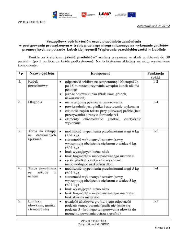 ZP.KD.3331/2/3/13 Załącznik nr 8 do SIWZ Szczegółowy opis kryteriów oceny przedmiotu zamówienia w postępowaniu prowadzonym w trybie przetargu nieograniczonego na wykonanie gadżetów promocyjnych na potrzeby Lubelskiej Agencji Wspierania przedsiębiorczości w Lublinie Punkty za kryterium „jakość produktów” zostaną przyznane w skali punktowej do 30 punktów (po 1 punkcie za każde podkryterium). Na to kryterium składają się niżej wymienione komponenty: Lp. 1. Nazwa gadżetu Kubek porcelanowy Komponent 2. Długopis 3. Torba na zakupy na drewnianych rączkach 4. Torba bawełniana na zakupy z uchem 5. Linijka z ołówkami, gumką i temperówką odporność szkliwa na temperaturę 100 stopni C: po 15 minutach trzymania wrzątku kubek nie ma pęknięć jakość odlewu kubka (brak skaz, grudek, nawarstwień) nie występują pęknięcia, zarysowania powierzchnia jest gładka i estetycznie wykonana zdolność zapisu tekstu przy pierwszej próbie (bez przerywania) strony o formacie A4 elementy chromowane gładkie, estetycznie wykonane możliwość wypełnienia przedmiotami wagi 6 kg (+/-1 kg) staranność wykonanych szwów (szwy wytrzymują obciążenie ciężarem o wadze 6 kg (+/-1 kg) brak wystających luźno nitek brak fragmentów niedopasowanego materiału rączki gładkie, estetycznie wykonane, niepowodujące uszkodzeń dłoni możliwość wypełnienia przedmiotami wagi 5 kg (+/-1 kg) staranność wykonanych szwów (szwy wytrzymują obciążenie ciężarem o wadze 5 kg (+/-1 kg) brak wystających luźno nitek brak fragmentów niedopasowanego materiału, brak skaz na materiale trwałość użytkowa grafitu i jego odporność podczas temperowania (grafit nie łamie się podczas 3 - krotnego temperowania ołówka do momentu powstania ostrza z grafitu) Punktacja (pkt.) 1-2 1-4 1-5 1-4 1-5 ZP.KD.3331/2/3/13. Załącznik nr 8 do SIWZ. Strona 1 z 2 6. Smycz satynowa 7. Smycz metalowa 8. Szklanka wody 9. Notatnik z długopisem do grafit nie kruszy się podczas pisania możliwość zatemperowania ołówka umieszczoną w komplecie temperówką tzn. temperówka jest ostra i nie łamie ołówka linijka prosta, bez jakichkolwiek grudek i nawarstwień tworzywa podziałka na linijce widoczna i nieścierająca się po kilkukrotnym potarciu ręką podczas rozciągania smycz nie pęka karabińczyk pracuje swobodnie lecz się nie otwiera samoczynnie podczas zginania smycz nie pęka elementy są ze sobą estetycznie i trwale połączone brak skaz, grudek, nawarstwień estetyka, czytelność nadruku imitującego piaskowanie na szkle kartki notesu swobodnie można przerzucić po spirali okładka równo docięta ze środkiem na długopisie nie występują pęknięcia, zarysowania zdolność zapisu tekstu przy pierwszej próbie (bez przerywania) strony o formacie A4 Razem 1-2 1-2 1-2 1-4 9-30 UWAGA! W celu potwierdzenia, iż oferowane artykuły odpowiadają wymaganiom określonym w SIWZ (opisowi przedmiotu zamówienia), Wykonawca winien załączyć do oferty próbki materiałów reklamowych - gadżetów. Wykonawca winien załączyć do oferty po jednym z prototypów gadżetów odpowiadającym opisowi przedmiotu zamówienia. Na gadżetach mogą znajdować się przykładowe nadruki firmowe (niekoniecznie z oznakowaniem wymaganym przez Zamawiającego). Jeżeli opis przedmiotu zamówienia zawiera zapis o wariantach kolorystycznych, wystarczy iż Wykonawca przedstawi jeden wariant kolorystyczny dla każdego przedmiotu. ZP.KD.3331/2/3/13. Załącznik nr 8 do SIWZ. Strona 2 z 2