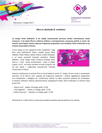 Warszawa, 1 lutego 2012 r. 4fun.tv obchodzi 8. urodziny! 13 lutego minie dokładnie 8 lat odkąd wystartowała pierwsza polska interaktywna stacja muzyczna. Z tej okazji 4fun.tv zabierze widzów w niezapomnianą, muzyczną podróż w czasie. Na antenie stacji będzie można zobaczyć fragmenty programów oraz teledyski, które królowały na jej antenie od początku istnienia. 13-sty lutego to bez wątpienia dzień wyjątkowy. Tego dnia swój debiutancki album wydała grupa Black Sabbath, Adam Małysz zdobył srebrny medal olimpijski, a na świat przyszedł brytyjski wokalista, Robbie Williams. 13-go lutego swoje urodziny świętuje także 4fun.tv. I choć stacja wystartowała 13-go w piątek o godz. 13:13 , nie może naczekać na brak szczęścia. Od lat jest jedną z najbardziej popularnych telewizji muzycznych w Polsce. Impreza urodzinowa na antenie 4fun.tv trwać będzie 6 od do 12 lutego. W tym czasie w specjalnych pasmach „8 lat 4fun.tv mix” pojawią się fragmenty lubianych i chętnie oglądanych programów oraz teledysków z ubiegłych lat. Urodzinowy tydzień to także specjalne wydania list przebojów, w których widzowie zobaczą podsumowanie największych hitów, które królowały na antenie stacji przez 8 lat: - „Dance Lista” - piątek, 10 lutego, godz. 21.00 - „Top Tygodnia” - sobota, 11 lutego, godz. 17.00 - „Polska Top Lista” - niedziela, 12 lutego, godz. 17.00 Obchodom 8. urodzin 4fun.tv towarzyszyć będzie specjalna oprawa graficzna na antenie. *** Stacja 4fun.tv należy do grupy kapitałowej 4fun Media S.A., którą tworzą: 4fun.tv, rebel:tv oraz spółka Program, reprezentująca kontent znanych na polskim rynku zagranicznych kanałów telewizyjnych. Telewizja 4fun.tv rozpoczęła swoją działalność w lutym 2004 roku. W 2005 roku została uhonorowana nagrodą New Channel of the Year - przyznawaną na konkursie Hot Bird TV Awards w Wenecji w kategorii najbardziej innowacyjna telewizja. W 2010 4fun.tv otrzymał wyróżnienie w konkursie Kryształowe Anteny, w kategorii rozwiązanie satelitarne za system 4funBox. Stacja ma w swojej ofercie nie tylko największe hity muzyczne, ale także wiele programów muzyczno - rozrywkowych: Top Tygodnia, Polska Top Lista, Weekendy Specjalne, czy zabaw interaktywnych: Parowanie, Kto Cię Kocha? 4fun.tv jest dostępna w największych sieciach kablowych w kraju, takich jak: Aster, UPC, Vectra, Multimedia i wielu mniejszych. Stację można znaleźć również na platformach cyfrowych „n”, CYFRA+ i Polsat Cyfrowy. 4fun.tv dociera do ponad 7,5 miliona gospodarstw domowych w całej Polsce. W listopadzie 2010 roku Grupa Kapitałowa 4fun Media S.A. zadebiutowała na Giełdzie Papierów Wartościowych. Dodatkowych informacji udzielają: Agnieszka Zając Dyrektor PR i Marketingu Tel.: (22) 488 43 18, kom.: 600 094 719 e-mail: [email protected] ul. Bobrowiecka 1A 00-728 Warszawa Aleksandra Głuchowska PR Manager Tel.: (22) 488 43 30, kom.: 608 652 458 e-mail: [email protected] ul. Bobrowiecka 1A 00-728 Warszawa