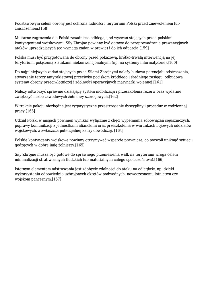Podstawowym celem obrony jest ochrona ludności i terytorium Polski przed zniewoleniem lub zniszczeniem.[158] Militarne zagrożenia dla Polski zasadniczo odbiegają od wyzwań stojących przed polskimi kontyngentami wojskowymi. Siły Zbrojne powinny być gotowe do przeprowadzania prewencyjnych ataków uprzedzających (co wymaga zmian w prawie) i do ich odparcia.[159] Polska musi być przygotowana do obrony przed pokazową, krótko-trwałą interwencją na jej terytorium, połączoną z atakami niekonwencjonalnymi (np. na systemy informatyczne).[160] Do najpilniejszych zadań stojących przed Siłami Zbrojnymi należy budowa potencjału odstraszania, stworzenie tarczy antyrakietowej przeciwko pociskom krótkiego i średniego zasięgu, odbudowa systemu obrony przeciwlotniczej i zdolności operacyjnych marynarki wojennej.[161] Należy odtworzyć sprawnie działający system mobilizacji i przeszkolenia rezerw oraz wydatnie zwiększyć liczbę zawodowych żołnierzy szeregowych.[162] W trakcie pokoju niezbędne jest rygorystyczne przestrzeganie dyscypliny i procedur w codziennej pracy.[163] Udział Polski w misjach powinien wynikać wyłącznie z chęci wypełniania zobowiązań sojuszniczych, poprawy komunikacji z jednostkami alianckimi oraz przeszkolenia w warunkach bojowych oddziałów wojskowych, a zwłaszcza potencjalnej kadry dowódczej. [164] Polskie kontyngenty wojskowe powinny otrzymywać wsparcie prawnicze, co pozwoli uniknąć sytuacji godzących w dobre imię żołnierzy.[165] Siły Zbrojne muszą być gotowe do sprawnego przeniesienia walk na terytorium wroga celem minimalizacji strat własnych (ludzkich lub materialnych całego społeczeństwa).[166] Istotnym elementem odstraszania jest zdobycie zdolności do ataku na odległość, np. dzięki wykorzystaniu odpowiednio uzbrojonych okrętów podwodnych, nowoczesnemu lotnictwu czy wojskom pancernym.[167]