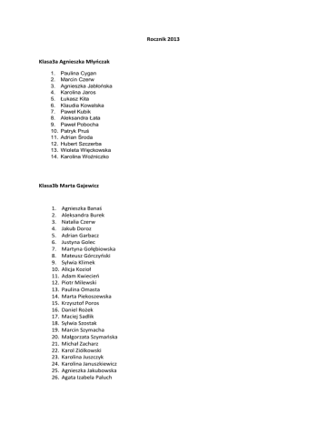 Rocznik 2013 Klasa3a Agnieszka Młyńczak 1. 2. 3. 4. 5. 6. 7. 8. 9. 10. 11. 12. 13. 14. Paulina Cygan Marcin Czerw Agnieszka Jabłońska Karolina Jaros Łukasz Kita Klaudia Kowalska Paweł Kubik Aleksandra Łata Paweł Pobocha Patryk Pruś Adrian Środa Hubert Szczerba Wioleta Więckowska Karolina Woźniczko Klasa3b Marta Gajewicz 1. 2. 3. 4. 5. 6. 7. 8. 9. 10. 11. 12. 13. 14. 15. 16. 17. 18. 19. 20. 21. 22. 23. 24. 25. 26. Agnieszka Banaś Aleksandra Burek Natalia Czerw Jakub Doroz Adrian Garbacz Justyna Golec Martyna Gołębiowska Mateusz Górczyński Sylwia Klimek Alicja Kozioł Adam Kwiecień Piotr Milewski Paulina Omasta Marta Piekoszewska Krzysztof Poros Daniel Rożek Maciej Sadlik Sylwia Szostak Marcin Szymacha Małgorzata Szymańska Michał Zacharz Karol Ziólkowski Karolina Juszczyk Karolina Januszkiewicz Agnieszka Jakubowska Agata Izabela Paluch Klasa3c Pawel Kolbus 1. 2. 3. 4. 5. 6. 7. 8. 9. 10. 11. 12. 13. 14. 15. 16. 17. 18. 19. 20. 21. 22. 23. 24. 25. Natalia Borkowska Kinga Dąbrowska Patrycja Domagała Natalia Durlej Andrzej Głuszak Rafał Kula Angelika Lange Justyna Laprus Justyna Lichwała Paweł Łęczek Damian Maj Rafał Marzec Filip Moty Marcin Rożek Karolina Stachurska Aleksandra Świercz Agnieszka Szostak Piotr Wodolski Dawid Wypych Sylwia Wyrwa Karolina Paw Katarzyna Budzik Dominika Strączek Maciej Szpiega Michał Zacharz Klasa3d Eliza Dygoń 1. 2. 3. 4. 5. 6. 7. 8. 9. 10. 11. Klaudia Baran Paulina Bochniak Sebastian Chwalik Agata Domagała Sylwia Dora Paweł Doroz Katarzyna Fortuna Monika Golik Anna Kowalczyk Damian Koźmiński Łukasz Kućmierz 12. 13. 14. 15. 16. 17. 18. 19. 20. 21. 22. 23. 24. Mateusz Łaba Karol Łach Adam Mitręga Agata Molenda Paulina Nizińska Paulina Nowak Karol Opoka Karolina Piątek Ernest Pikulski Sandra Pochyła Bartosz Szpiega Rafał Walczak Oleksandr Kretskyi
