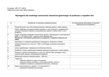 Nr sprawy IZP. 271.3.2012 załącznik do siwz oraz oferty Dostawcy Wymagania dla średniego samochodu ratowniczo-gaśniczego na podwoziu z napędem 4x4 LP. 1. MINIMALNE WYMAGANIA ZAMAWIAJACEGO Pojazd fabrycznie nowy. Rok produkcji podwozia i zabudowy zgodny z rokiem dostawy. Pojazd spełniający wymagania polskich przepisów o ruchu drogowym z uwzględnieniem wymagań dotyczących pojazdów uprzywilejowanych zgodnie z ustawą Prawo o ruchu drogowym. 2. Pojazd posiadający świadectwo dopuszczenia zgodnie z obowiązującym rozporządzeniem MSW i A z 20 czerwca 2007 r. ważne na dzień składania ofert. Świadectwo ( kserokopia) potwierdzona za zgodność z oryginałem dołączona do oferty. 3. Wyposażony w urządzenia sygnalizacyjno-ostrzegawcze, akustyczne i świetlne. 4. Urządzenie akustyczne o mocy min. 100W umożliwiające podawanie komunikatów słownych. 5. Lampy sygnalizacyjne zabezpieczone konstrukcją ochronną. 6. Dodatkowo 2 lampy sygnalizacyjne niebieskie pulsacyjne umieszczone z przodu pojazdu. 7. Podwozie z silnikiem wysokoprężnym o mocy min. 290 KM. Silnik spełniający normy czystości spalin zgodnie z obowiązującymi przepisami. 8. Maksymalna wysokość całkowita pojazdu – 3000 mm. 9. Napęd 4x4: – możliwość odłączenia napędu osi przedniej, – możliwość blokady mechanizmu różnicowego przedniej i tylnej osi, – przekładnia rozdzielcza z przełożeniem terenowym i szosowym, 10. Kabina sześcioosobowa w układzie 1+1+4 wyposażona w: – indywidualne oświetlenie dla dowódcy, POTWIERDZENIE SPEŁNIENIA WYMAGAŃ I PROPOZYCJE WYKONAWCY – – – – – – – – – niezależny układ ogrzewania i wentylacji, umożliwiający ogrzewanie kabiny przy wyłączonym silniku, fotele z pasami bezpieczeństwa, fotele pokryte materiałem odpornym na rozdarcie, ścieranie i łatwym w utrzymaniu czystości, fotel kierowcy z możliwością regulacji wysokości, odległości i pochylenia oparcia, radiotelefon przewoźny Motorola GM 360 oraz instalacja do podłączenia 4 szt, ładowarek radiotelefonów przenośnych Motorola GP 360, instalacja antenowa przystosowana do pasma radiowego 148 MHz, manometr niskiego ciśnienia autopompy, wskaźnik poziomu wody w zbiorniku, wskaźnik poziomu środka pianotwórczego. 11. Maksymalna prędkość na najwyższym biegu nie mniejsza niż 90 km/godz. 12. Rezerwa masy w pełni obciążonego samochodu w stosunku do CMP min. 3%. 13. Instalacja pneumatyczna pojazdu zapewniająca możliwość wyjazdu w ciągu 6s, od chwili uruchomienia silnika samochodu z równoczesnym zapewnieniem prawidłowego funkcjonowania hamulców. Możliwość podłączenia zewnętrznego źródła układu pneumatycznego (szybkozłącze). 14. Wszelkie funkcje wszystkich układów i urządzeń muszą zachować swoje właściwości pracy w temperaturach otoczenia od – 250C do + 600C. 15. Pojemność zbiornika paliwa powinna zapewniać przejechanie min 300 km lub 4 godzinną pracę autopompy. 16. Ogumienie specjalne z bieżnikiem dostosowanym do różnych warunków atmosferycznych z zamontowanymi urządzeniami antypoślizgowymi (łańcuchy podrzutowe). Wartości nominalne ciśnienia w ogumieniu trwale umieszczone nad kołami. 17. Pełnowymiarowe koło zapasowe. 18. Wyposażenie w wyciągarkę elektryczną o uciągu min. 8 t z liną 30 m i pokrowcem. 19. Wyposażenie w hak holowniczy (sprzęt przyczepowy) z tyłu pojazdu do holowania przyczepy o DMC 750 kg oraz złącza elektryczne. 20. Maszt oświetleniowy pneumatyczny sterowany elektrycznie z kabiny kierowcy z najaśnicami 4x500 W. 21. Zabudowa pożarnicza wykonana z materiałów odpornych na korozję. 22. Dach zabudowy w formie podestu roboczego, w wykonaniu antypoślizgowym z zamontowaną prowadnicą mocowania drabiny. 23. Podesty robocze wokół nadwozia w tym przy nadkolu w wykonaniu antypoślizgowym. 24. Skrytki na sprzęt 7 szt. (układ 3+3+1) zamykane żaluzjami wodno i pyłoszczelnymi wspomaganymi systemem sprężynowym, wykonane z materiałów odpornych na korozję, wyposażone w zamki zamykane na klucz. Jeden klucz powinien pasować do wszystkich zamków. Zabezpieczenie przed samoczynnym otwieraniem się skrytek. Dostęp do skrytek z zachowaniem wymagań ergonomii. 25. Skrytki na sprzęt i przedział autopomy wyposażone w oświetlenie włączane w kabinie kierowcy. 26. Pojazd powinien posiadać oświetlenie pola pracy wokół samochodu zapewniające oświetlenie w warunkach słabej widoczności oraz oświetlenie powierzchni dachu roboczego. 27. Szuflady, podesty i wysuwane tace muszą się automatycznie blokować w pozycji zamkniętej i posiadać zabezpieczenie przed całkowitym wyciągnięciem (wypadnięciem z prowadnic). Elementy wystające w pozycji otwartej powyżej 250 mm poza obrys pojazdu muszą posiadać oznakowanie ostrzegawcze. 28. Uchwyty i klamki wszystkich urządzeń, drzwi żaluzjowych, szuflad, podestów i tac muszą być tak skonstruowane, aby umożliwiały ich obsługę w rękawicach. 29. Konstrukcja skrytek powinna zapewniać odprowadzenie wody z ich wnętrza. 30. Zbiornik wody (nierdzewny) o pojemności 2,5 m3 wyposażony w: – oprzyrządowanie umożliwiające jego bezpieczną eksploatację, z układem zabezpieczającym przed wypływem wody w czasie jazdy, – falochrony i właz rewizyjny, – nasadę 75 i zawór kulowy do napełniania z hydrantu, – instalację napełniania zabezpieczającą przed swobodnym wypływem wody ze zbiornika, oraz zawór zabezpieczający przed przepełnienie zbiornika z możliwością przełączenia na pracę ręczną + instalację odwadniającą zbiornik. 31. Zbiornik środka pianotwórczego (nierdzewny) odporny na działanie dopuszczonych do stosowania środków pianowórczych i modyfikatorów. Wyposażony w oprzyrządowanie zapeniające jego bezpieczną eksploatację. Napełnianie zbiornika środkiem pianotwórczym powinno być możliwe z poziomu terenu i z dachu pojazdu. 32. Autopompa w obudowanym przedziale, zamykanym drzwiami żaluzjowymi. 33. A