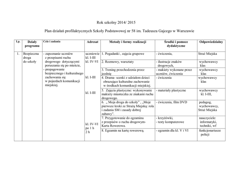 Rok szkolny 2014/ 2015 Plan działań profilaktycznych Szkoły Podstawowej nr 58 im. Tadeusza Gajcego w Warszawie Lp. Działy programu 1. Bezpieczna droga do szkoły Cele i zadania - zapoznanie uczniów z przepisami ruchu drogowego dotyczącymi poruszania się po mieście, - propagowanie bezpiecznego i kulturalnego zachowania się w pojazdach komunikacji miejskiej. Adresat Metody i formy realizacji uczniowie 1. Pogadanki , zajęcia grupowe kl. I-III kl. IV-VI 2. Rozmowy, warsztaty 3. Trening przechodzenia przez jezdnię kl. I-III 4. Drama- scenki z udziałem dzieci obrazujące kulturalne zachowanie w środkach komunikacji miejskiej. 5. Zajęcia plastyczne: wykonywanie kl. I-III makiety miasteczka ze znakami ruchu drogowego. 6. „ Moja droga do szkoły” , „Moje pierwsze kroki ze Strażą Miejską: rola i zadania SM i zasady dobrej zabawy”. 7. Przygotowanie do egzaminu z przepisów o ruchu drogowymkl. IV-VI Karta Rowerowa. po 1 h 8. Egzamin na kartę rowerową. 2h Środki i pomoce dydaktyczne Odpowiedzialny - ćwiczenia, Straż Miejska - ilustracje znaków drogowych, - makiety wykonane przez uczniów, ćwiczenia - ćwiczenia wychowawcy klas wychowawcy klas wychowawcy klas - materiały plastyczne wychowawcy kl. I-III, - ćwiczenia, film DVD pedagog, wychowawcy, Straż Miejska - krzyżówki, - testy komputerowe nauczyciele: informatyki, techniki, wf funkcjonariusze policji - egzamin dla kl. V i VI Lp. 2. Działy programu Bezpieczne miastobezpieczne życie Cele i zadania - promowanie bezpiecznych zachowań, - uświadomienie sytuacji i zachowań stanowiących zagrożenia. Adresat uczniowie kl. I - VI Metody i formy realizacji 1. „Bezpieczeństwo dziecka”- film 2. Zajęcia edukacyjne ze Strażą Miejską- „Wiem, co robić kiedy jestem sam”: „Spotkanie z nieznajomym”, ”Czy pies musi ugryźć?” 3. Zajęcia edukacyjne w świetlicy szkolnej z udziałem funkcjonariuszy straży miejskiej. kl. IV-VI rodzice uczniowie kl.V Środki i pomoce dydaktyczne - DVD- „Bezpieczeństwo dziecka”, - opisy sytuacji wprowadzających do dyskusji, - gry i zabawy dydaktyczne, zajęcia terenowe. - pogadanka, filmy DVD - pogadanka, filmy DVD Odpowiedzialny wychowawcy pedagog, wychowawcy klas, nauczyciele przedmiotów, wychowawcy świetlicy 4. Zasady bhp w szkole, w drodze do szkoły, na wycieczkach, w szkole podczas zajęć i podczas przerw między lekcjami. - pogadanki, rozmowy kierowane dyrektor, wychowawcy klas 5. „Mówienie NIE w sytuacji presji grupy” zajęcia w poszczególnych klasach, warsztaty z rodzicami. zajęcia w klasie po 1 h pedagog z PPP 6. Zajęcia nt: „Znaleziska - niewybuchy”, „Fajerwerki a dobra zabawa” „Współczesne zagrożeniaterroryzm” Straż Miejska Lp. 3. Działy Cele i zadania programu W zdrowym - propagowanie zdrowego cielestylu życia zdrowy duch uczniowie 1. Zajęcia edukacyjne „Zdrowe zęby kl. 0-III – ładny uśmiech” Środki i pomoce dydaktyczne - pogadanka pielęgniarki szkolnej, uczniowie 2. Profilaktyka próchnicy – nauka kl. I-VI systematycznego mycia zębów. - pogadanki, tablice, szczotki pielęgniarka do zębów, Adresat Metody i formy realizacji uczniowie 3. „Dojrzewanie bez tajemnic, kl. IV-VI higiena okresu dojrzewania” - podręczniki : Przyroda kl. IV- VI, „Wychowanie do życia w rodzinie”, uczniowie 4. „Zapobieganie urazom” - podręczniki : Przyroda kl. V-VI kl. IV- VI , pogadanki uczniowie 5. Kontynuacja programu: „Wiem, co konkurs dla uczniów , apel kl.0-VI jem” Odpowiedzialny pielęgniarka, wychowawcy nauczyciele przedmiotu nauczyciele przedmiotu wychowawcy, pedagodzy, rodzice uczniowie kl. 0-VI rodzice uczniowie kl. III uczniowie kl.0-VI rodzice 6. Szczepienia ochronne i ich znaczenie. pogadanka, plakaty, przybory plastyczne wychowawcy klas, pielęgniarka 7. „Przyjaciele zwierząt” - pogadanka, film edukacyjny 8. Higiena ciała, zasady prawidłowego odżywiania, wypoczynku pogadanka, plakaty, przybory higieniczne, projektor funkcjonariusz straży miejskiej pielęgniarka, wychowawcy, nauczyciele, przyrody uczniowie 9. „Jestem strażnikiem przyrody”, kl. III „Skąd się biorą góry śmieci” zajęcia edukacyjne, INTERNET, komputer funkcjonariusz SM, uczniowie 10. „Od zabawy do sportu” kl. I-III Kl. IV-VI 10a „Zajęcia sportowe” uczniowie 11. Pierwsza pomoc w nagłych wypadkach. uczniowie 12. Badania profilaktyczne rodzice ( wskazania do wizyty u lekarza specjalisty) kl. I i VI – program słuchowy, kl. II – program okulistyczny i stomatologiczny, kl. IV – program ortopedyczny, uczniowie 13. „O Florce, która chciała zostać kl. II piłkarzem” gry i zabawy ruchowe propagujące aktywność fizyczną gry i zabawy ruchowe propagujące aktywność fizyczną - ćwiczenia w udzielaniu pierwszej pomocy, fantom, film edukacyjny, DVD badania przesiewowe, szczepienia. nauczycielka prowadząca zajęcia nauczycielka prowadząca zajęcia wychowawcy, nauczyciel w-f profilaktyczny spektakl teatralny Straż Miejska pielęgniarka Lp. Działy programu 4. Uzależnie niom- nie! Cele i zadania Adresat Metody i formy realizacji - Uświadomienie zagrożeń uczniowie 1. Zajęcia edukacyjne wynikających z palenia z pedagogiem z Poradni papierosów, picia alkoholu, Psychologiczno- Pedagogicznej, - kształcenie umiejętności rodzice 2. Uzależnienia, zachowania dokonywania właściwego ryzykowne- czerwone sygnały” wyboru w trudnych sytuacjach, - uczenie umiejętności odmawiania. Środki i pomoce dydaktyczne - kasety video, pogadanka, dyskusja, - wykład uczniowie 3. Zajęcia edukacyjne z wychowawcą klasy uczniowie 4. Zajęcia edukacyjne z wychowawcami świetlicy uczniowie 5. „Bezpieczeństwo w sieci” kl. IV uczniowie 6. PROGRAM „Otwarte sale ” - scenariusze gier i zabaw dydaktycznych, - pogadanka, dyskusja uczniowie 7. Zajęcia profilaktyczne zorganizowane przez UD Targówek Rodzice 8. zajęcia profilaktyczne organizowane przez rodziców Odpowiedzialny pedagog szkolny, pedagog PPP, pedagog PPP