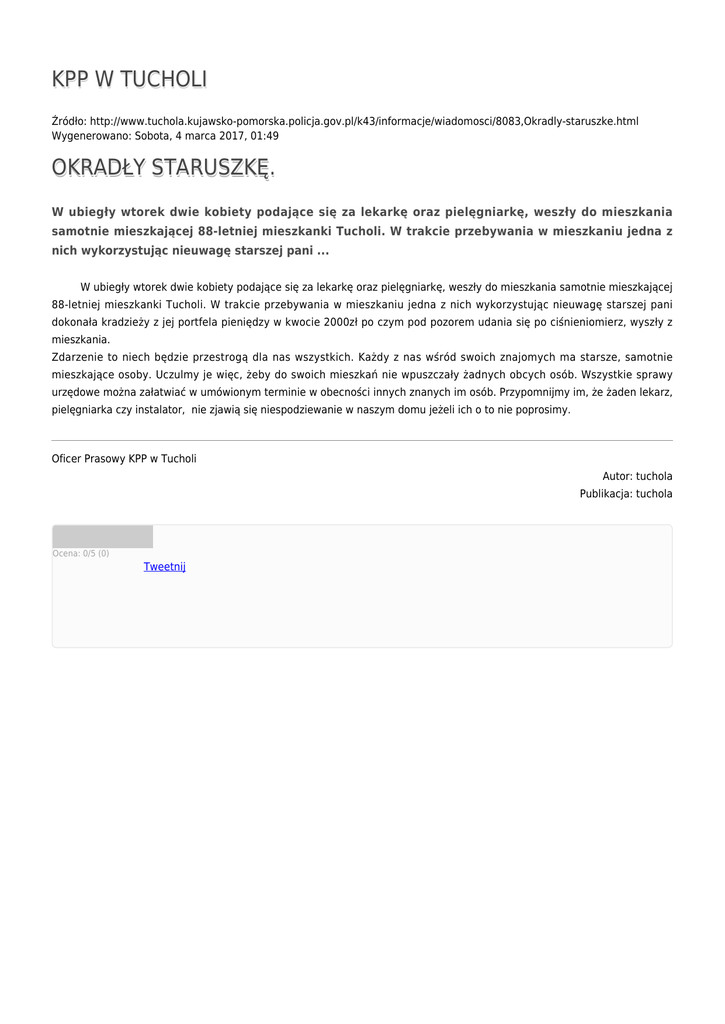 KPP W TUCHOLI Źródło: http://www.tuchola.kujawsko-pomorska.policja.gov.pl/k43/informacje/wiadomosci/8083,Okradly-staruszke.html Wygenerowano: Sobota, 4 marca 2017, 01:49 OKRADŁY STARUSZKĘ. W ubiegły wtorek dwie kobiety podające się za lekarkę oraz pielęgniarkę, weszły do mieszkania samotnie mieszkającej 88-letniej mieszkanki Tucholi. W trakcie przebywania w mieszkaniu jedna z nich wykorzystując nieuwagę starszej pani ... W ubiegły wtorek dwie kobiety podające się za lekarkę oraz pielęgniarkę, weszły do mieszkania samotnie mieszkającej 88-letniej mieszkanki Tucholi. W trakcie przebywania w mieszkaniu jedna z nich wykorzystując nieuwagę starszej pani dokonała kradzieży z jej portfela pieniędzy w kwocie 2000zł po czym pod pozorem udania się po ciśnieniomierz, wyszły z mieszkania. Zdarzenie to niech będzie przestrogą dla nas wszystkich. Każdy z nas wśród swoich znajomych ma starsze, samotnie mieszkające osoby. Uczulmy je więc, żeby do swoich mieszkań nie wpuszczały żadnych obcych osób. Wszystkie sprawy urzędowe można załatwiać w umówionym terminie w obecności innych znanych im osób. Przypomnijmy im, że żaden lekarz, pielęgniarka czy instalator, nie zjawią się niespodziewanie w naszym domu jeżeli ich o to nie poprosimy. Oficer Prasowy KPP w Tucholi Autor: tuchola Publikacja: tuchola Ocena: 0/5 (0) Tweetnij