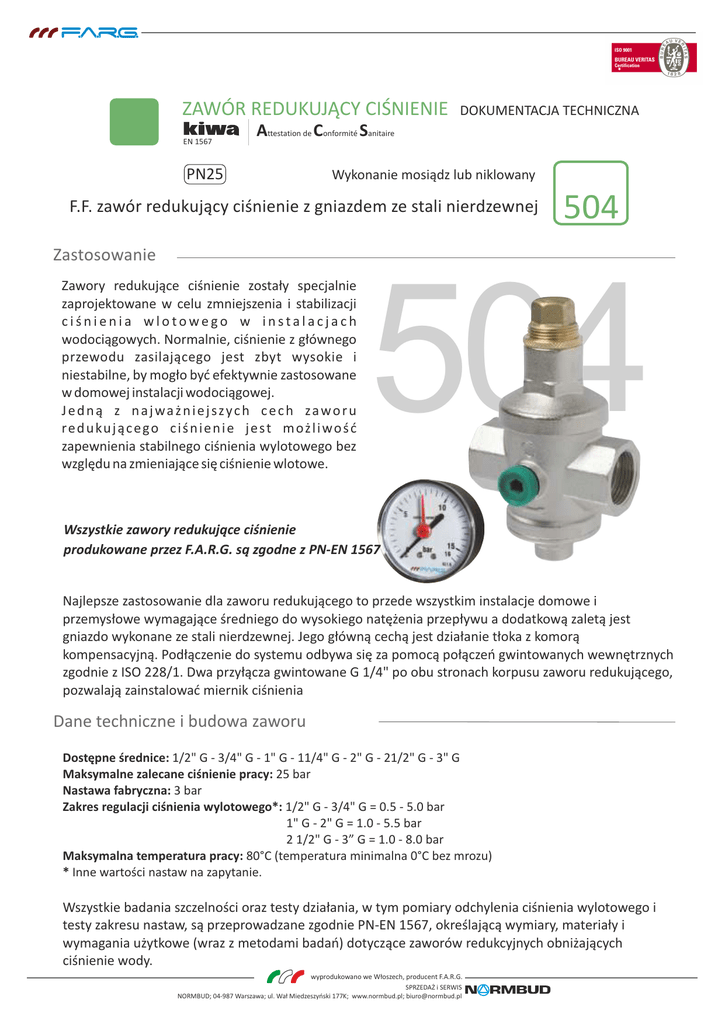 ZAWÓR REDUKUJĄCY CIŚNIENIE EN 1567 DOKUMENTACJA TECHNICZNA Attestation de Conformité Sanitaire PN25 Wykonanie mosiądz lub niklowany F.F. zawór redukujący ciśnienie z gniazdem ze stali nierdzewnej 504 Zastosowanie Zawory redukujące ciśnienie zostały specjalnie zaprojektowane w celu zmniejszenia i stabilizacji ciśnienia wlotowego w instalacjach wodociągowych. Normalnie, ciśnienie z głównego przewodu zasilającego jest zbyt wysokie i niestabilne, by mogło być efektywnie zastosowane w domowej instalacji wodociągowej. J e d n ą z n a j w a ż n i e j s z y c h c e c h za w o r u re d u ku j ą c e go c i ś n i e n i e j e st m oż l i wo ś ć zapewnienia stabilnego ciśnienia wylotowego bez względu na zmieniające się ciśnienie wlotowe. 504 Wszystkie zawory redukujące ciśnienie produkowane przez F.A.R.G. są zgodne z PN-EN 1567 Najlepsze zastosowanie dla zaworu redukującego to przede wszystkim instalacje domowe i przemysłowe wymagające średniego do wysokiego natężenia przepływu a dodatkową zaletą jest gniazdo wykonane ze stali nierdzewnej. Jego główną cechą jest działanie tłoka z komorą kompensacyjną. Podłączenie do systemu odbywa się za pomocą połączeń gwintowanych wewnętrznych zgodnie z ISO 228/1. Dwa przyłącza gwintowane G 1/4" po obu stronach korpusu zaworu redukującego, pozwalają zainstalować miernik ciśnienia Dane techniczne i budowa zaworu Dostępne średnice: 1/2" G - 3/4" G - 1" G - 11/4" G - 2" G - 21/2" G - 3" G Maksymalne zalecane ciśnienie pracy: 25 bar Nastawa fabryczna: 3 bar Zakres regulacji ciśnienia wylotowego*: 1/2" G - 3/4" G = 0.5 - 5.0 bar 1" G - 2" G = 1.0 - 5.5 bar 2 1/2" G - 3” G = 1.0 - 8.0 bar Maksymalna temperatura pracy: 80°C (temperatura minimalna 0°C bez mrozu) * Inne wartości nastaw na zapytanie. Wszystkie badania szczelności oraz testy działania, w tym pomiary odchylenia ciśnienia wylotowego i testy zakresu nastaw, są przeprowadzane zgodnie PN-EN 1567, określającą wymiary, materiały i wymagania użytkowe (wraz z metodami badań) dotyczące zaworów redukcyjnych obniżających ciśnienie wody. wyprodukowano we Włoszech, producent F.A.R.G. SPRZEDAŻ i SERWIS NORMBUD; 04-987 Warszawa; ul. Wał Miedzeszyński 177K; www.normbud.pl; [email protected] LP NAZWA CZĘŚCI MATERIAŁ 1 DOCISK SPRĘŻYNY MOSIĄDZ CW 617N UNI EN 12165 2 NAKRĘTKA BLOKUJĄCA MOSIĄDZ CW 614N UNI EN 12164 3 SPRĘŻYNA STAL C72 DIN 17223-84 4 POKRYWA MOSIĄDZ CW 617N UNI EN 12165 5 DYSK MOSIĄDZ CW 614N UNI EN 12164 6 USZCZELNIENIE O-RING NBR 70 7 ŚRUBA DOCISKAJĄCA O-RING MOSIĄDZ CW 614N UNI EN 12164 8 USZCELNIENIE O-RING NBR 70 9 KORPUS MOSIĄDZ CW 617N UNI EN 12165* 10 TRZPIEŃ MOSIĄDZ CW 614N UNI EN 12164** 11 GNIAZDO ZAWORU STAL NIERDZEWNA AISI 304 12 USZCZELKA NBR 70 13 USZCELNIENIE O-RING NBR 70 14 ZAWÓR MOSIĄDZ CW 614N UNI EN 12164 15 USZCELNIENIE O-RING NBR 70 16 DOLNA POKRYWA MOSIĄDZ CW 617N UNI EN 12165 * dla 2 ½” – 3”: MOSIĄDZ CB753S UNI EN 1982 ** od 1 ¼” do 3”: STAL AISI 304 Wymiary B B C C A A WYMIAR A B C 15 70 68 128 ¾” G 20 74 68 128 1” G 25 90 80 160 1 ¼” G 32 120 95 215 1 ½” G 40 120 95 215 2” G 50 120 95 240 2 ½” G 65 150 110 250 3” G 80 160 115 250 GWINT DN ½” G Działanie Działanie zaworów redukujących ciśnienie opiera się na zestawieniu dwóch przeciwstawnych sił, które oddziałują na siebie. Siła wywierana przez ciśnienie wody, która dąży do zatrzymania przepływu wody przez zawór w położeniu zamkniętym i przeciwstawna siła wywierana przez sprężynę, która dąży do otwarcia przepływu wody. Te dwie siły oddziałują na siebie wzajemnie a dzięki systemowi sprężyny o zmiennej komepnsacji, zaprojektowanej by wyrównywać zmianę ciśnienia wlotowego, ciśnienie wylotowe utrzymywane jest na stałym poziomie pomimo zmieniającego się ciśnienia wlotowego. wyprodukowano we Włoszech, producent F.A.R.G. SPRZEDAŻ i SERWIS NORMBUD; 04-987 Warszawa; ul. Wał Miedzeszyński 177K; www.normbud.pl; [email protected] Wykres straty ciśnienia Opór hydrauliczny jest stratą ciśnienia wynikającą z połączenia sił biernych (stan instalacji, różnice wysokości, załamania i rozgałęzienia instalacji, itp.), które przeciwdziałają swobodnemu przepływowi wody wewnątrz rurociągu. Ze względu na swoją budowę podlegają im również zawory redukcyjne. UWAGA: W celu zapewnienia właściwego rozmiaru, straty ciśnienia w części instalacji za zaworem redukcyjnym, również powinny być uwzględnione. 10 Strata ciśnienia [bar] 1/2" 3/4" 1" 1"1/4 1"1/2 2" 2"1/2 3" 1 0,1 0,1 1 10 100 Natężenie przepływu [l/min] 1000 Montaż 1. Przed zamontowaniem zaworu redukcyjnego, otworzyć wszystkie zawory wody, aby przepłukać instalację i opróżnić z powietrza, które może być uwięzione w rurach. 2. Zainstalować zawory odcinające przed i za zaworem redukcyjnym w celu ułatwienia czynności konserwacyjnych. 3. Zawór redukcyjny zamontować zgodnie z kierunkiem strzałki, umieszczonej na korpusie zaworu (może być zainstalowany poziomo lub pionowo, ale nie odwrócony do dołu). 4. Zamknąć zawór odcinający po stronie dolotowej i ustawić wartość ciśnienia wylotowego działając na trzpień sprężyny: wkręcając (obrót w prawo), aby zwiększyć ciśnienie i odkręając (obrót w lewo), aby zmniejszyć ciśnienie. 5. Wartość ciśnienia można obserwować na manometrze. UWAGA: Wszystkie zawory redukcyjne mają fabrycznie ustawione ciśnienie 3 bary. wyprodukowano we Włoszech, producent F.A.R.G. SPRZEDAŻ i SERWIS NORMBUD; 04-987 Warszawa; ul. Wał Miedzeszyński 177K; www.normbud.pl; [email protected] Wskazówki instalacyjne Ogrzewacz CALDAIA Schemat instalacji zawór odcinający zawór zwrotny tłumik uderzeń hydraulicznych lub naczynie wzbiorcze 10 5 10 5 15 0 15 0 bar bar MADE IN UWAGA: Bardzo ważny jest montaż filtra na wlocie zaworu redukcyjnego, ponieważ najmniejsze zanieczyszczenie może wpływać prawidłowe działanie. 