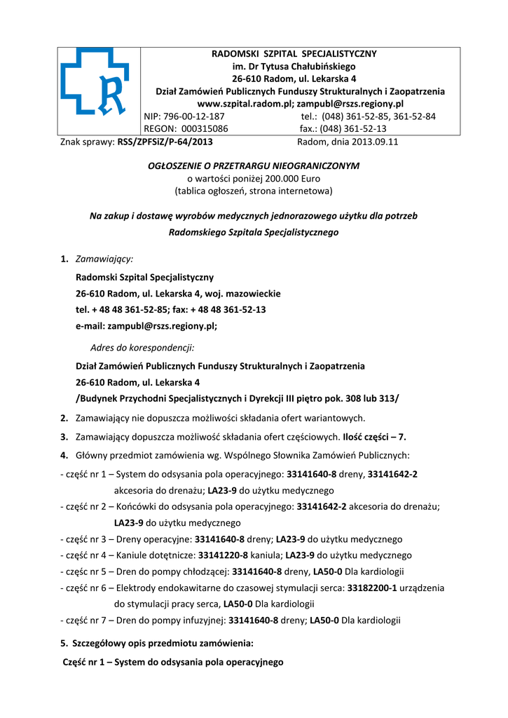 RADOMSKI SZPITAL SPECJALISTYCZNY im. Dr Tytusa Chałubińskiego 26-610 Radom, ul. Lekarska 4 Dział Zamówień Publicznych Funduszy Strukturalnych i Zaopatrzenia www.szpital.radom.pl; [email protected] NIP: 796-00-12-187 tel.: (048) 361-52-85, 361-52-84 REGON: 000315086 fax.: (048) 361-52-13 Znak sprawy: RSS/ZPFSiZ/P-64/2013 Radom, dnia 2013.09.11 OGŁOSZENIE O PRZETRARGU NIEOGRANICZONYM o wartości poniżej 200.000 Euro (tablica ogłoszeń, strona internetowa) Na zakup i dostawę wyrobów medycznych jednorazowego użytku dla potrzeb Radomskiego Szpitala Specjalistycznego 1. Zamawiający: Radomski Szpital Specjalistyczny 26-610 Radom, ul. Lekarska 4, woj. mazowieckie tel. + 48 48 361-52-85; fax: + 48 48 361-52-13 e-mail: [email protected]; Adres do korespondencji: Dział Zamówień Publicznych Funduszy Strukturalnych i Zaopatrzenia 26-610 Radom, ul. Lekarska 4 /Budynek Przychodni Specjalistycznych i Dyrekcji III piętro pok. 308 lub 313/ 2. Zamawiający nie dopuszcza możliwości składania ofert wariantowych. 3. Zamawiający dopuszcza możliwość składania ofert częściowych. Ilość części – 7. 4. Główny przedmiot zamówienia wg. Wspólnego Słownika Zamówień Publicznych: - część nr 1 – System do odsysania pola operacyjnego: 33141640-8 dreny, 33141642-2 akcesoria do drenażu; LA23-9 do użytku medycznego - część nr 2 – Końcówki do odsysania pola operacyjnego: 33141642-2 akcesoria do drenażu; LA23-9 do użytku medycznego - część nr 3 – Dreny operacyjne: 33141640-8 dreny; LA23-9 do użytku medycznego - część nr 4 – Kaniule dotętnicze: 33141220-8 kaniula; LA23-9 do użytku medycznego - częśc nr 5 – Dren do pompy chłodzącej: 33141640-8 dreny, LA50-0 Dla kardiologii - część nr 6 – Elektrody endokawitarne do czasowej stymulacji serca: 33182200-1 urządzenia do stymulacji pracy serca, LA50-0 Dla kardiologii - część nr 7 – Dren do pompy infuzyjnej: 33141640-8 dreny; LA50-0 Dla kardiologii 5. Szczegółowy opis przedmiotu zamówienia: Część nr 1 – System do odsysania pola operacyjnego Lp. Nazwa asortymentu 1. 2. 1. Dren medyczny o stałym przekroju, średnica wewnętrzna 6mm, długość 50m, powierzchnia wewnętrzna i zewnętrzna gładka, produkt niesterylny z możliwością wysterylizowania tlenkiem etylenu lub promieniami gamma, dreny zachowujące drożność przy podciśnieniu 560mmHg 2. Dren do ssaka o średnicy wewnętrznej 6mm, długość 200 cm, zachowujące drożność przy podciśnieniu 560mmHg, posiadające elastyczne doklejane końcówki na zakończeniu drenu z wewnętrznymi pierścieniami uszczelniającymi, sterylny 3. Dren do ssaka o średnicy wewnętrznej 6mm, długość 300 cm, zachowujące drożność przy podciśnieniu 560mmHg, posiadające elastyczne doklejane końcówki na zakończeniu drenu z wewnętrznymi pierścieniami uszczelniającymi, sterylny 4. Wkład jednorazowy 2000ml – wyposażony w port ortopedyczny 7,2/12mm, dający jednocześnie możliwość odsysania standardowego (w komplecie schodkowy łącznik kątowy umożliwiający podłączenie drenów o różnych średnicach). Uszczelniany automatycznie po uruchomieniu ssania bez konieczności wciskania wkładu na kanister, wymiana wkładu bez odłączania drenu łączącego kanister ze źródłem ssania, wyposażony w uchwyt do wygodnego demontażu, posiadający skuteczny filtr przeciwbakteryjny i zastawkę zabezpieczającą źródło ssania przed zalaniem, szeroki port na pokrywie o średnicy 2,5 cm do napełniania proszkiem żelującym, w komplecie zintegrowana z pokrywą zatyczka do zamknięcia portu po zakończeniu ssania, wkłady bez zawartości PCV 5. Wkład jednorazowy 3000ml z napyloną wewnątrz substancją żelującą – wyposażony w port 7,2/12mm, dający jednocześnie możliwość odsysania standardowego oraz ortopedycznego (w komplecie pięciostopniowy obrotowy łącznik kątowy umożliwiający podłączenie drenów o różnych średnicach). Uszczelniany automatycznie po uruchomieniu ssania bez konieczności wciskania wkładu na kanister, wymiana wkładu bez odłączania drenu łączącego kanister ze źródłem ssania, wyposażony w uchwyt do wygodnego demontażu, posiadający skuteczny filtr przeciwbakteryjny i zastawkę zabezpieczającą źródło ssania przed zalaniem, szeroki port na pokrywie o średnicy 2,5 cm do napełniania proszkiem żelującym, w komplecie zintegrowana z pokrywą zatyczka do zamknięcia portu po zakończeniu ssania, wkłady bez zawartości PCV 6. Pojemnik wielorazowy z uchwytem do mocowania o pojemności 2000ml – przeźroczysty, wyskalowany w ml, wyposażony w zintegrowany zaczep 30mm do mocowania na standardowych wieszakach do szyn Modura, wyposażony w zintegrowany wymienny króciec do połączenia ze źródłem ssania nie wymagający odłączania drenu ssącego od kanistra lub pokrywy wkładu przy jego wymianie, odporny na mycie w temp. 85° C i sterylizację w autoklawie 121° 7. Uniwersalny wieszak na szynę plastikowy automatyczny z mechanizmem sprężynowym pozwalającym na szybki montaż na szynach o różnej wysokości i grubości, kompatybilny ze zintegrowanym 30mm zaczepem kanistrów 8. Zawór zamykający próżnię – umożliwiający szybkie odcięcie próżni, posiadający króciec 14,2 mm kompatybilny z gniazdem kanistra, wymienny, obrotowy umożliwiający skierowanie króćca w dowolną stronę, odporny na mycie w temp. 85°C, wielokrotnego użytku 9. Filtr antybakteryjny do ssaków operacyjnych, autoklawowalny z wkładami jednorazowymi Zapotrzebowanie na okres 2 lat / ilość szt. 3. 96 1200 8600 15100 400 68 80 40 200 Część nr 2 – Końcówki do odsysania pola operacyjnego Lp. Nazwa asortymentu 1. 1. 2. Kanki - końcówki do odsysania pola operacyjnego, jałowe nietoksyczne dł. 25 cm, bez regulatora, z czterema otworami bocznymi na końcu kanki a) standardowa b) z kulką Zapotrzebowanie na okres 2 lat / ilość szt. 3. 10400 600 Część nr 3 - Dreny operacyjne Lp. Nazwa asortymentu 1. 1. 2. Dren 