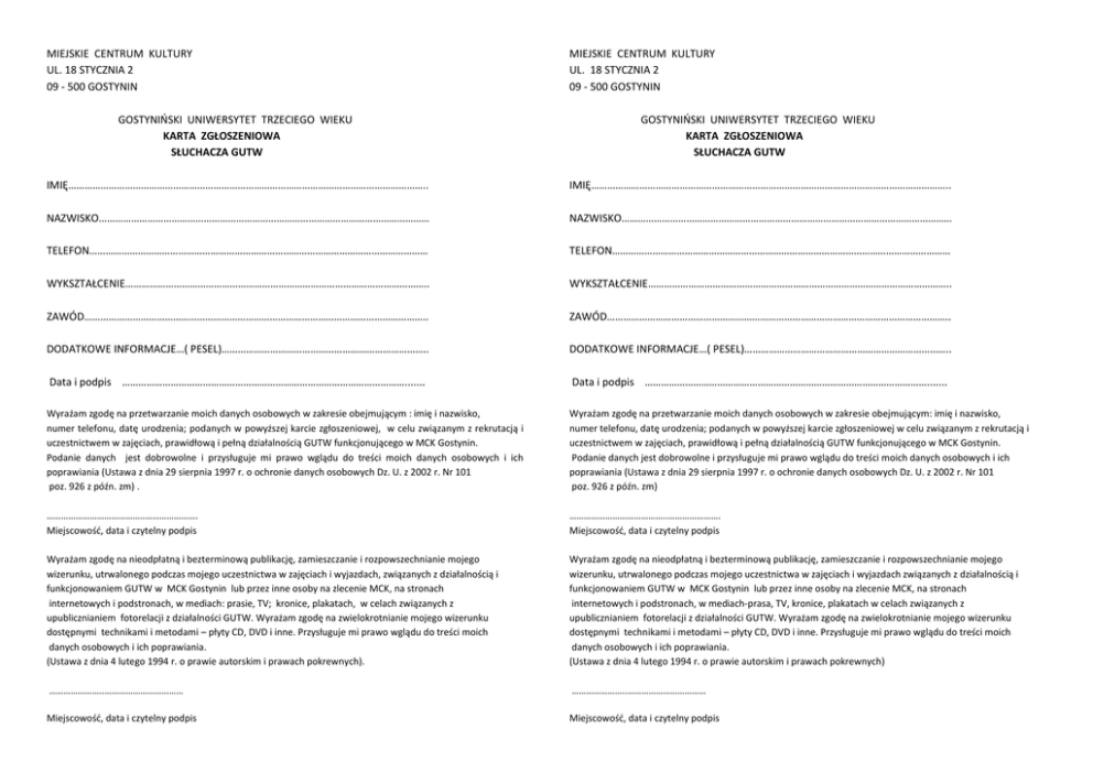MIEJSKIE CENTRUM KULTURY UL. 18 STYCZNIA 2 09 - 500 GOSTYNIN MIEJSKIE CENTRUM KULTURY UL. 18 STYCZNIA 2 09 - 500 GOSTYNIN GOSTYNIŃSKI UNIWERSYTET TRZECIEGO WIEKU KARTA ZGŁOSZENIOWA SŁUCHACZA GUTW GOSTYNIŃSKI UNIWERSYTET TRZECIEGO WIEKU KARTA ZGŁOSZENIOWA SŁUCHACZA GUTW IMIĘ…………………………………………………………………………………………………………………….. IMIĘ…………………………………………………………………………………………………………………….. NAZWISKO…………………………………………………………………………………………………………… NAZWISKO…………………………………………………………………………………………………………… TELEFON……………………………………………………………………………………………………………… TELEFON……………………………………………………………………………………………………………… WYKSZTAŁCENIE………………………………………………………………………………………………….. WYKSZTAŁCENIE………………………………………………………………………………………………….. ZAWÓD……………………………………………………………………………………………………………….. ZAWÓD……………………………………………………………………………………………………………….. DODATKOWE INFORMACJE…( PESEL)………………………………………………………………….. DODATKOWE INFORMACJE…( PESEL)………………………………………………………………….. Data i podpis ……………………………………………………………………………………………....... Data i podpis ……………………………………………………………………………………………....... Wyrażam zgodę na przetwarzanie moich danych osobowych w zakresie obejmującym : imię i nazwisko, numer telefonu, datę urodzenia; podanych w powyższej karcie zgłoszeniowej, w celu związanym z rekrutacją i uczestnictwem w zajęciach, prawidłową i pełną działalnością GUTW funkcjonującego w MCK Gostynin. Podanie danych jest dobrowolne i przysługuje mi prawo wglądu do treści moich danych osobowych i ich poprawiania (Ustawa z dnia 29 sierpnia 1997 r. o ochronie danych osobowych Dz. U. z 2002 r. Nr 101 poz. 926 z późn. zm) . Wyrażam zgodę na przetwarzanie moich danych osobowych w zakresie obejmującym: imię i nazwisko, numer telefonu, datę urodzenia; podanych w powyższej karcie zgłoszeniowej w celu związanym z rekrutacją i uczestnictwem w zajęciach, prawidłową i pełną działalnością GUTW funkcjonującego w MCK Gostynin. Podanie danych jest dobrowolne i przysługuje mi prawo wglądu do treści moich danych osobowych i ich poprawiania (Ustawa z dnia 29 sierpnia 1997 r. o ochronie danych osobowych Dz. U. z 2002 r. Nr 101 poz. 926 z późn. zm) …………………………………..…………………. Miejscowość, data i czytelny podpis …………………………………..…………………. Miejscowość, data i czytelny podpis Wyrażam zgodę na nieodpłatną i bezterminową publikację, zamieszczanie i rozpowszechnianie mojego wizerunku, utrwalonego podczas mojego uczestnictwa w zajęciach i wyjazdach, związanych z działalnością i funkcjonowaniem GUTW w MCK Gostynin lub przez inne osoby na zlecenie MCK, na stronach internetowych i podstronach, w mediach: prasie, TV; kronice, plakatach, w celach związanych z upublicznianiem fotorelacji z działalności GUTW. Wyrażam zgodę na zwielokrotnianie mojego wizerunku dostępnymi technikami i metodami – płyty CD, DVD i inne. Przysługuje mi prawo wglądu do treści moich danych osobowych i ich poprawiania. (Ustawa z dnia 4 lutego 1994 r. o prawie autorskim i prawach pokrewnych). Wyrażam zgodę na nieodpłatną i bezterminową publikację, zamieszczanie i rozpowszechnianie mojego wizerunku, utrwalonego podczas mojego uczestnictwa w zajęciach i wyjazdach związanych z działalnością i funkcjonowaniem GUTW w MCK Gostynin lub przez inne osoby na zlecenie MCK, na stronach internetowych i podstronach, w mediach-prasa, TV, kronice, plakatach w celach związanych z upublicznianiem fotorelacji z działalności GUTW. Wyrażam zgodę na zwielokrotnianie mojego wizerunku dostępnymi technikami i metodami – płyty CD, DVD i inne. Przysługuje mi prawo wglądu do treści moich danych osobowych i ich poprawiania. (Ustawa z dnia 4 lutego 1994 r. o prawie autorskim i prawach pokrewnych) …………………..…………………………… …………………..…………………………… Miejscowość, data i czytelny podpis Miejscowość, data i czytelny podpis